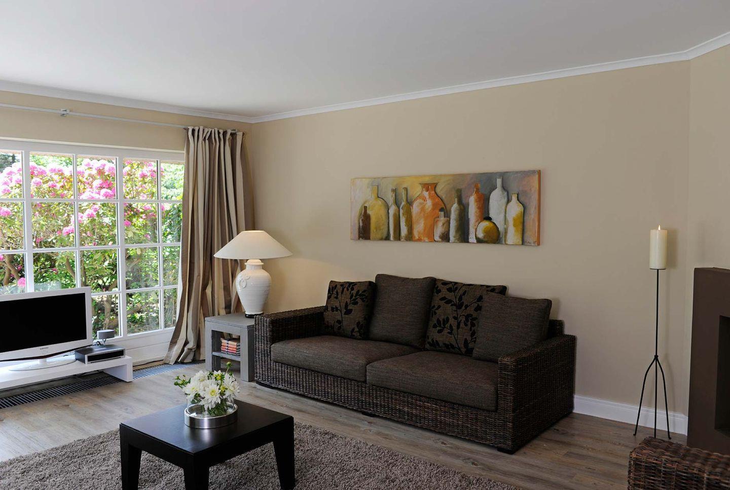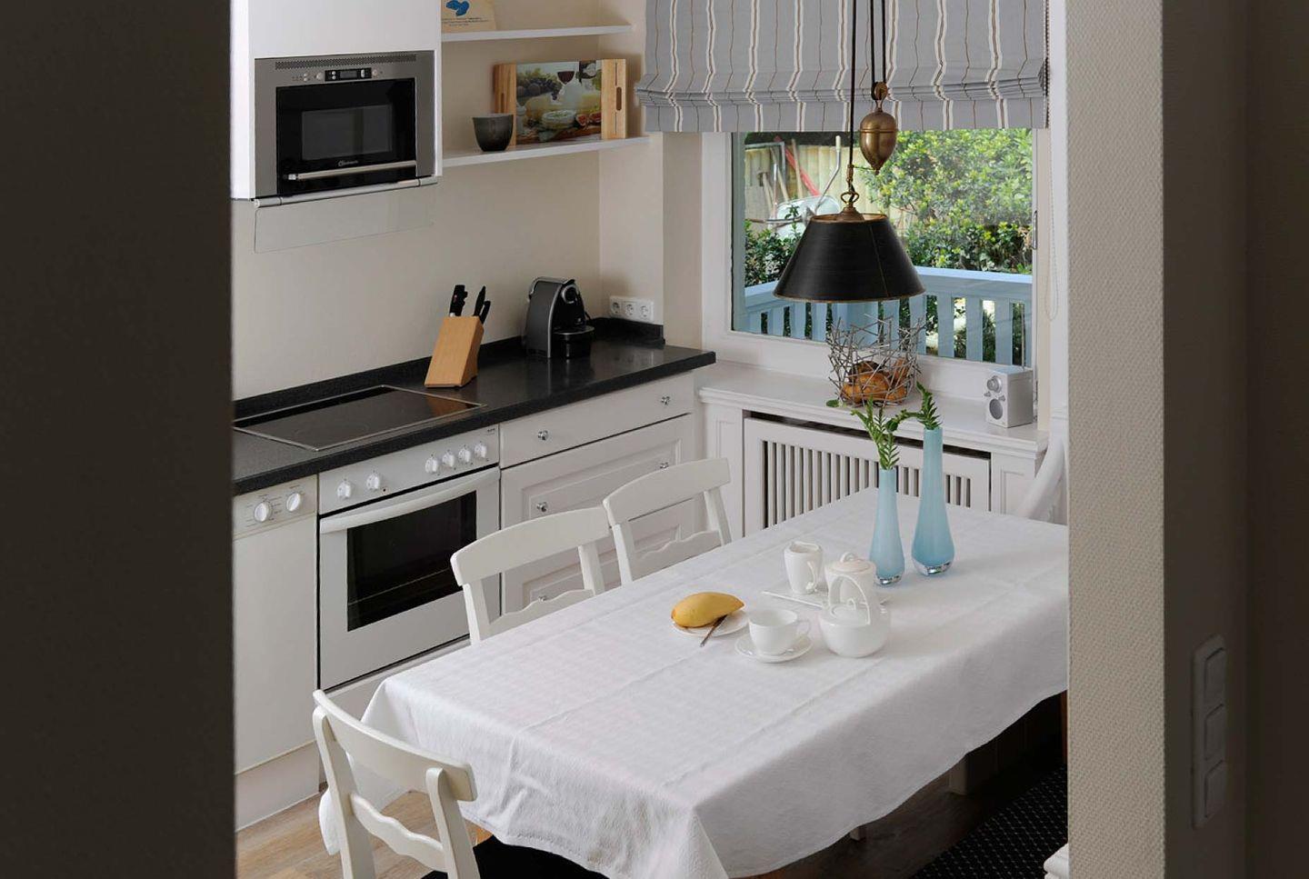 Erdgeschoss: Flur, Gäste-WC, komplett eingerichtete separate Küche mit Nesspresso- und Filterkaffeemaschine und Essecke, Wohnzimmer mit Gaskamin und TV, großzügiger, eingewachsener Garten, Ost-Terrasse mit Gartenmöbeln und Strandkorb