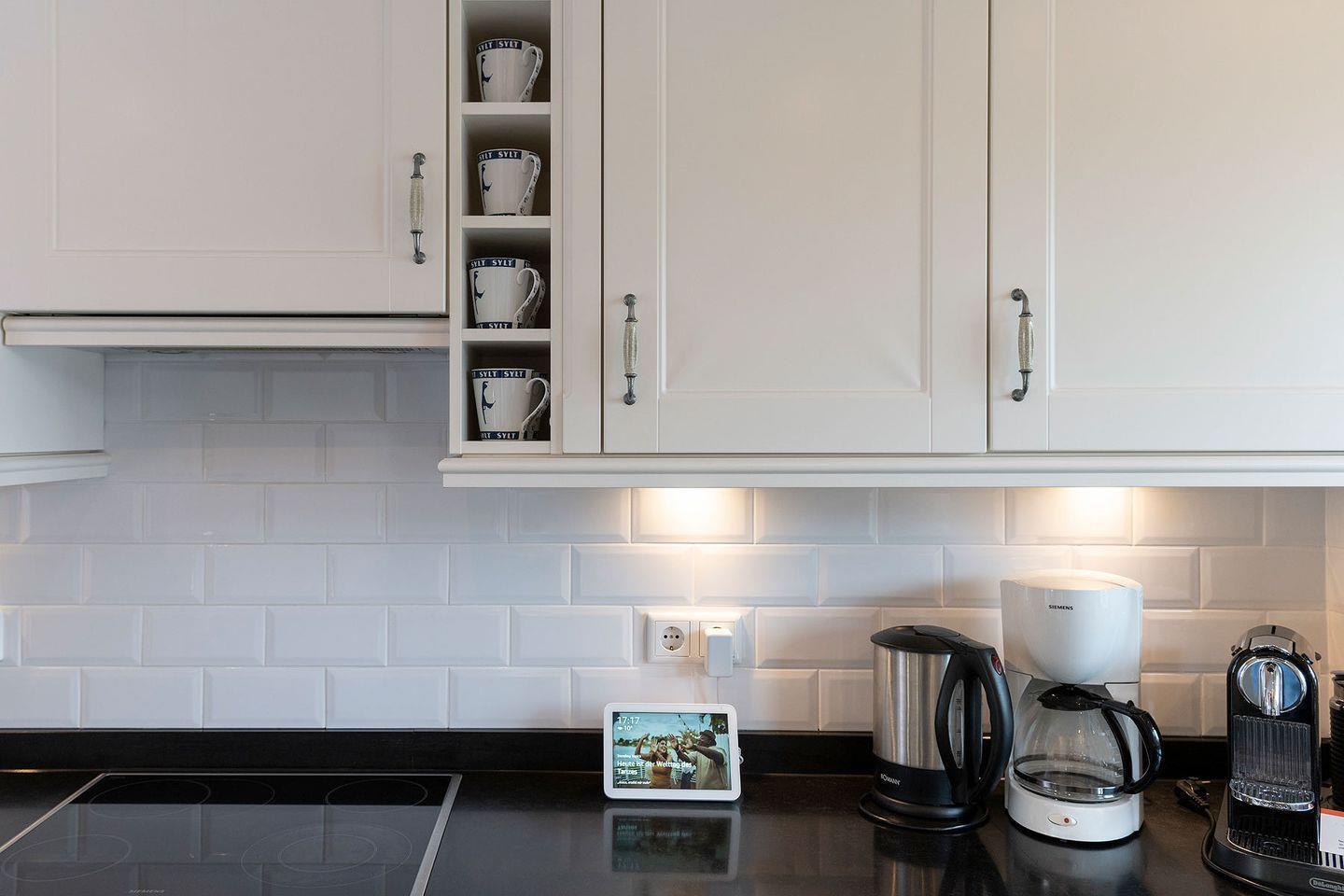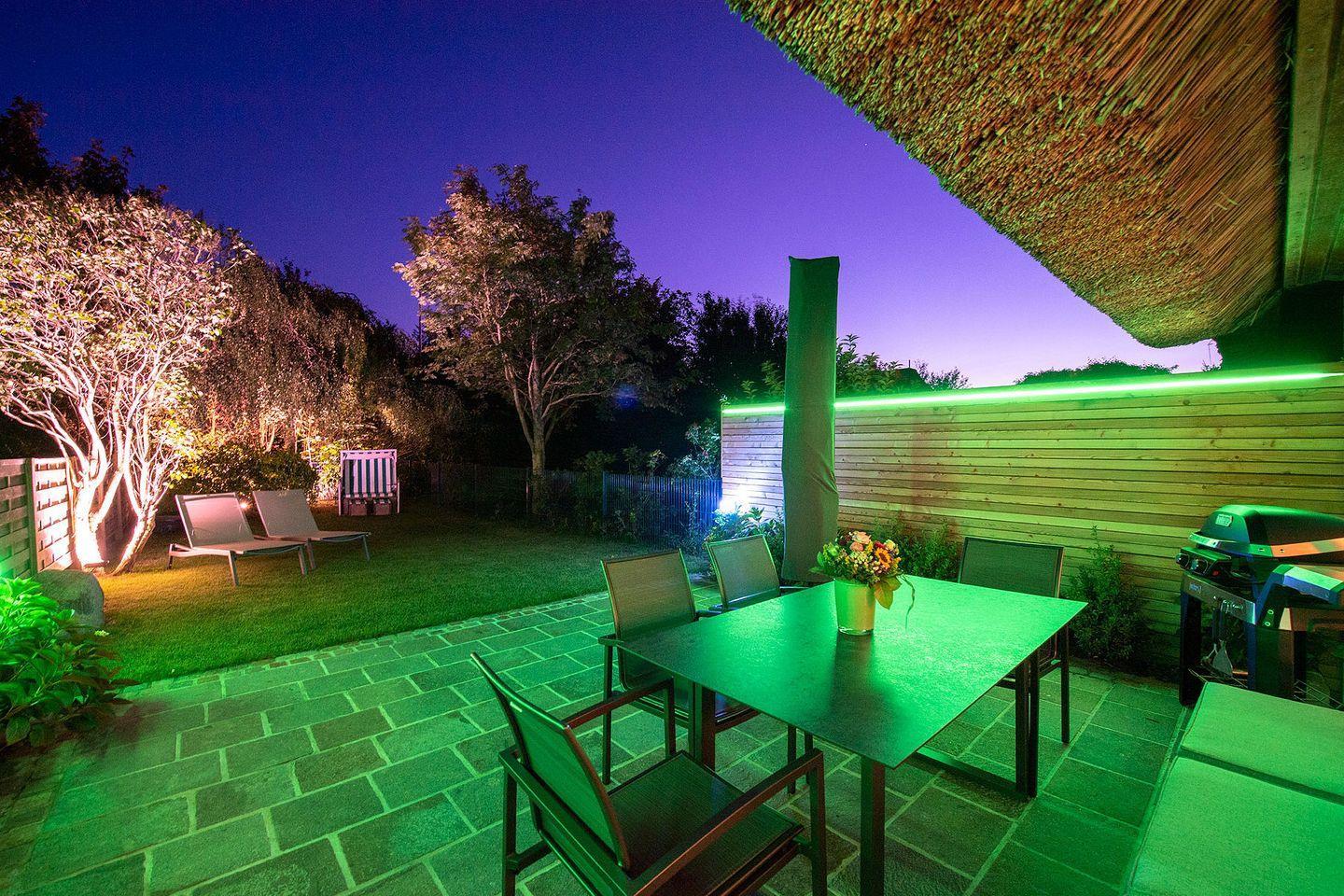 Die sehr umfangreich ausgestattete Ku¨che lässt keine Wu¨nsche offen, sodass gerne aufwendig gekocht und gegrillt werden kann. Der Frenchdoor-Ku¨hlschrank mit Eiswu¨rfel- und Frischwasser-Funktion sorgt dafu¨r, dass auch die Getränke die perfekte Temperatur haben. Ein großer massiver Holzesstisch lädt im maritim anmutenden Ambiente des Wohn- und Esszimmers zu geselliger Tafelrunde ein. Das Ferien Haus wartet mit allerlei technischen Besonderheiten auf. Das Philips Hue Lichtsystem, das u¨ber das hauseigene iPad steuerbar ist, beleuchtet in frei wählbaren Lichtfarben die Terrasse und Bäume im Garten und zaubert eine angenehme Atmosphäre. Fu¨r gute mediale Unterhaltung sorgt das Apple TV mit Sky und Bundesliga, Amazon-Prime und Netflix. Sonos Boxen im Wohn-Essbereich und auf der Terrasse bieten eine hohe Klangqualität und nahezu alle verfu¨gbaren Songs per Streaming fu¨r Musikliebhaber. Das ideale Domizil fu¨r alle Technikfans.