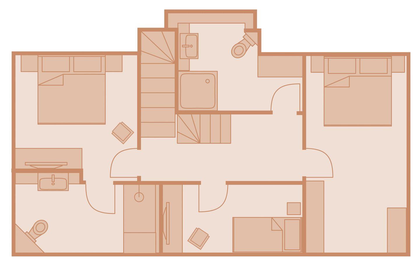 Obergeschoss: 1 Doppelzimmer mit TV und ensuite Badezimmer mit Dusche und WC, 1 Doppelzimmer mit TV, 1 Schlafzimmer mit Bett 120 cm breit und TV, 1 Badezimmer mit Dusche, WC, Waschmaschine und Trockner