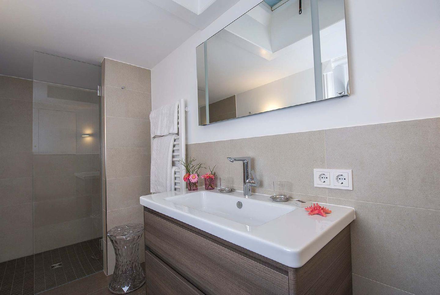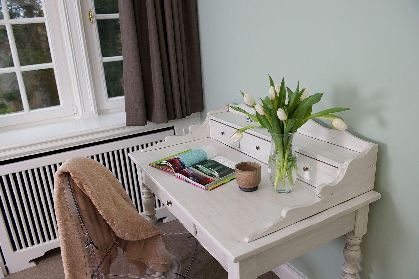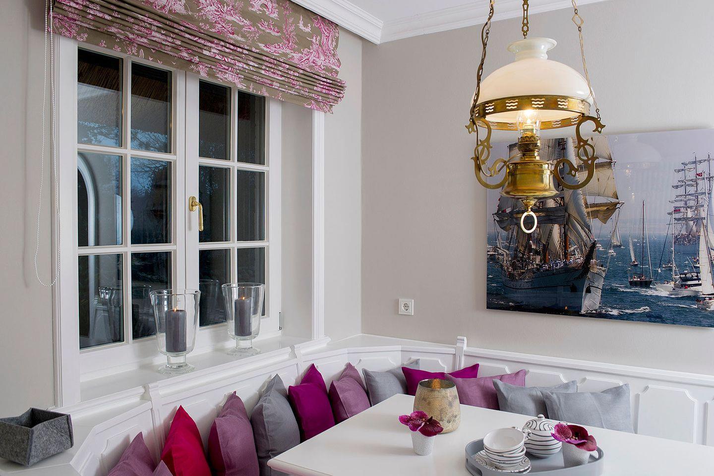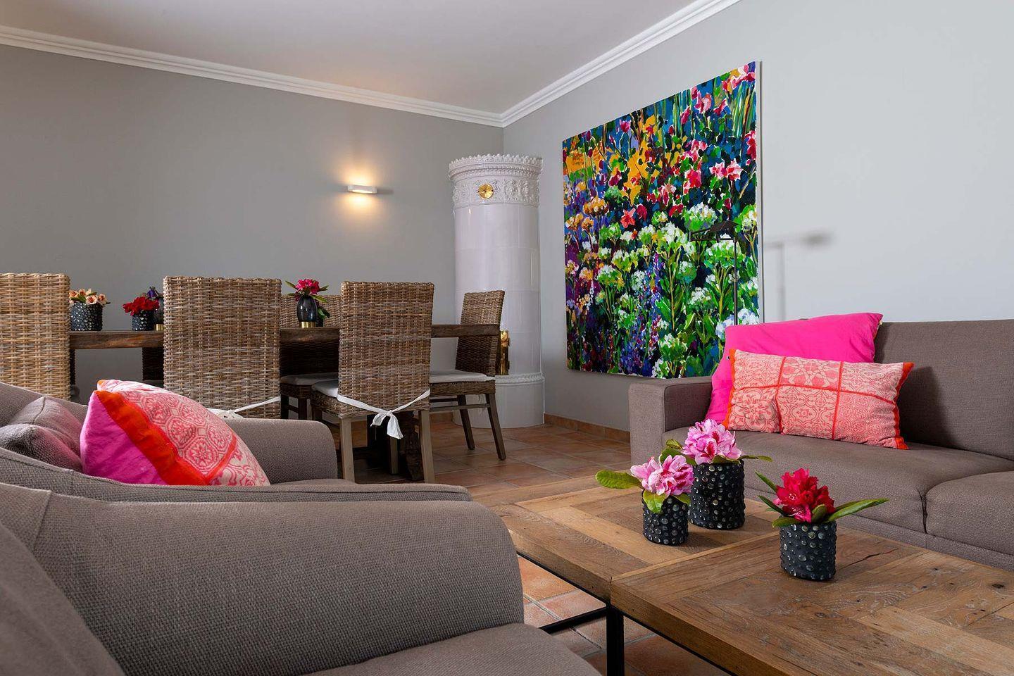 Das exklusive 5-Sterne Ferien Domizil ist ein großzügiger Ort. Auf 125 m² verteilt auf drei Ebenen, bietet es für maximal sechs Personen viele Möglichkeiten, sich zu versammeln, gemeinsam zu essen, ausgiebige Gespräche am langen Esstisch zu führen oder sich einfach nur zurück zu ziehen. Von klarer Hand und mit einer Vorliebe für warme und leuchtende Farben, wurde das Domizil im Winter 2014 neu konzipiert und ausgestattet. Während die Räume des Obergeschosses und des Spitzgiebels mit ihren pastelligen Tönen ein angenehmes und ausgleichendes Wohnklima vermitteln, wirken die warmen Rot- und Violetttöne des Erdgeschosses belebend auf seine Bewohner. Das helle Wohnzimmer mit seinem großen Essplatz und gemütlichen Loungebereich spiegelt den Anspruch zeitgemäßen Wohnens. Warme Rottöne werden hier kombiniert mit Erdfarben und Naturtönen. Im Eingangsbereich, zwischen Küche und Wohnzimmer, findet sich ein weiterer großer Tisch mit umlaufender Sitzbank. Dieser Platz ist bereits avanciert zum Lieblingsplatz der jüngsten Bewohner, denn hier hat man alles im Blick. Die große Terrasse erweitert den Wohnbereich zu den Sonnenplätzen im Garten. Schöne Gartenmöbel laden zum Entspannen und Wohlfühlen im eingewachsenen Garten ein.