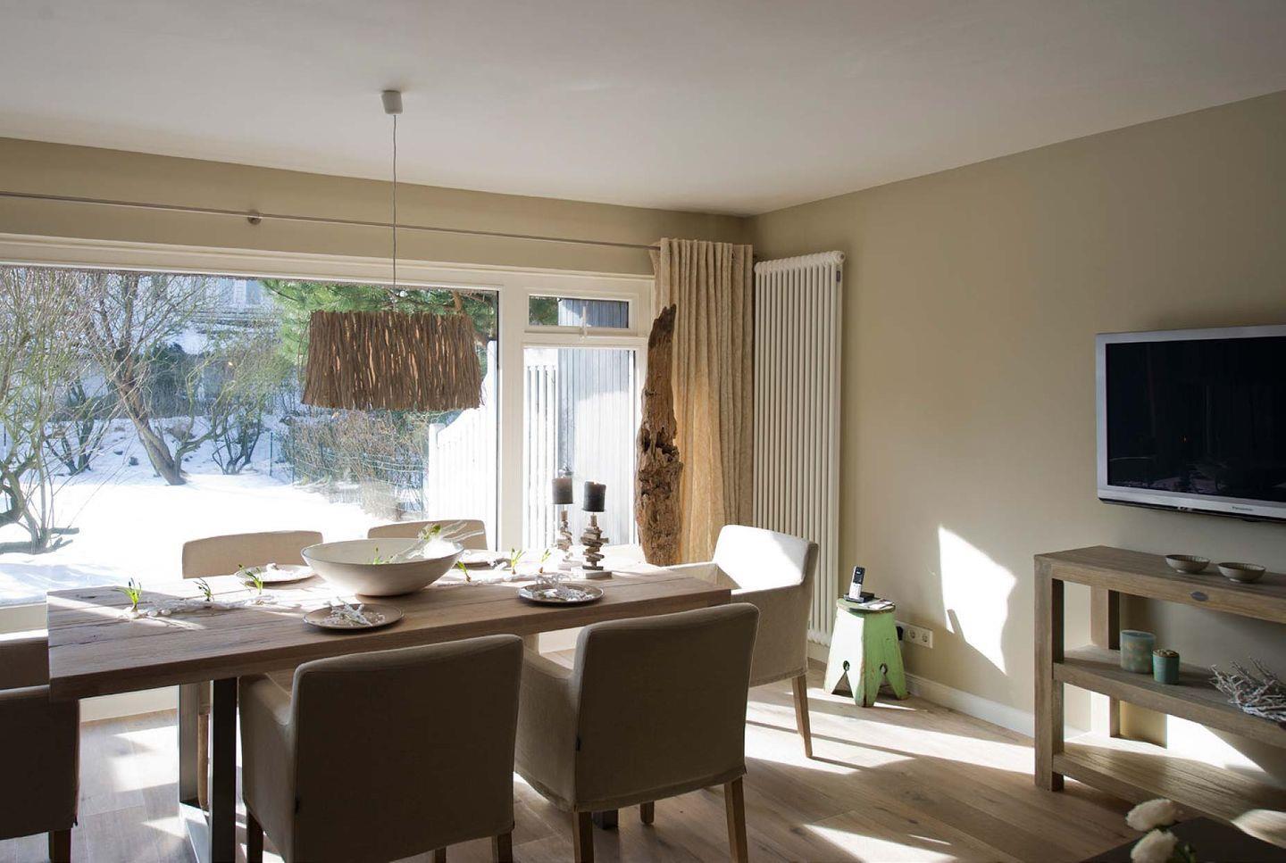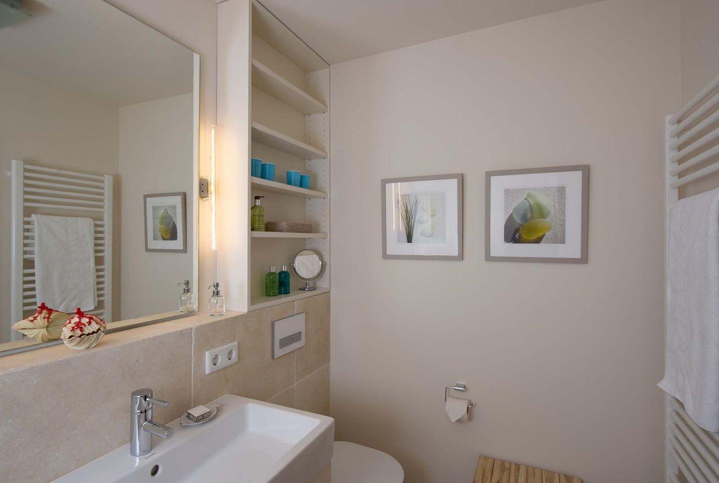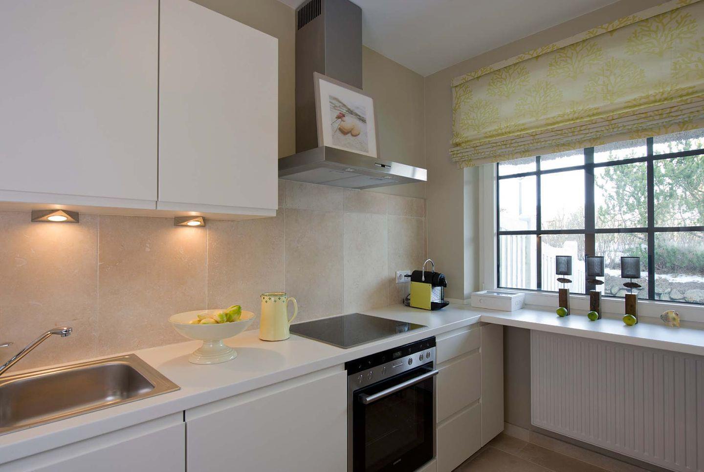 Erdgeschoss: Flur, Badezimmer mit Dusche und WC, komplett eingerichtete, separate Küche mit Nespresso-Maschine, Waschmaschine und Trockner, Wohnzimmer mit Esstisch und TV, eingewachsener, ruhiger Garten, Südost-Terrasse mit Gartenmöbeln und Strandkorb