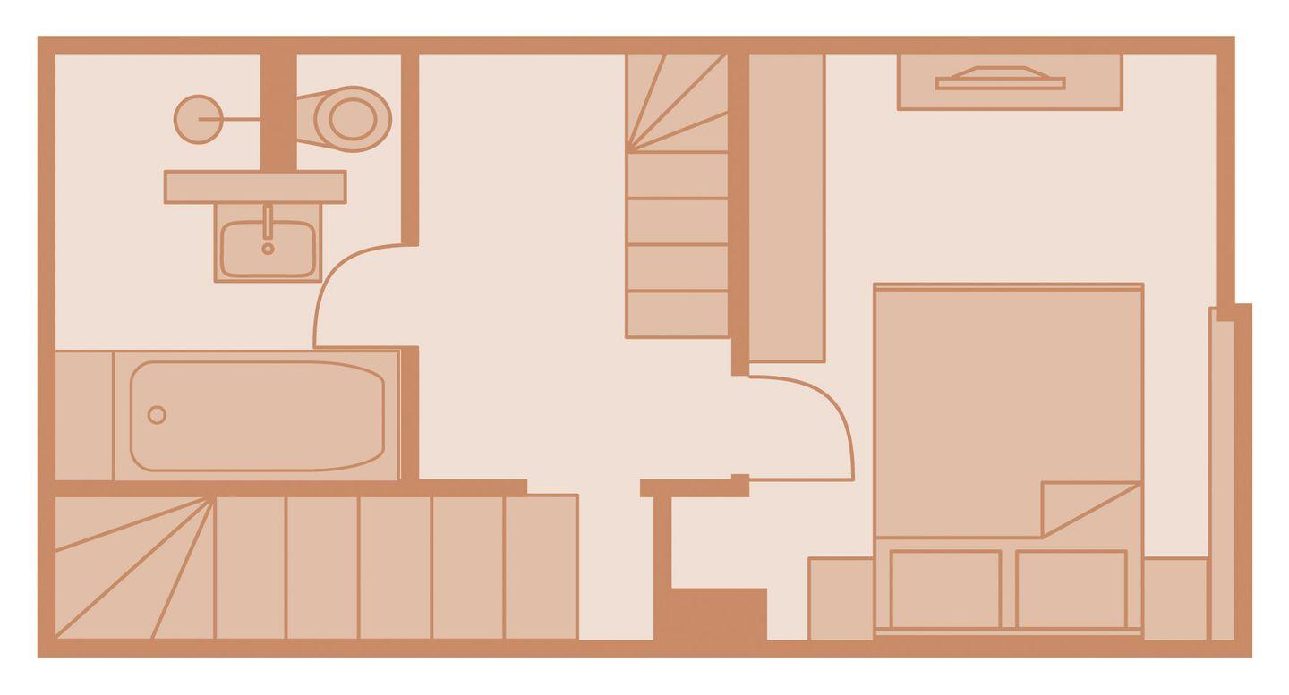 Obergeschoss: 1 Doppelzimmer mit TV, 1 Badezimmer mit Badewanne, Dusche und WC