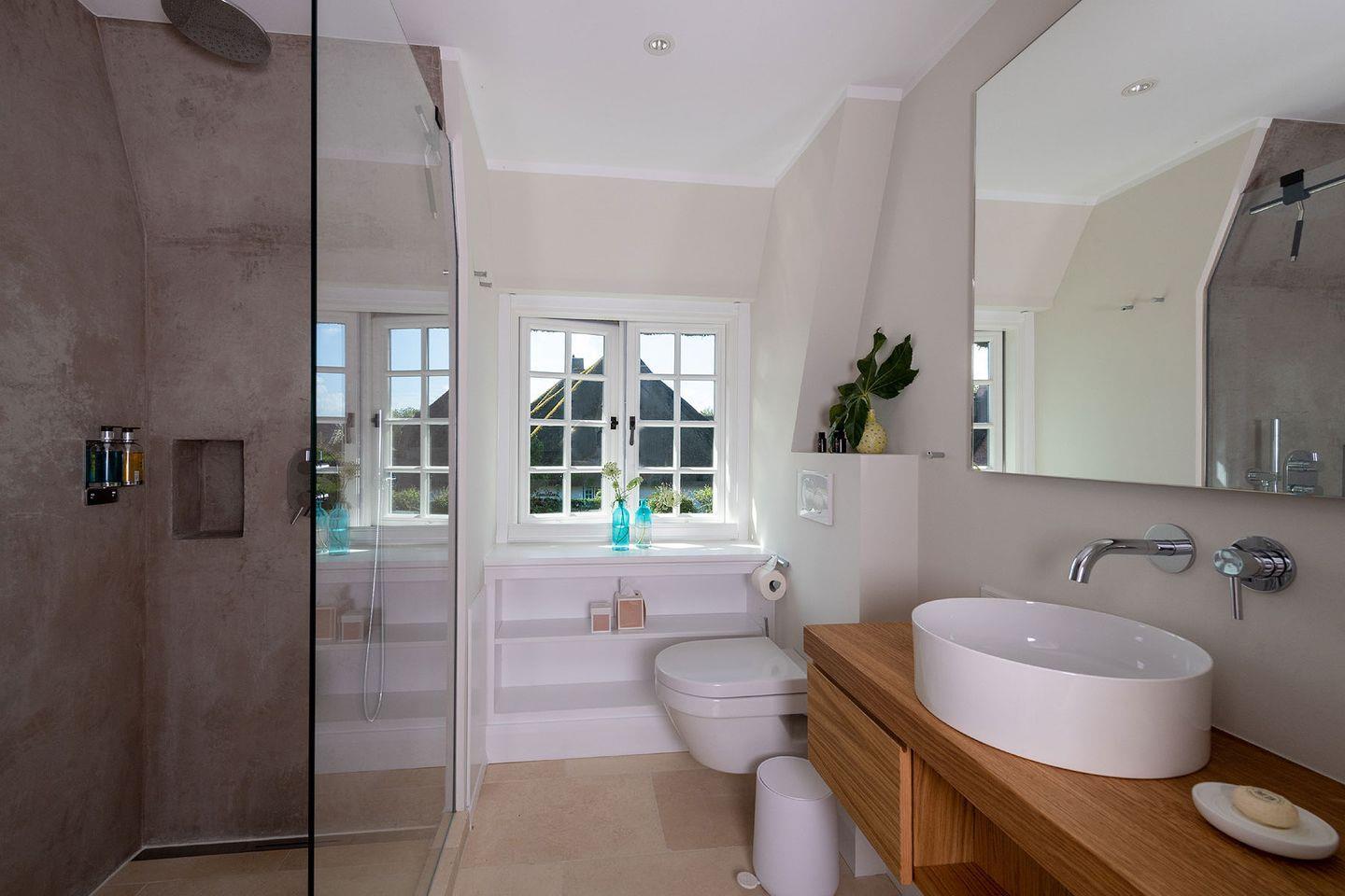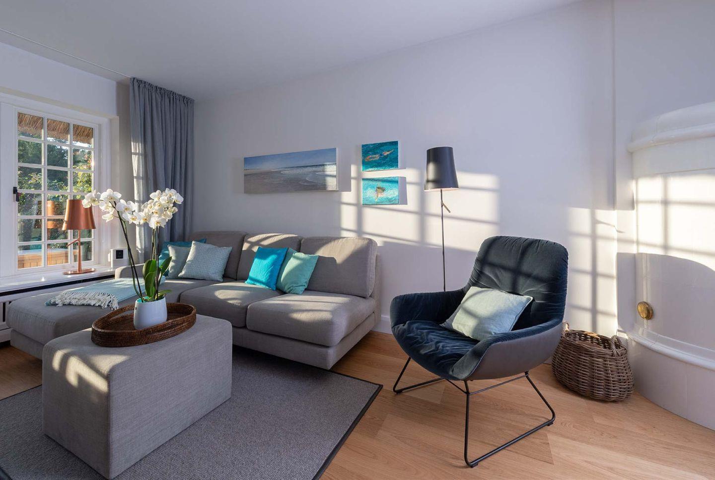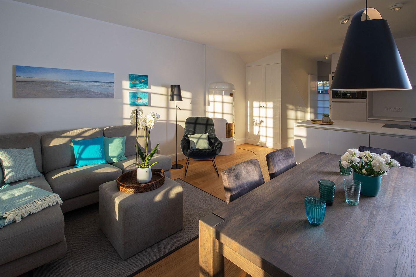 Das exklusive 5-Sterne Ferien Domizil im Westerhörn 16 in Keitum wurde im Sommer 2019 vollständig und hochwertig renoviert und gehört seitdem zum Portfolio des Benen-Diken-Hofs. Es bietet anspruchsvolle Wohnkultur kombiniert mit modernem Badambiente. Vier Personen finden auf drei Ebenen und 105 m² ausreichend Platz. Im sympathischen Ferien-Apartment hat alles seinen Platz. Es bietet mit einem durchdachten Raumsystem viel Platz für seine Bewohner und für Mitgebrachtes. Im offenen Wohn- und Essbereich befindet sich ein großzügiger Esstisch und eine kuschelige Wohnlandschaft. Die offene Küche zeugt von moderner Raumgestaltung und bietet mit ihrer Ausstattung alles für ein gemeinsames Kochvergnügen. An kalten Tagen spendet ein Kachelofen angenehme Wärme. Wände in pastelligen Türkis- und Blautönen verwandeln die Schlafräume in den beiden oberen Etagen in Inseln der Ruhe. Das klare und pure Raumkonzept setzt sich auch hier fort. Die nach Süd-Westen ausgerichtete in Naturstein ausgeführte Terrasse öffnet den Wohnbereich zu den Sonnenplätzen im 200 m² großen Garten. Es ist ein wunderbarer, sonnenbeschienener Rückzugsort mit Gartenmöbeln und Strandkorb. Hier lässt sich die Freiheit, die eines großen Gartens zu eigen ist, finden und intensiv genießen.