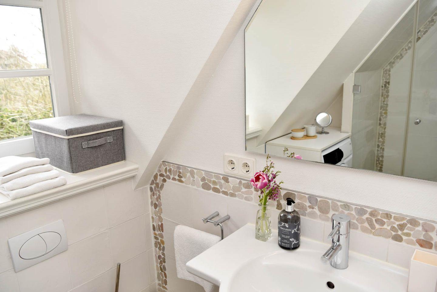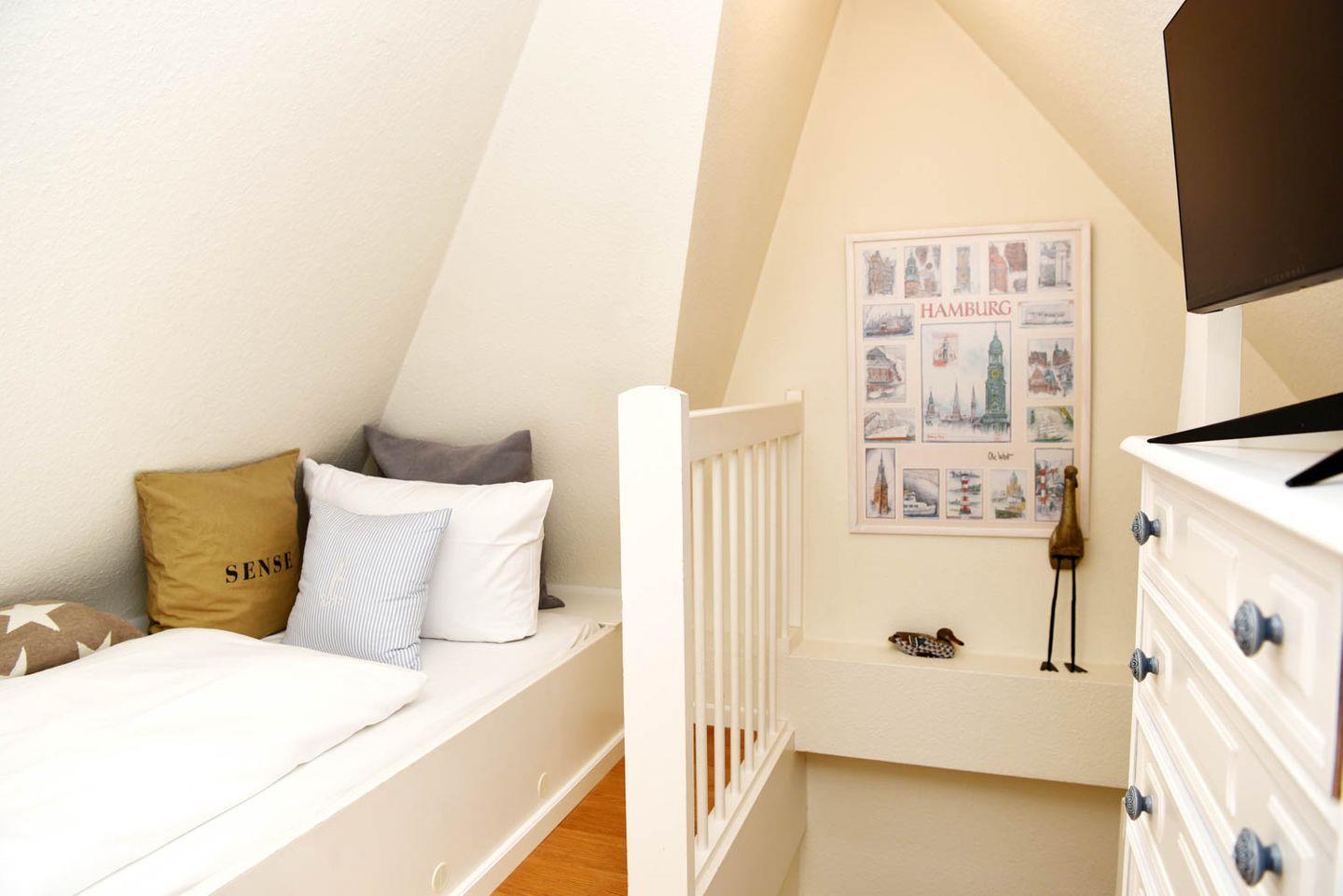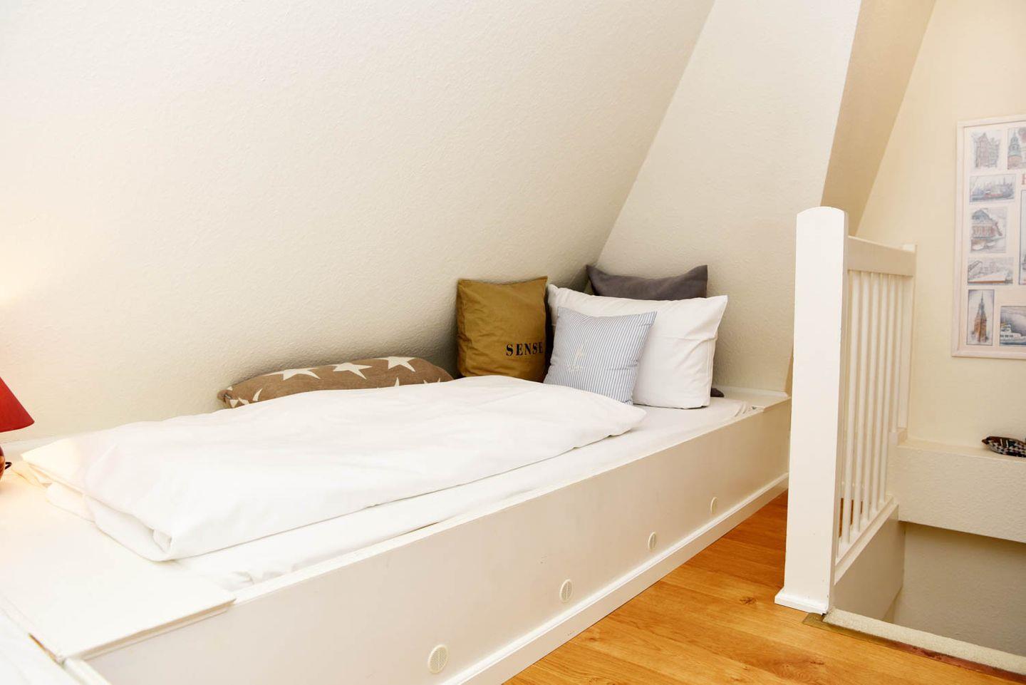 befindet sich im ausgebauten Spitzboden, den Sie über eine bequeme Holztreppe vom Flur aus erreichen.