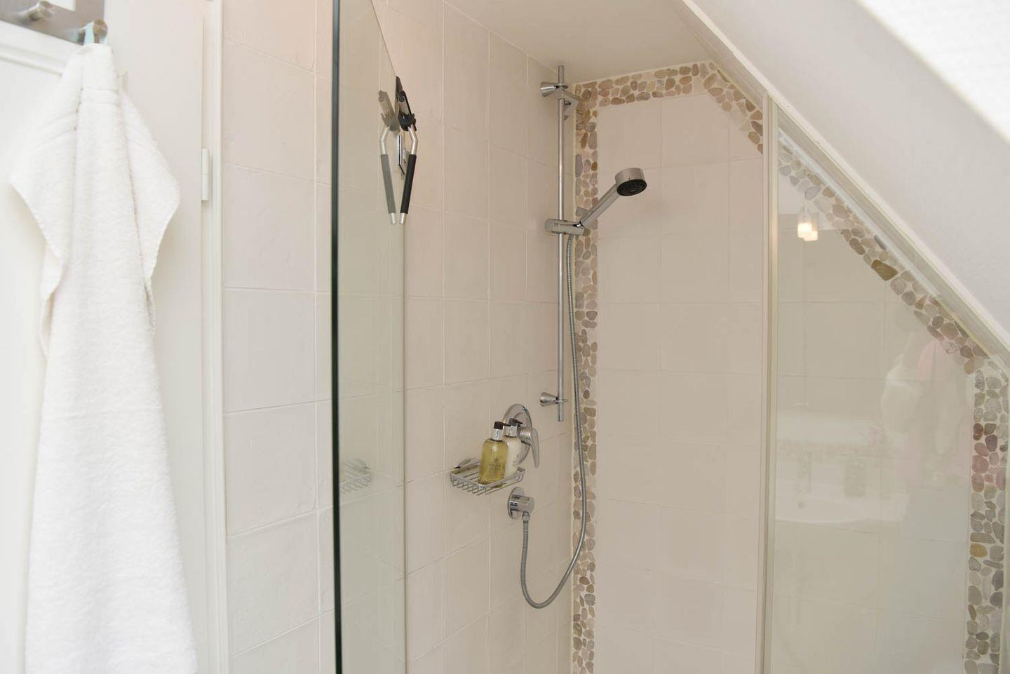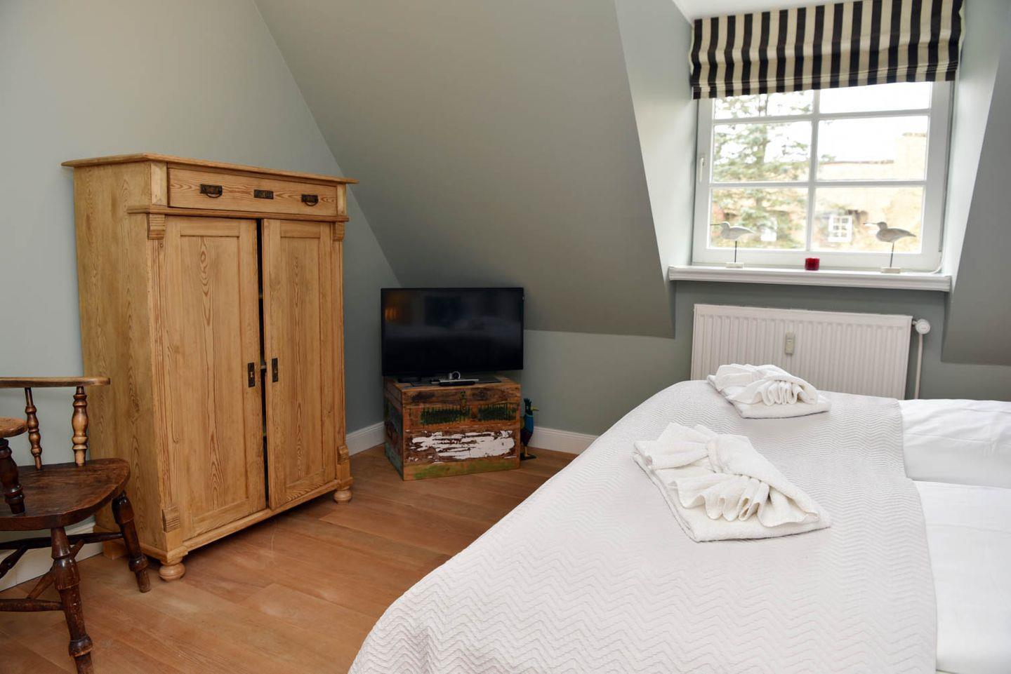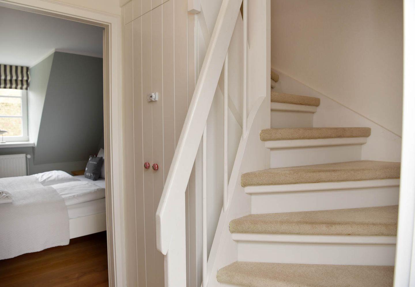 befindet sich im ausgebauten Spitzboden, den Sie über eine bequeme Holztreppe vom Flur aus erreichen.