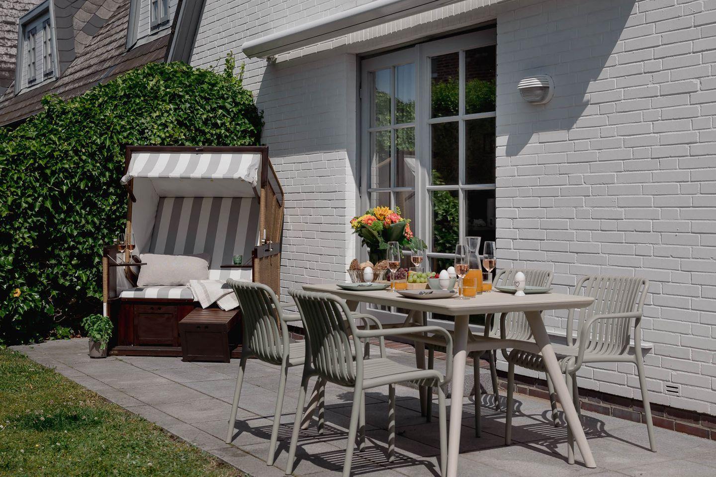 Genießen Sie die sonnigen Stunden auf der südwestlich ausgerichteten Terrasse, die mit eleganten Granitplatten, einem gemütlichen Strandkorb (saisonal), einer elektrischen Markise sowie einem modernen Tisch und vier bequemen Stühlen ausgestattet ist. Der angrenzende Garten bietet ausreichend Platz für entspannte Stunden im Grünen – auch für Ihren vierbeinigen Freund, denn im "Baileys Hüs" sind Hunde herzlich willkommen! Für sie gibt es sogar einen speziellen "Hundeleineparkplatz".