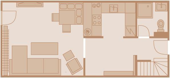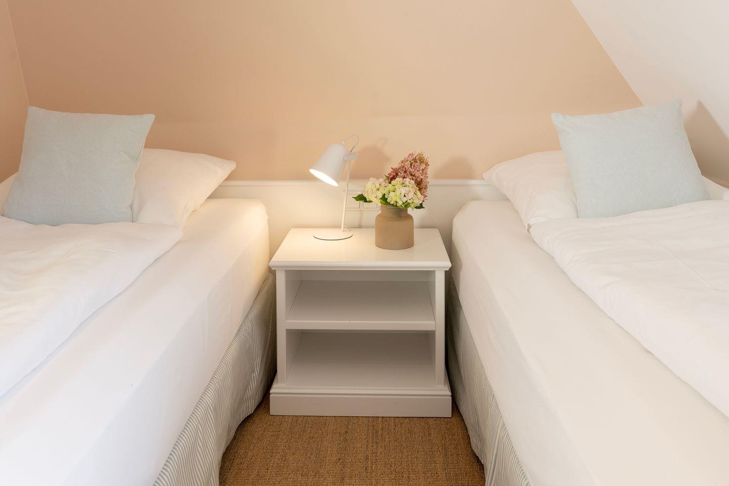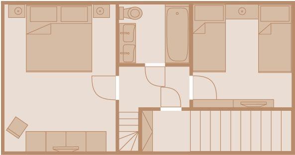 Obergeschoss: 1 Doppelzimmer mit TV; 1 Schlafzimmer mit getrennt stehenden Einzelbetten; 1 Badezimmer mit Duschbadewanne und WC.
