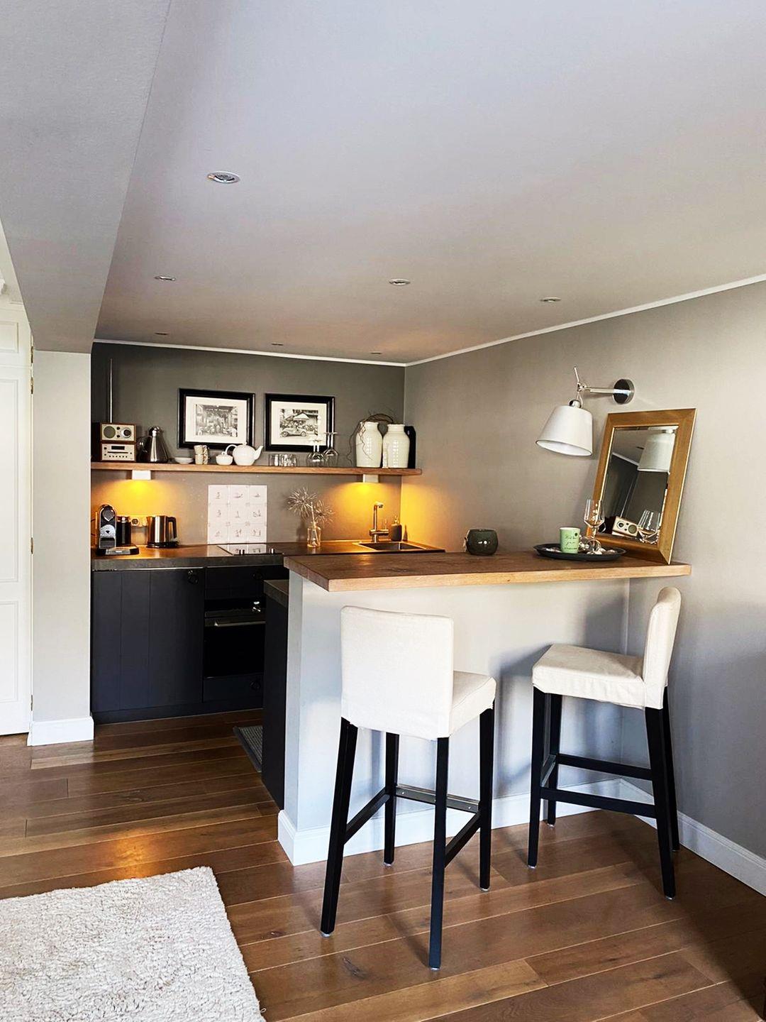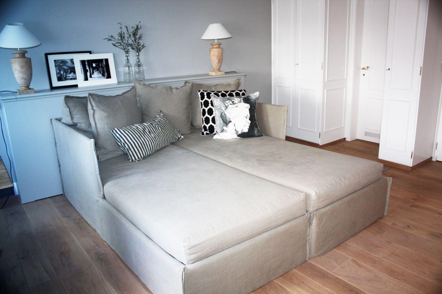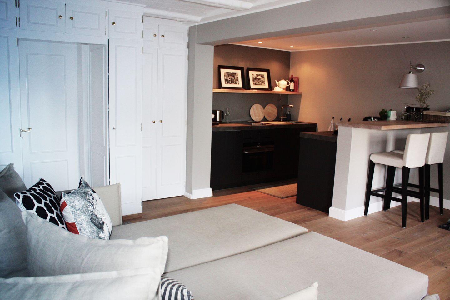 Der offene Wohn- und Schlafraum ist hell und modern eingerichtet und bietet mit einem komfortablen Doppelbett, einer Küchenzeile und einer gemütlichen Sitzecke ein Wohlfühlambiente, in dem Sie nach einem aktiven Inseltag entspannt den Abend ausklingen lassen können. Die gut ausgestattete Küchenzeile umfasst unter anderem Backofen, Geschirrspüler, Kaffeemaschine und Wasserkocher – perfekt für Frühstück, Snacks oder gemeinsame Kochmomente.