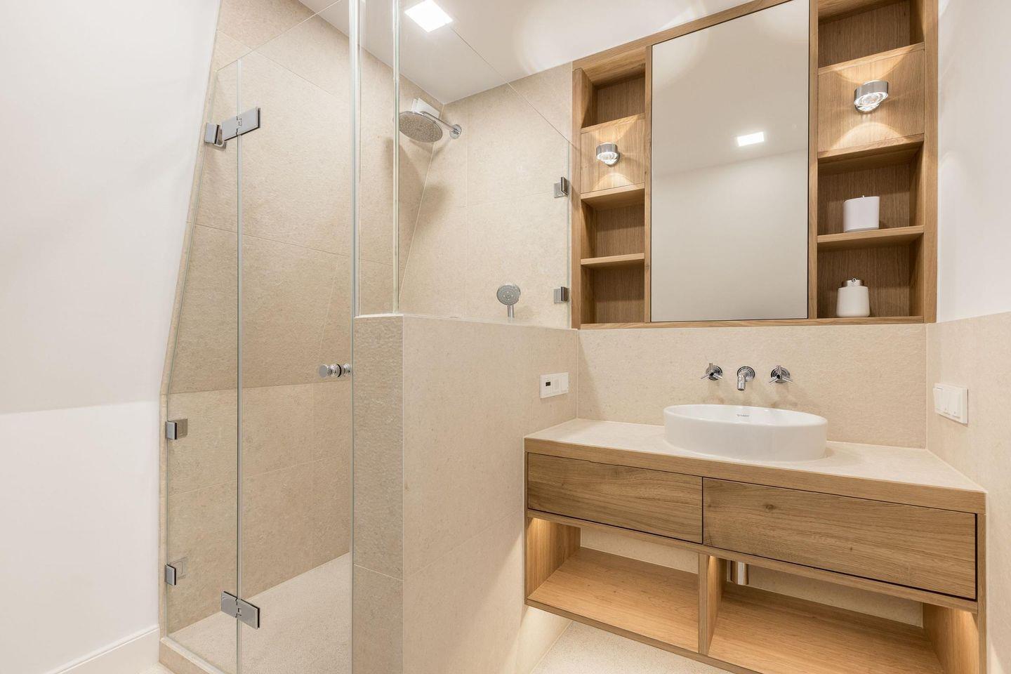Das erste Badezimmer ist mit einer bodengleichen Dusche, Fußbodenheizung, Fön und Tageslicht ausgestattet und schafft eine entspannende Wellness-Oase. Ein separates Gäste-WC im Erdgeschoss sorgt für zusätzlichen Komfort.