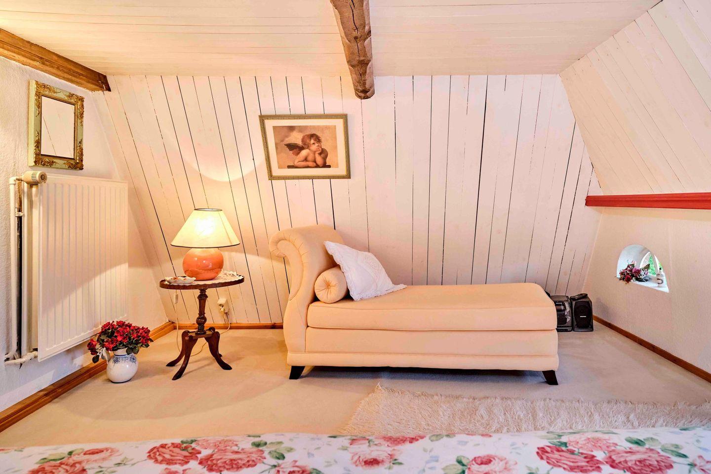Beim Eintreten fällt sogleich die liebevolle Anordnung antiker Kleinigkeiten und teilweise antiquarische Einrichtung ins Auge. Die Küche, mit einer Balkenhöhe von nur 1,85 m, ist gemütlich und hat ihren alten Charakter bewahrt.