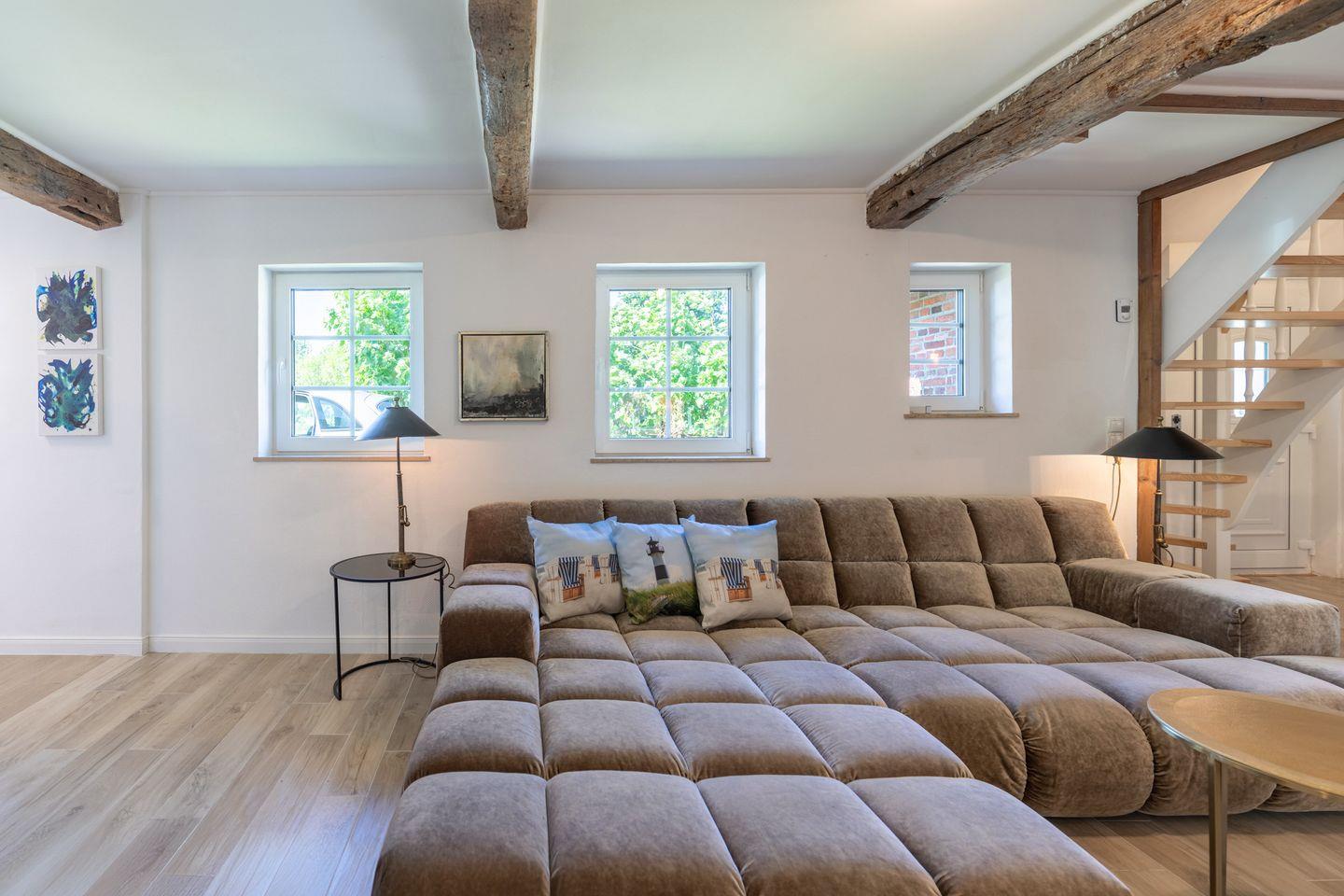 Die offene, gut ausgestattete Küche lädt Hobbyköche zum Kochen ein: Sie finden hier einen Kühlschrank mit Gefrierfach, einen Backofen, einen Induktionsherd, eine Kaffeemaschine (Filtergröße 4), einen Wasserkocher, einen Toaster und einen Geschirrspüler. Die gemütliche Sitzecke bietet Platz für gesellige Runden. Der Wohnbereich mit einer bequemen Sofalandschaft ist ideal für kuschelige Kaminabende oder spannende Filmabende vor dem großen Flachbildschirm-TV. Das Badezimmer im Erdgeschoss bietet neben einer Dusche auch eine Badewanne für entspannende Momente. Im Hauswirtschaftsraum stehen Ihnen eine Waschmaschine und ein Trockner zur Verfügung. Die geschützte Terrasse lädt zum Ausklingen des Tages ein.