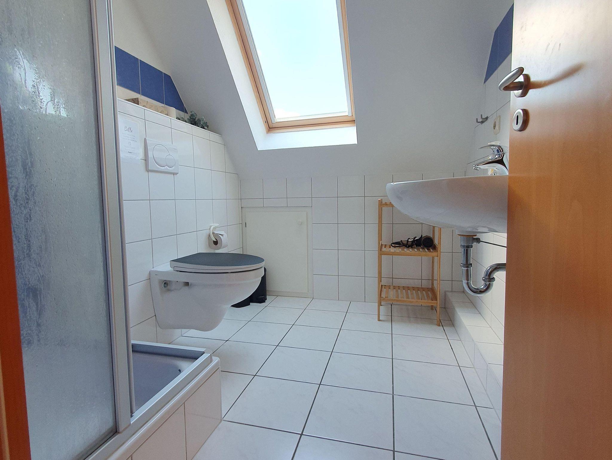 Das Badezimmer ist mit einer Dusche, Waschtisch und WC ausgestattet.