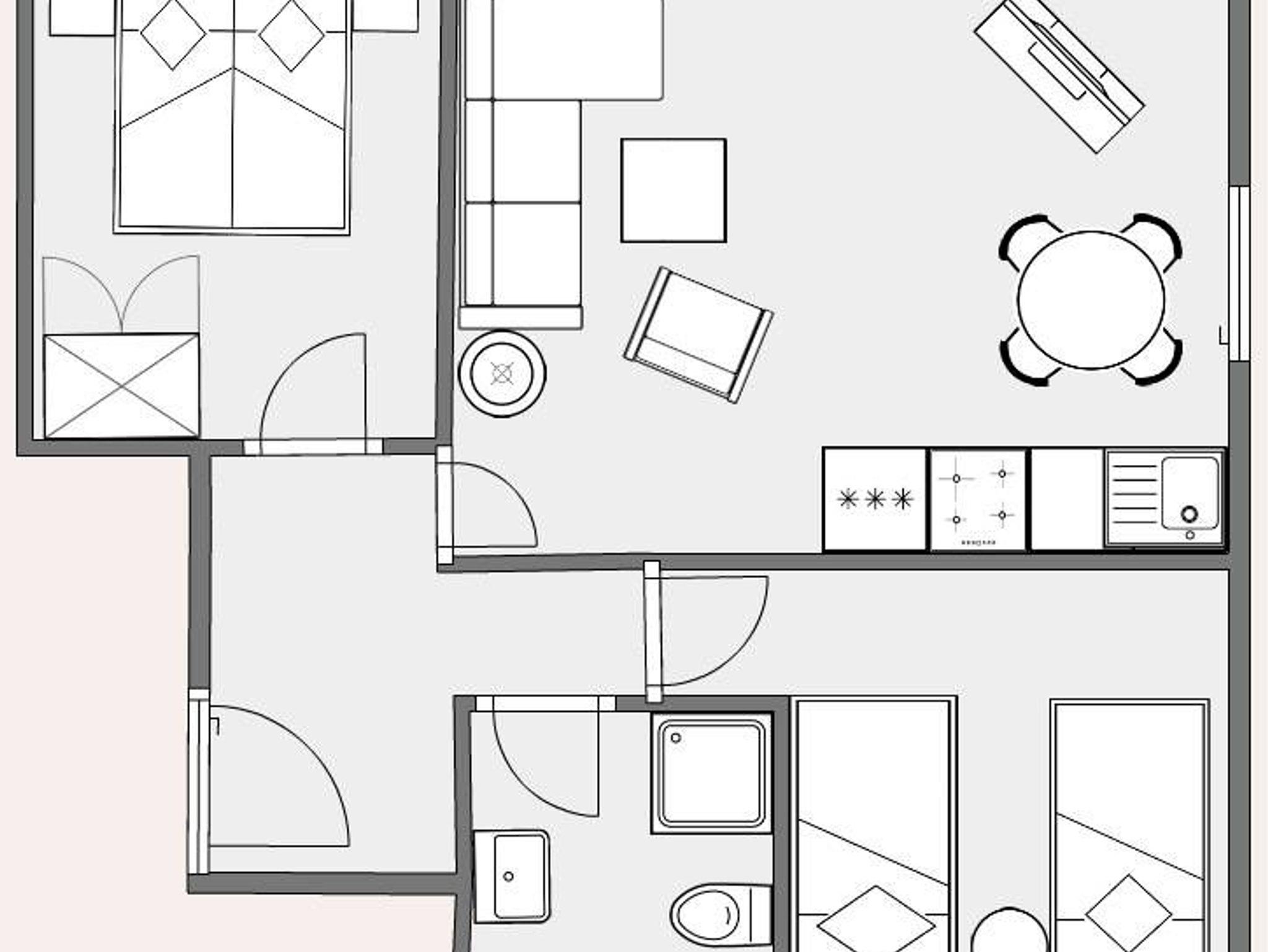 Die Wohnung bietet einen Wohnbereich mit Couchgarnitur, TV mit CD+DVD-Player und einer Essgruppe mit vollständig eingerichteter Einbauküche. Vom Flur aus gelangen Sie dann zu den beiden Schlafzimmern mit Doppelbett bzw zwei Einzelbetten.