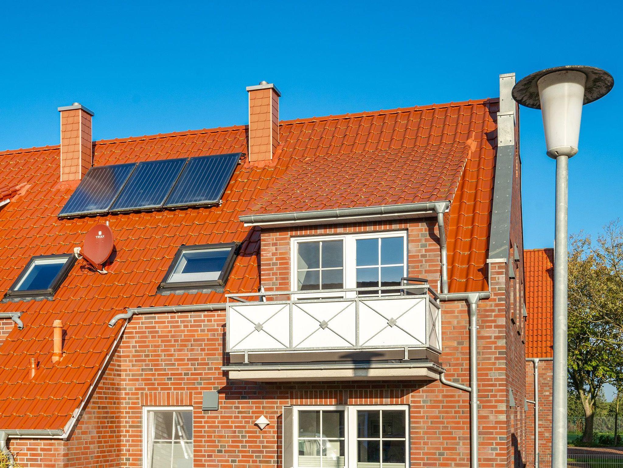 Moderne Ferienwohnung Küstenzeit in Greetsiel mit Balkon und Blick auf die Zwillingsmühlen, ideal für entspannte Küstenurlaube.