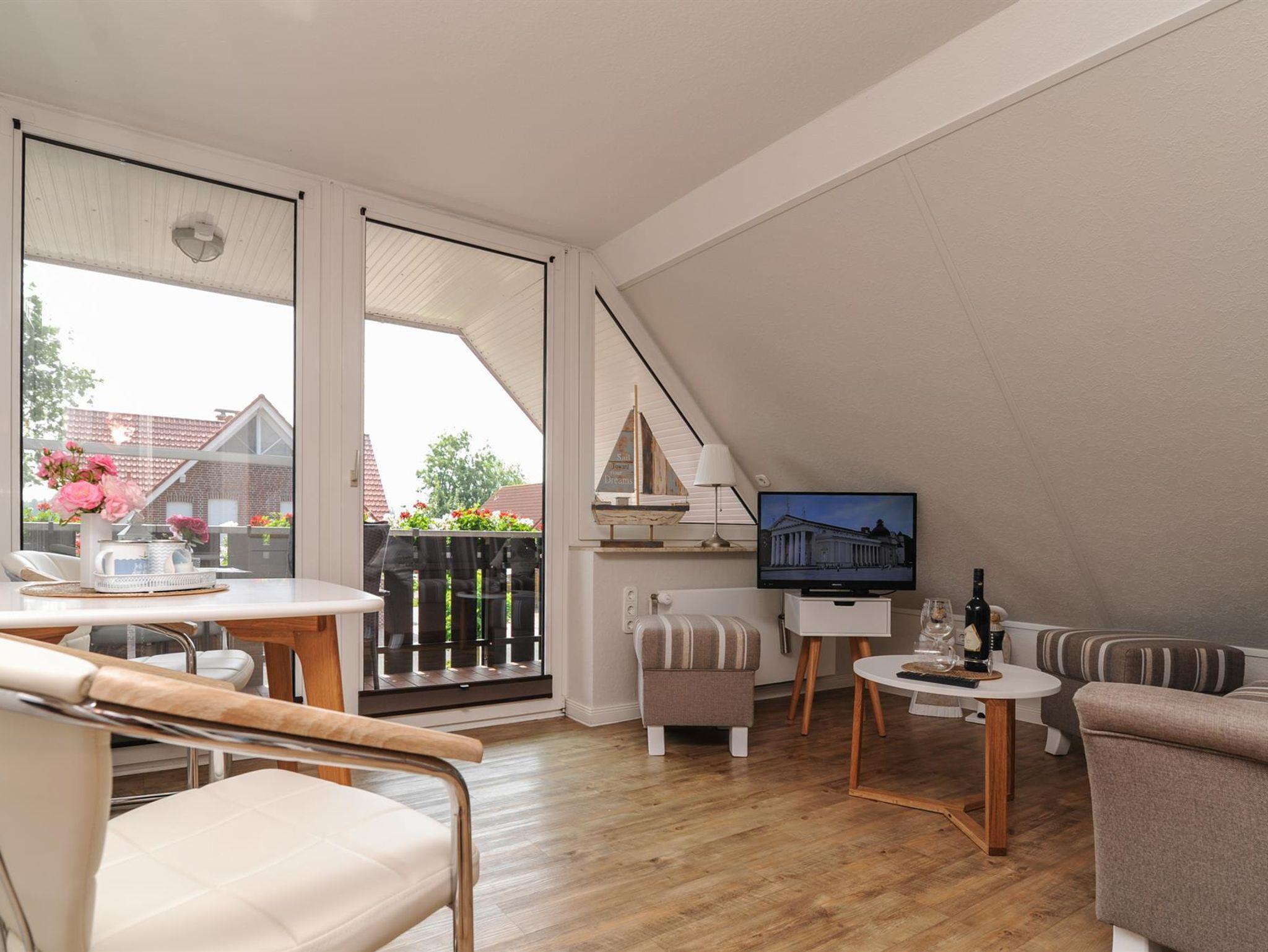 Gemütliche Ferienwohnung in Krummhörn mit Balkon, Nähe Hafen und Ortskern, ideal für ruhigen Urlaub zu dritt.