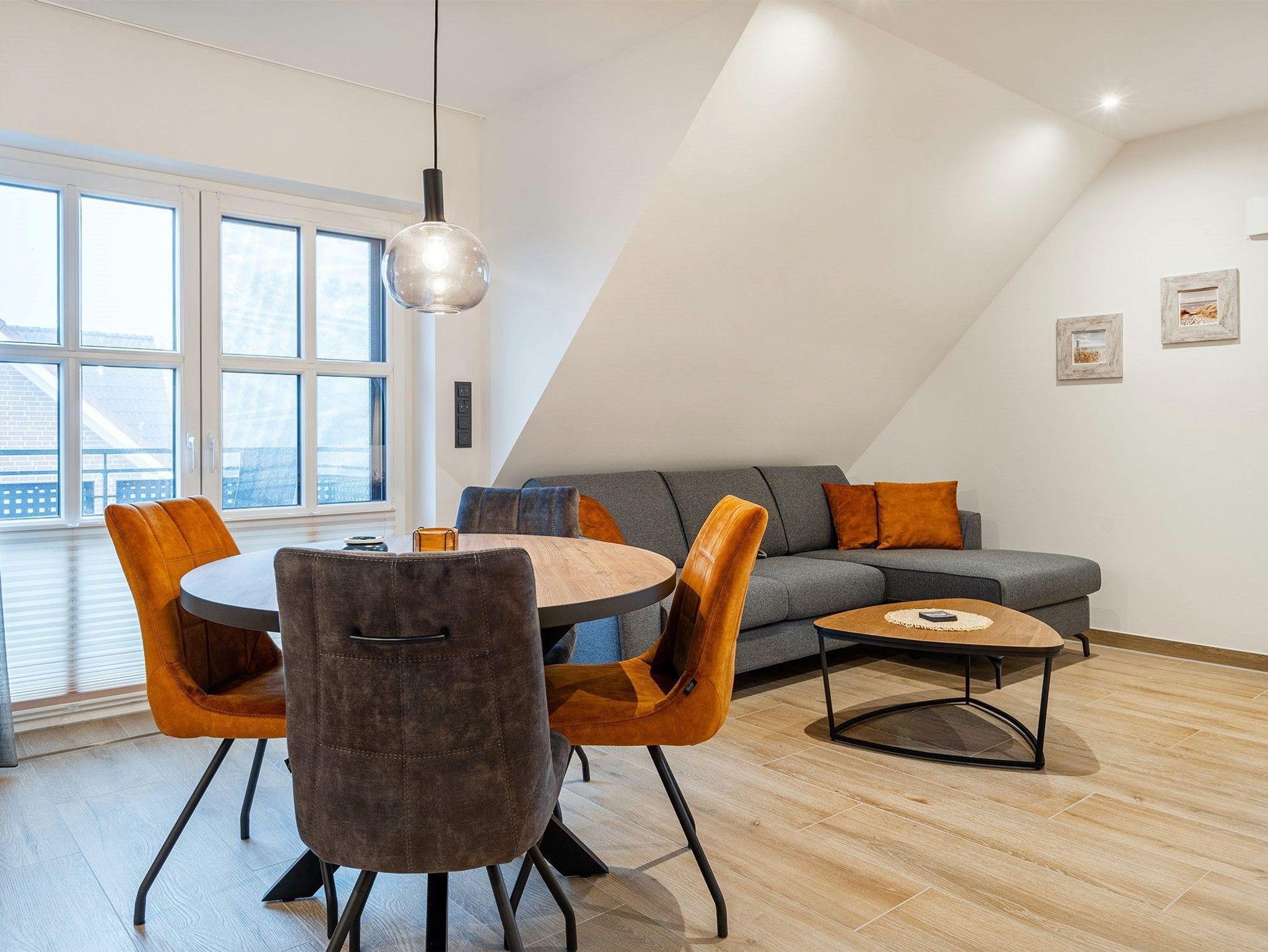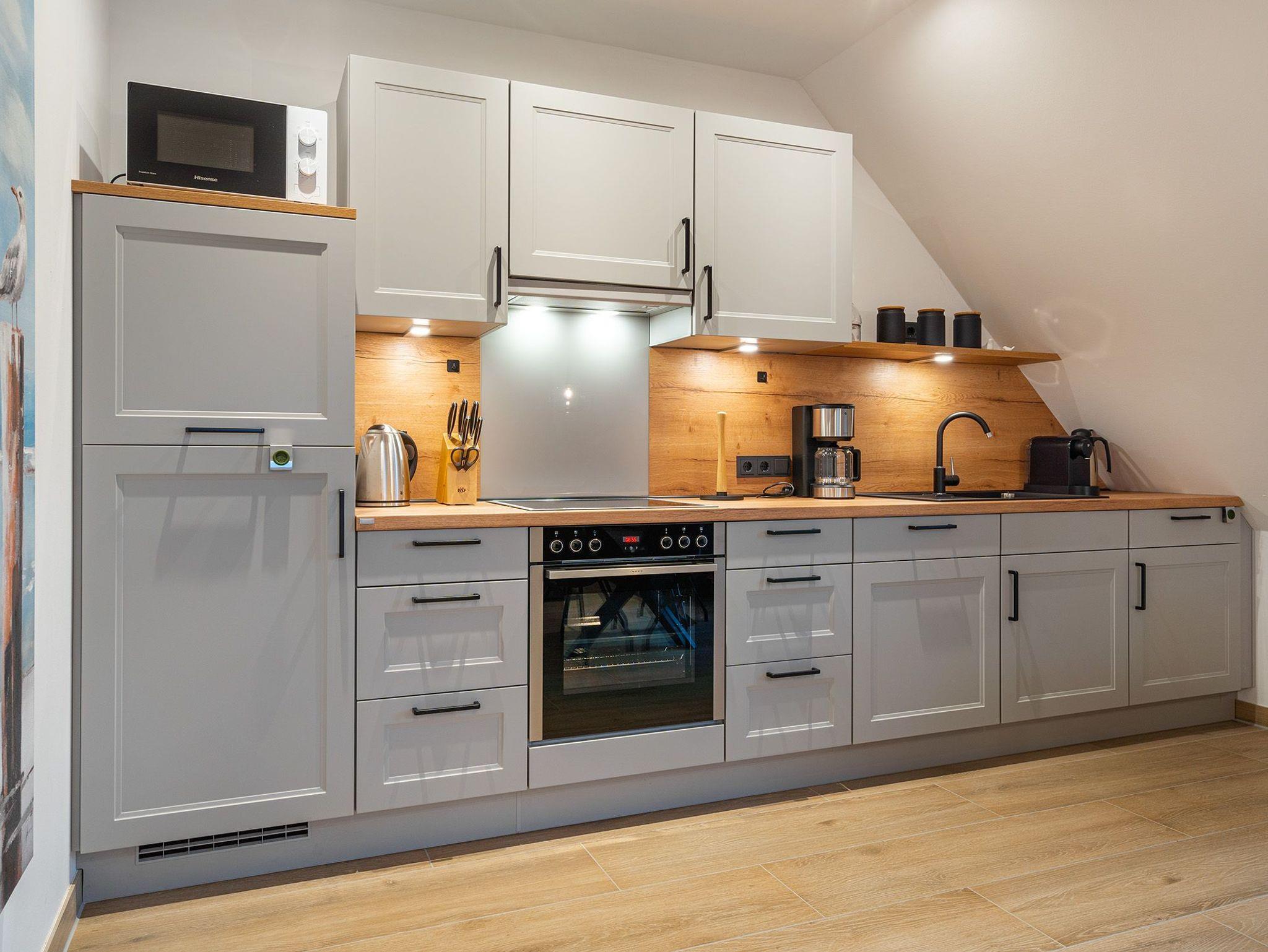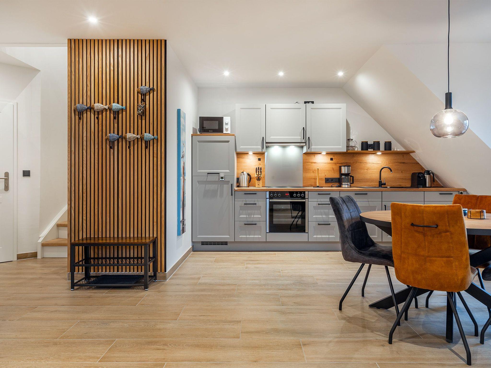 Unsere neue, charmante Obergeschosswohnung Möwenkoje bietet auf 65qm den idealen Rückzugsort für Ihren Greetsiel Urlaub. Der offene Wohnbereich besticht durch seine einladende Atmosphäre und hochwertige Einbauküche, die perfekt in den Raum integriert ist und keine Wünsche offen lässt. Neben einem gemütlichen Schlafzimmer, das erholsame Nächte verspricht, verfügt die Wohnung außerdem über ein helles Tageslichtbad mit einer ebenerdigen Dusche und einen kleinen Abstellraum. Der ausgebaute Spitzboden, der offen als Galerie gestaltet ist, bietet mit dem Lesesessel nicht nur einen gemütlichen Rückzugsort für entspannte Stunden sondern außerdem ein weiteres Doppelbett, sodass insgesamt vier Personen untergebracht werden können (zwei Einzelbetten, die mit Verbindung zum Doppelbett verbunden sind). Ein weiteres Highlight ist der Balkon, auf dem Sie die frische Nordseeluft genießen und den Blick schweifen lassen können. Ein Abstellraum für Ihre Fahrräder sowie ein PKW Stellplatz stehen Ihnen selbstverständlich zur Verfügung.