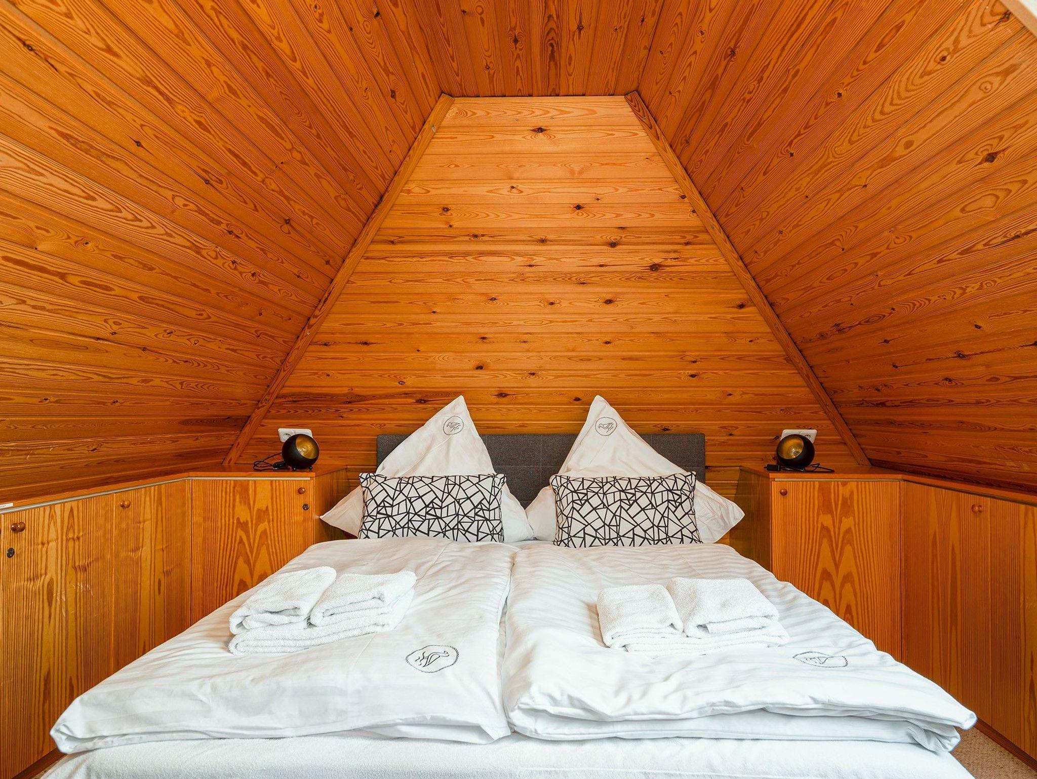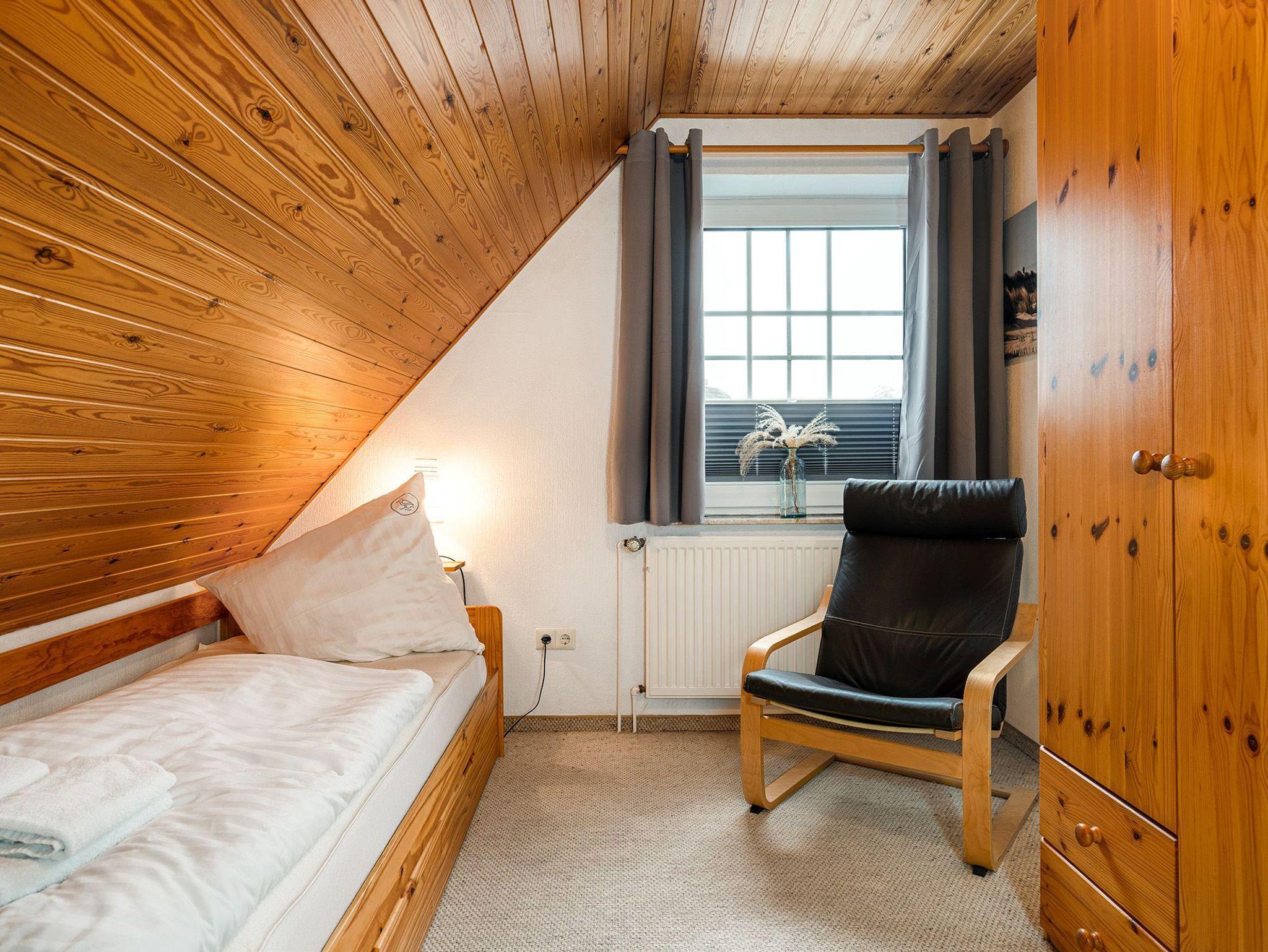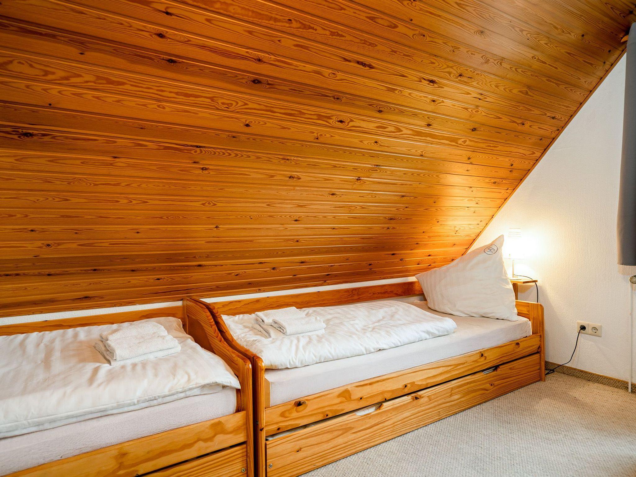 * bitte beachten Sie, dass das Schlafzimmer mit Einzelbetten auch als Durchgangszimmer zum Dachgeschoss dient. Weiterhin kann eines der Einzelbetten als Tandembett ausgezogen werden, sodass auf Anfrage auch insgesamt sieben Personen dort untergebracht werden können.*