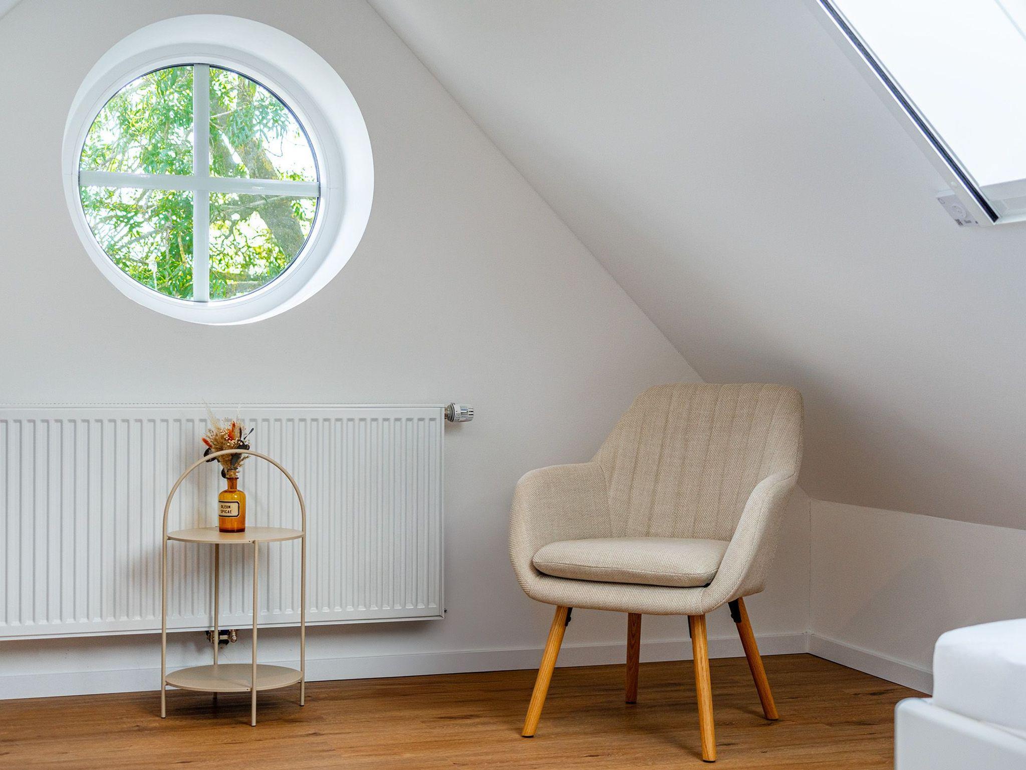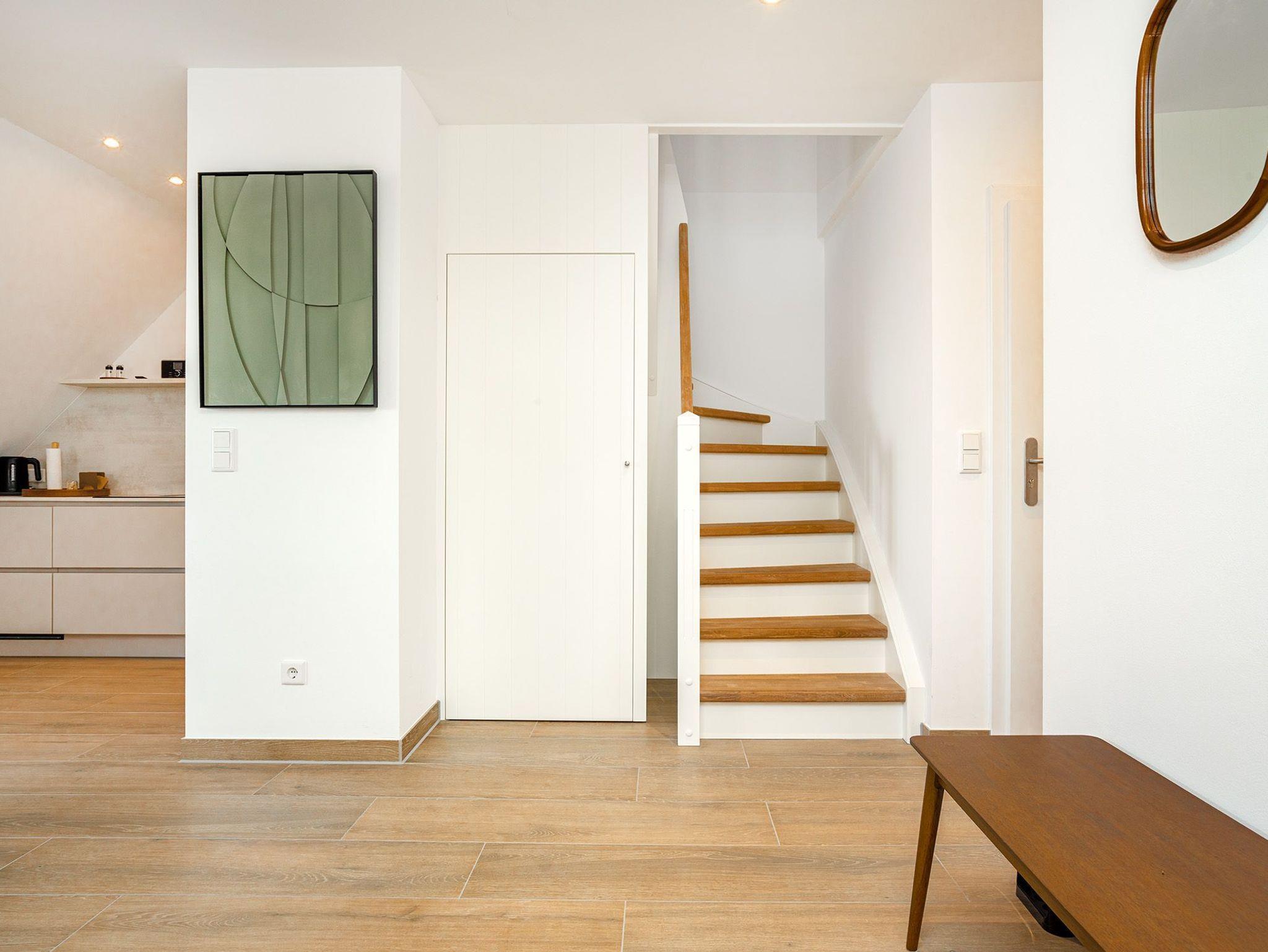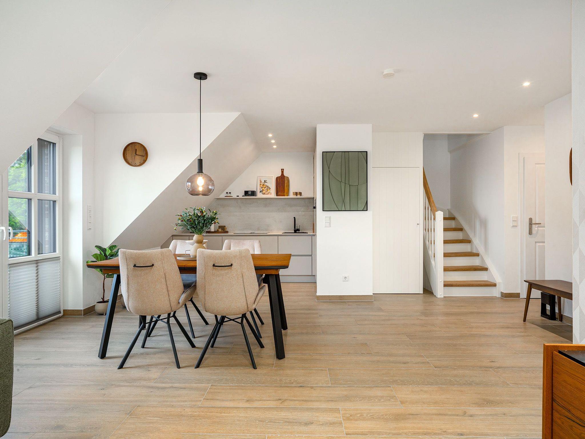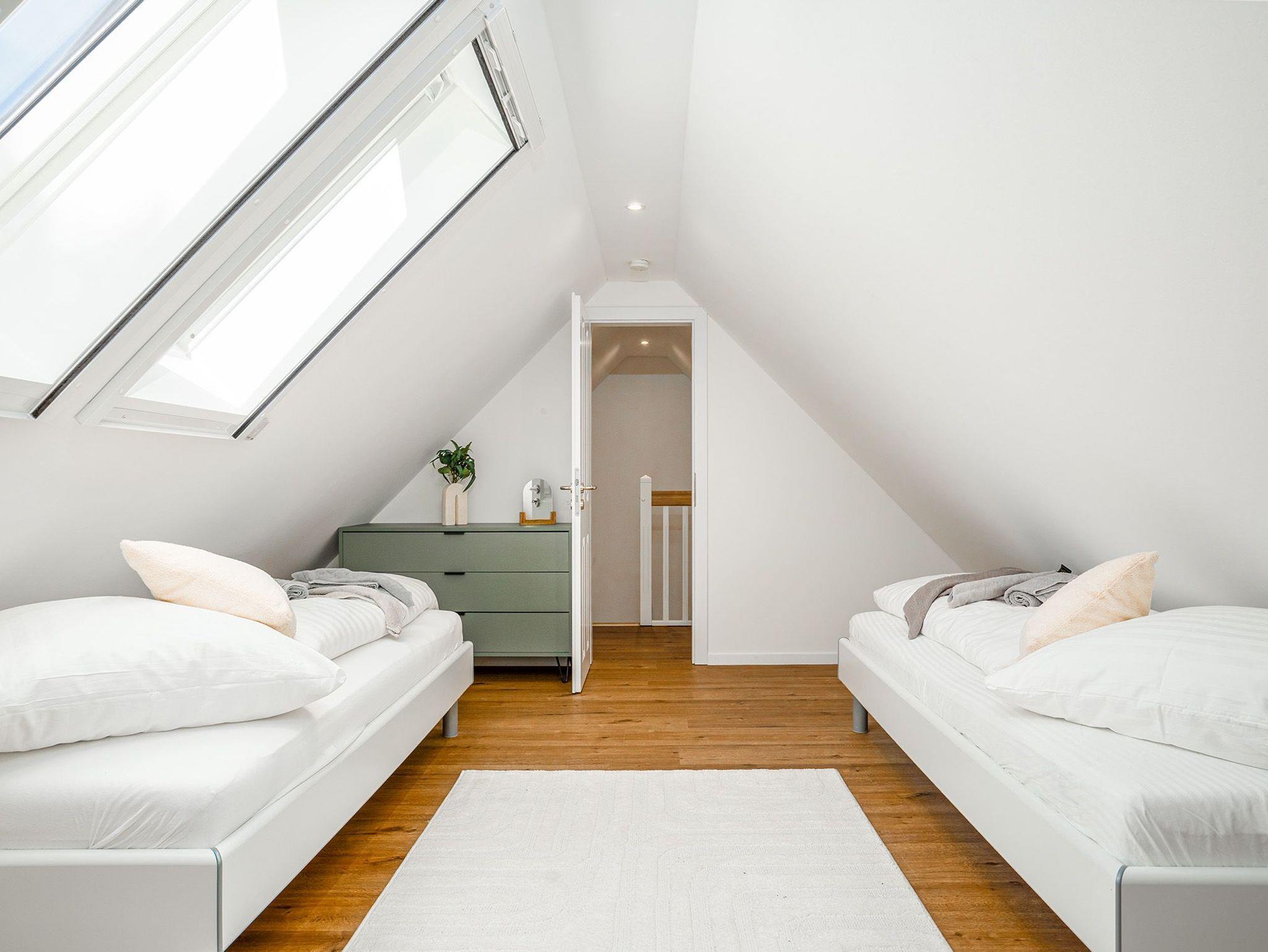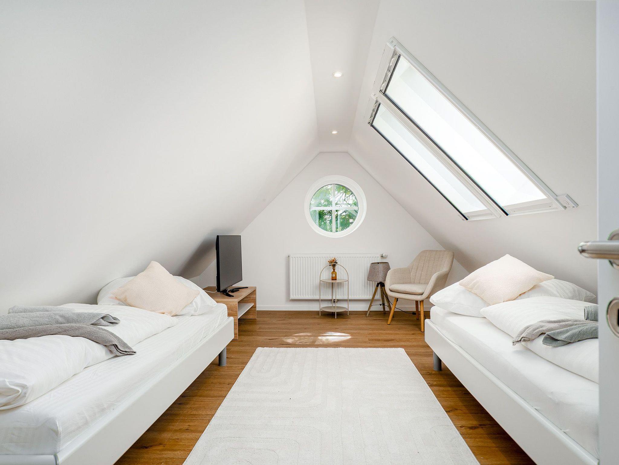 Die Ferienwohnung Muuske ist eine großzügige, stilvoll eingerichtete Unterkunft mit einer Größe von 70qm, die sich im Obergeschoss befindet. Der offene Wohn-Ess-Bereich der Wohnung ist besonders gemütlich und warm gestaltet, ideal zum Entspannen nach einem erlebnisreichen Tag. Der Raum besticht durch eine einladende Atmosphäre und bietet Zugang zu einem möbilierten Balkon, der zum Verweilen an der frischen Luft einlädt. Die hochwertige Küche ist modern und bestens ausgestattet, das Schlafzimmer mit Bad en Suite und Boxspringbett bietet zusätzlichen Komfort und Privatsphäre. Das dazugehörige Badezimmer verfügt über eine ebenerdige Dusche, die sowohl komfortabel als auch stilvoll ist. Ein weiteres Highlight ist das zweite kleine Tageslichtbad, das ebenfalls mit einer ebenerdigen Dusche ausgestattet ist und somit besonders praktisch für den Urlaub mit der Familie oder Freunden ist. Im ausgebauten Spitzboden finden Sie ein weiteres abgeschlossenes Schlafzimmer mit zwei gemütlichen Einzelbetten und einem Lesesessel ? perfekt für Kinder oder weitere Gäste. Selbstverständlich steht Ihnen auch ein eigener Parkplatz, sowie Abstellmöglichkeiten für Fahrräder zur Verfügung.