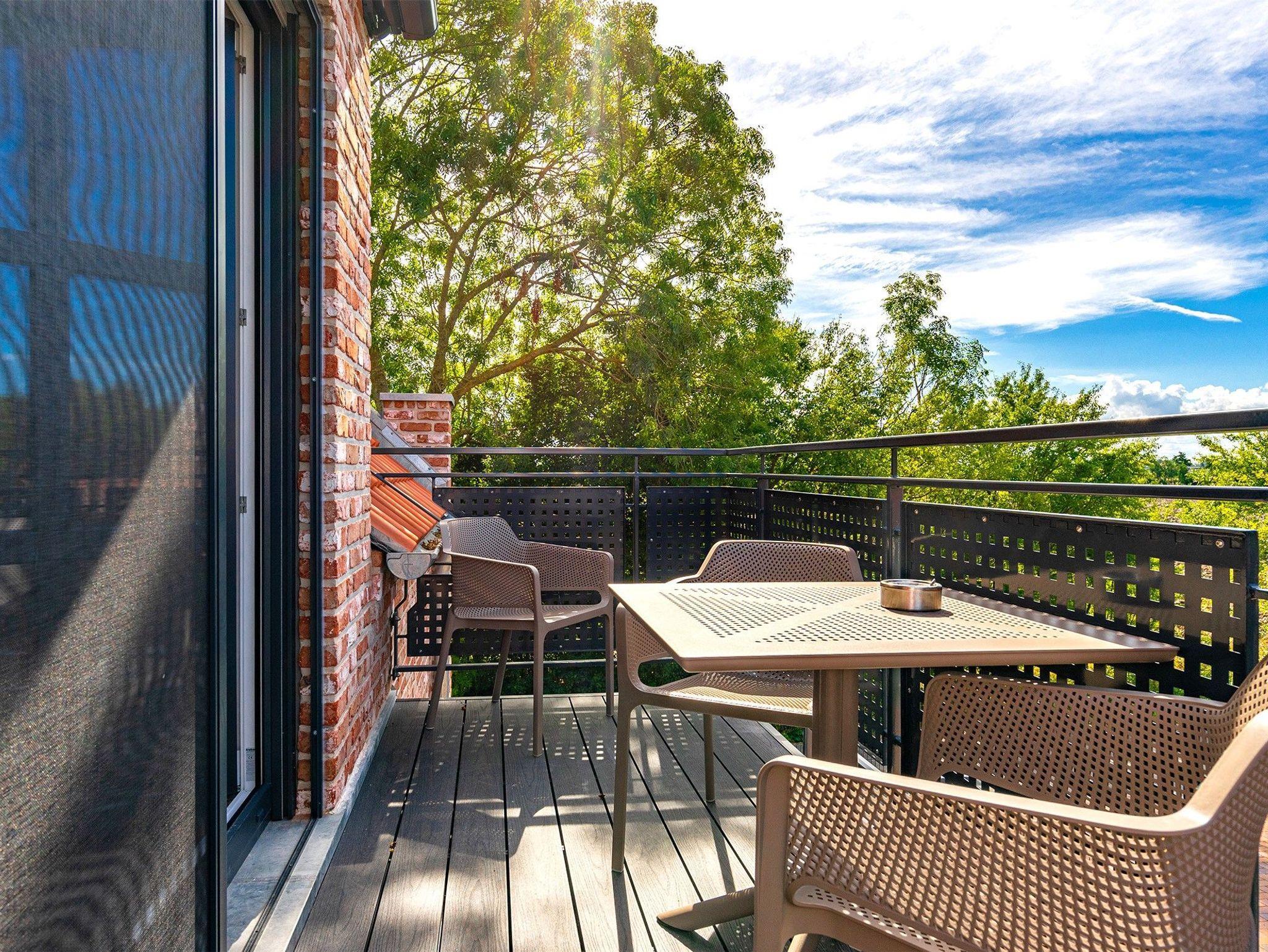 Die Ferienwohnung Muuske in Greetsiel bietet stilvollen Komfort mit Balkon, moderner Küche und zwei Badezimmern.