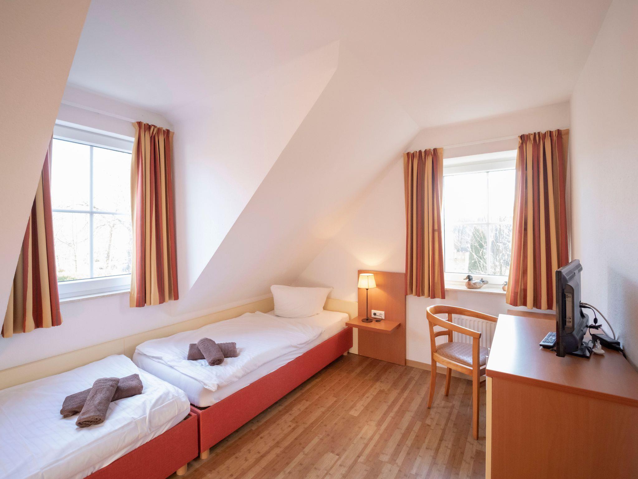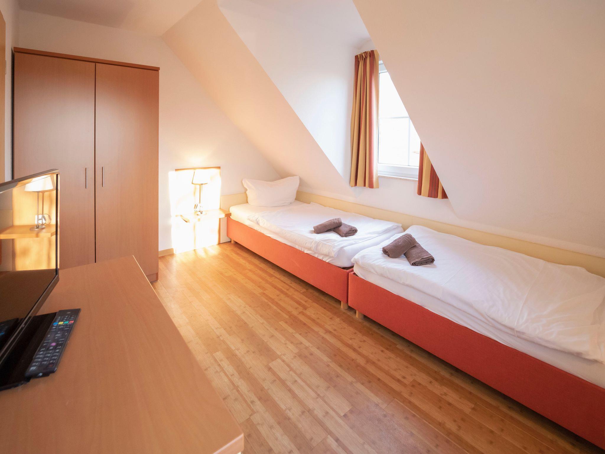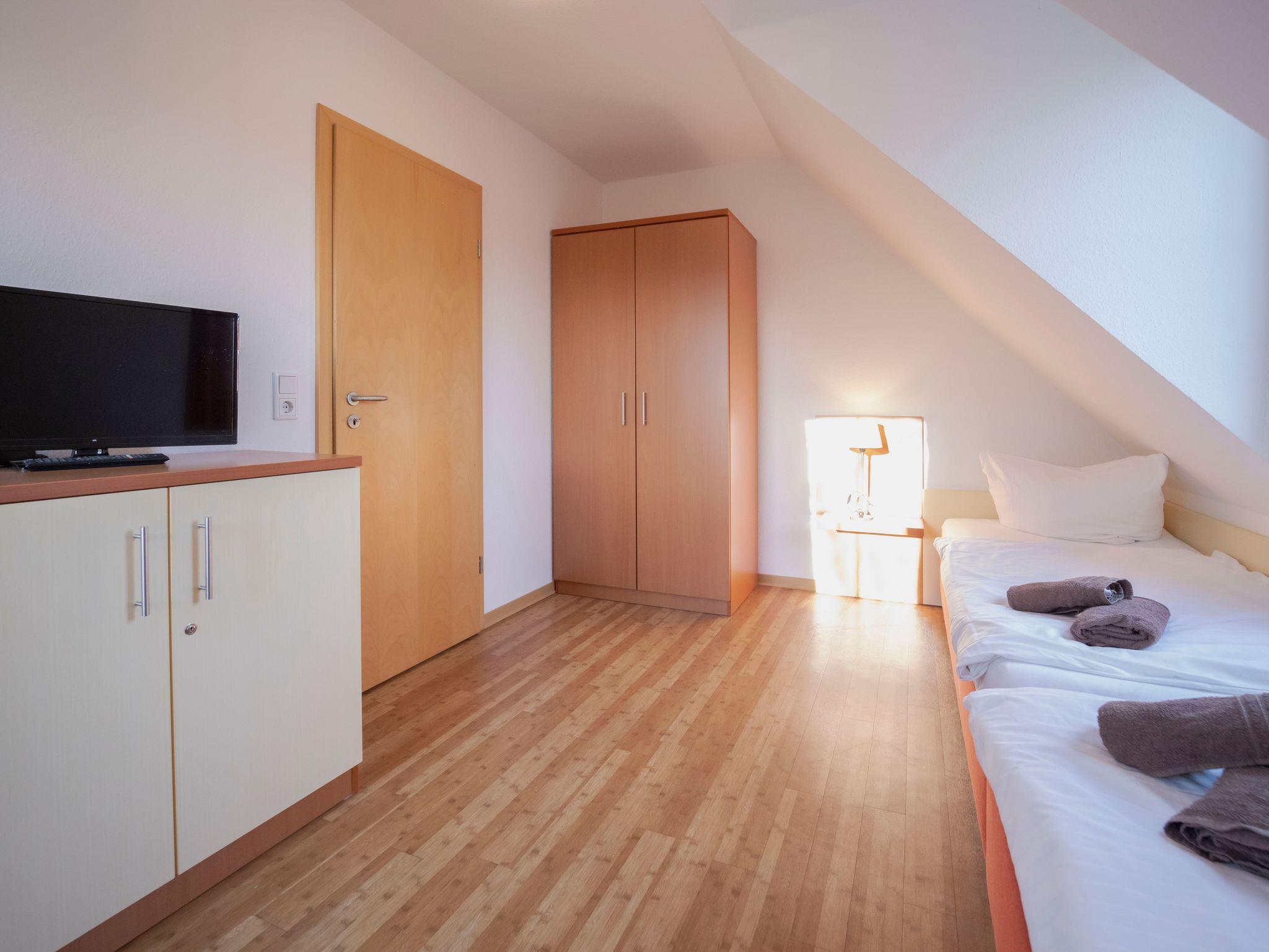 Schlafraum mit zwei Einzelbetten (auch als Doppelbett möglich) und Kommode.