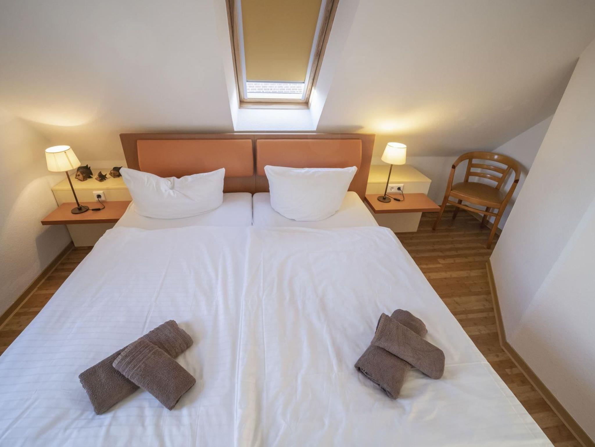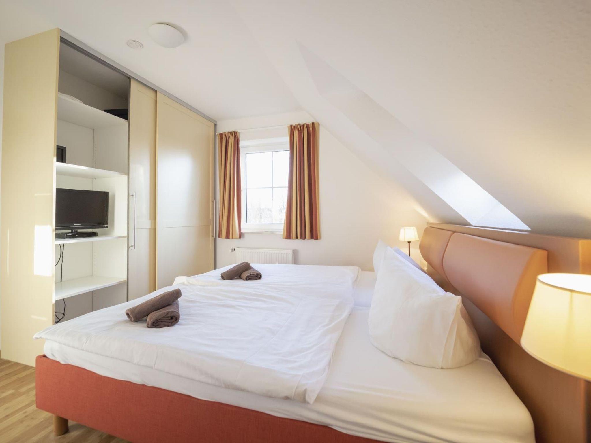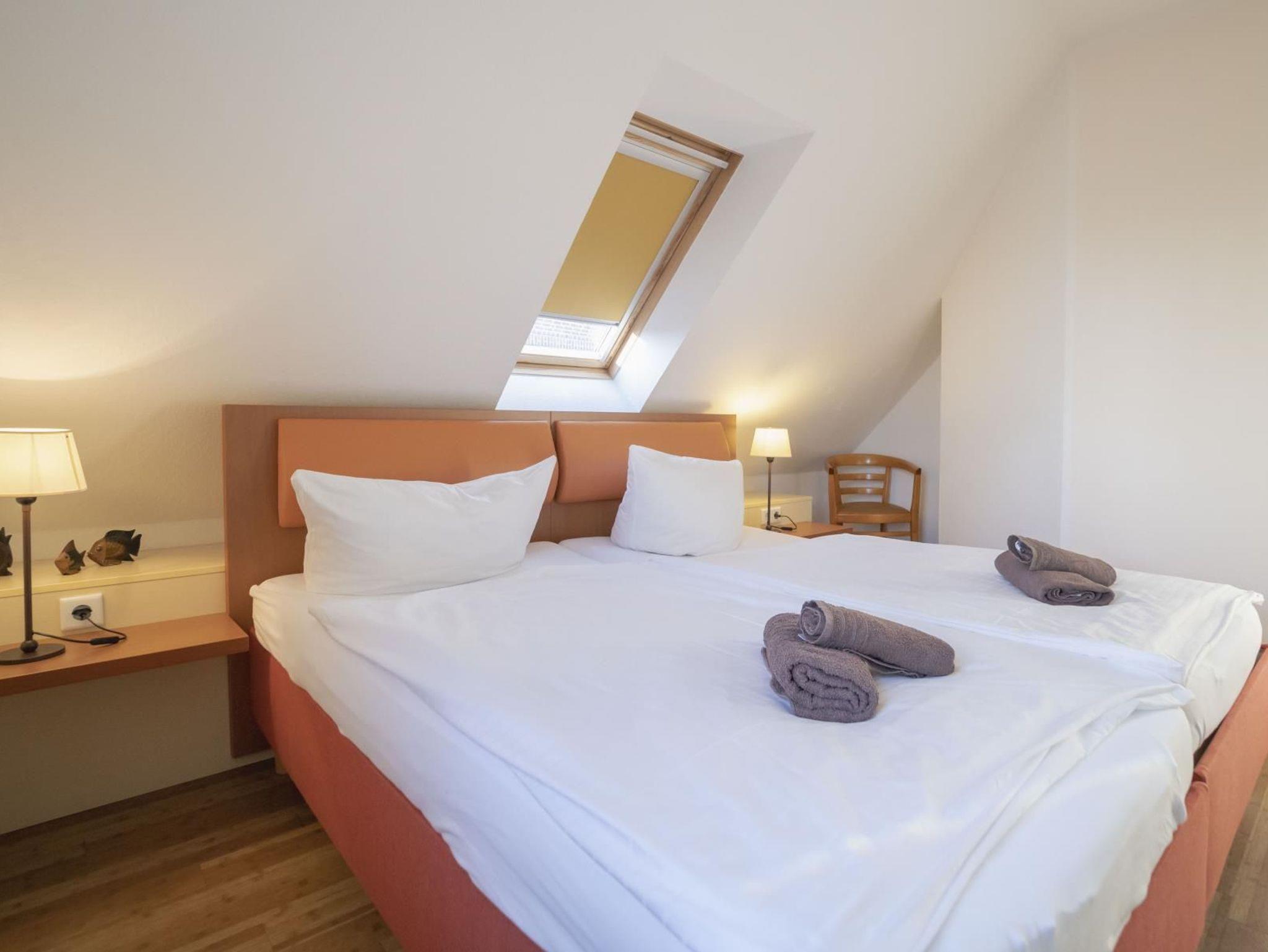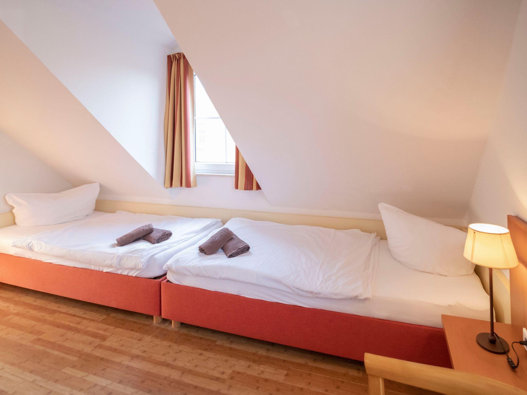 Schlafraum mit zwei Einzelbetten (auch als Doppelbett möglich) und Kommode.