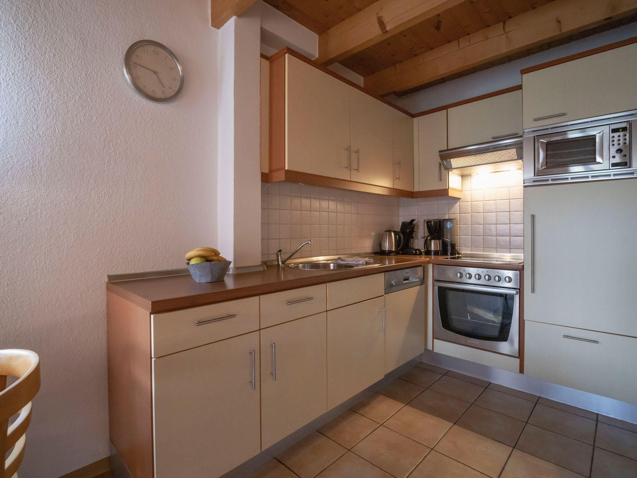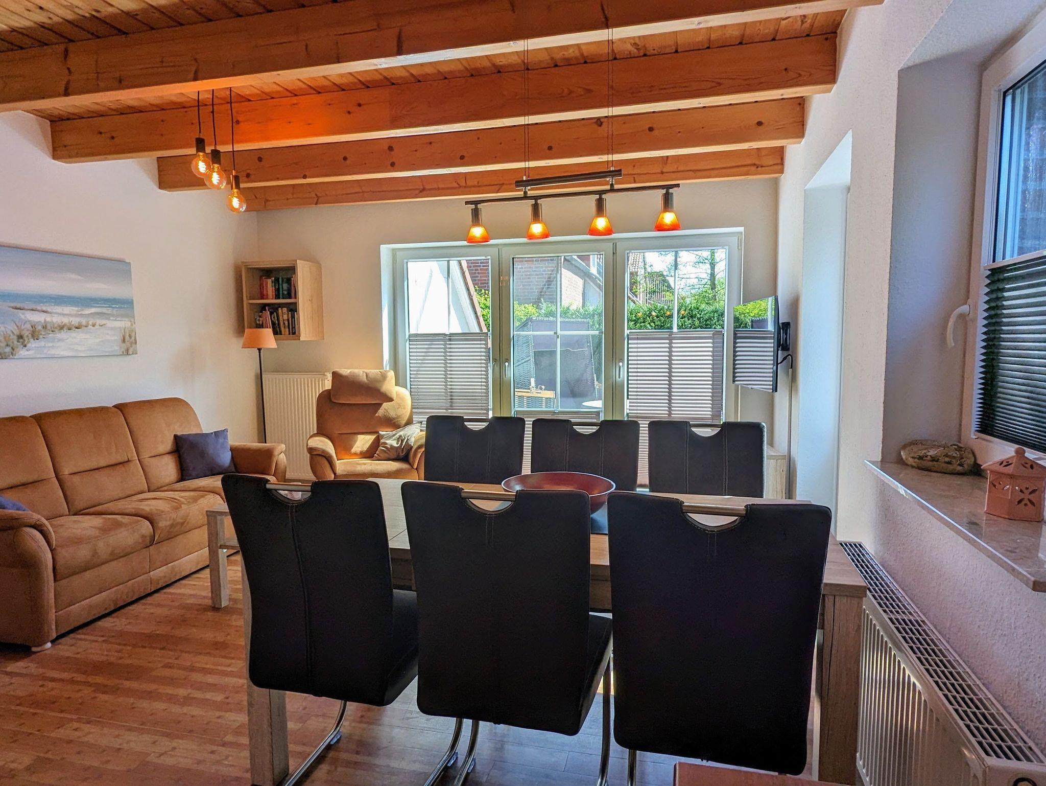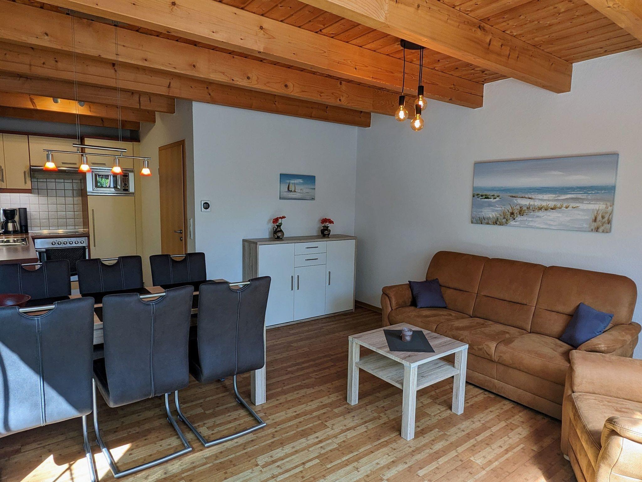 Der großzügige Wohnraum mit großen Fensterelementen ist farblich ansprechend aufeinander abgestimmt. Eine Couch sowie Sessel laden zum Lesen (kleine Bibliothek ist vorhanden), Kuscheln oder Fernsehen ein. Selbstverständlich haben Sie auch von dem separaten Essplatz aus einen sehr guten Blick auf den großen SAT-LCD-TV mit DVD-/Blu-ray-Player. Eine Musikanlage und diverse Spiele stehen für Sie zur Verfügung. Die offene Einbauküche mit allem Komfort (Geschirrspüler, Mikrowelle, Backofen, Ceranfeld, Kaffeemaschine, Senseo Maschine, Toaster, Wasserkocher, Handmixer) fügt sich harmonisch in den Wohnbereich ein. Geschmackvolle Dekorationen und Bilder runden die Einrichtung für Ihre Behaglichkeit ab.