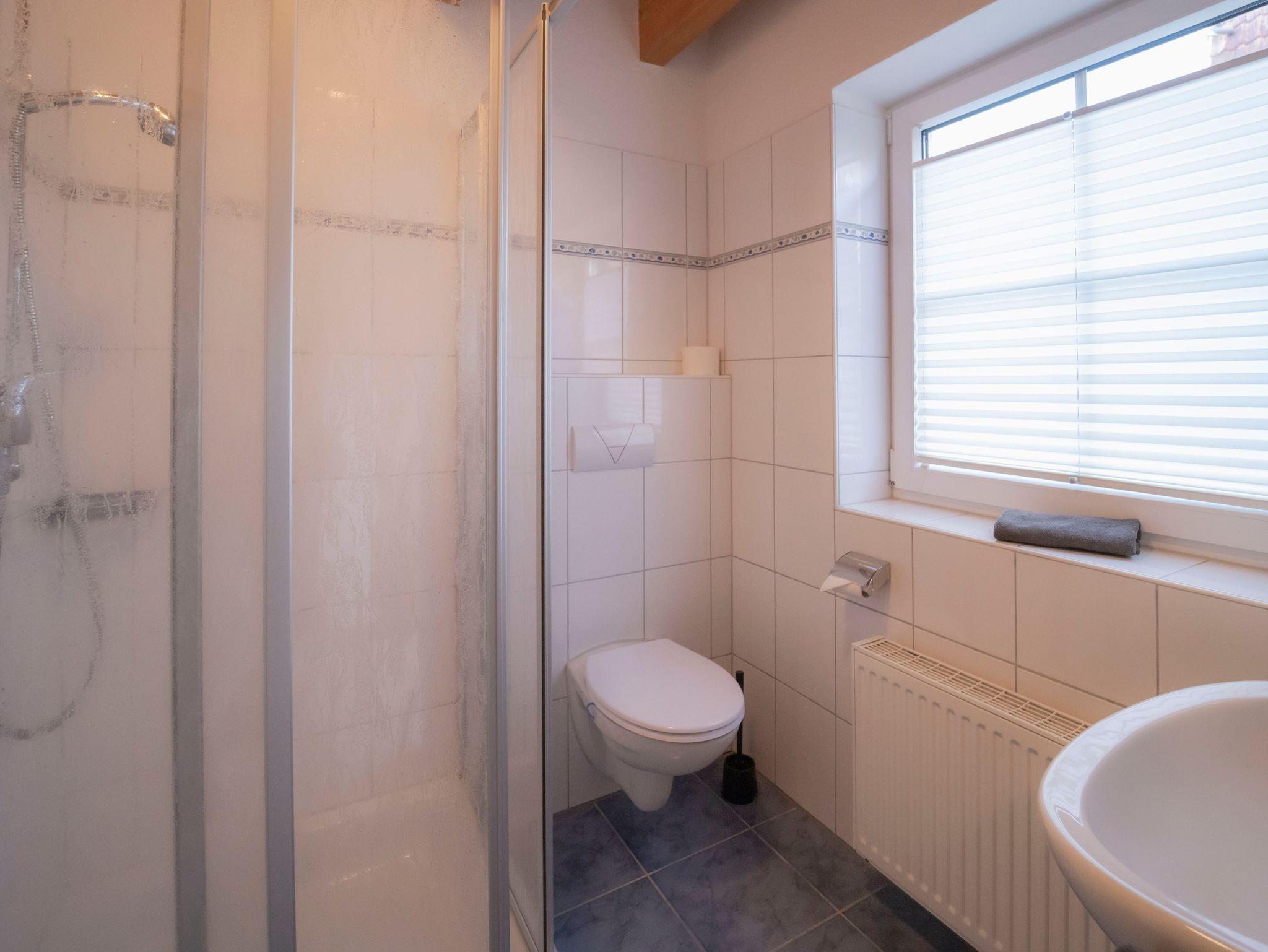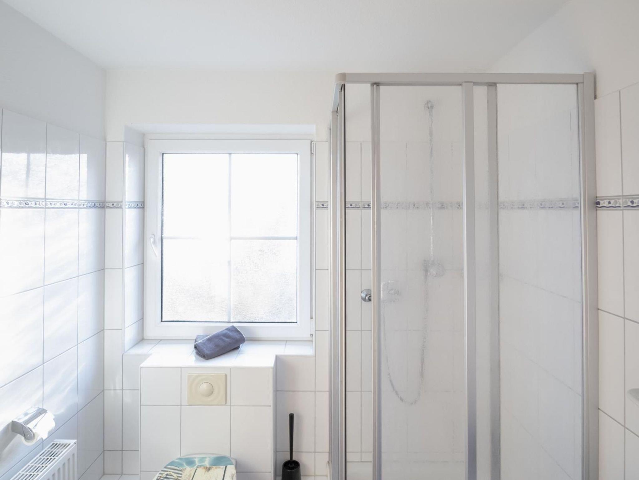 Helles Bad mit Fenster und Dusche, Ablageregal, Föhn und Kosmetikspiegel.