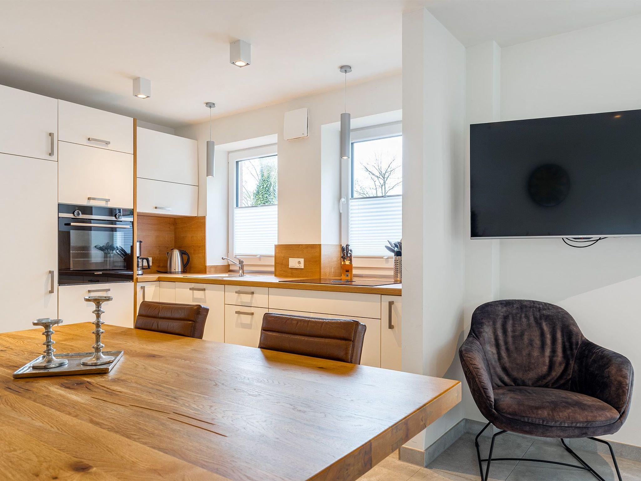 Unsere erst kürzlich komplett sanierte Wohnung Die Zimmerei 4 befindet sich in zentralster und dennoch ruhigen Lage von Greetsiel. Auf etwa 70qm verfügt diese Erdgeschoss Wohnung über zwei Schlafzimmer mit komfortablen Boxspringbetten, ein modernes und geräumiges Badezimmer mit einer bodengleichen Dusche sowie über einen Abstellraum mit einem Waschtrockner. Das Herzstück der Wohnung ist der helle Wohn-Ess-Bereich, der neben einer gemütlichen Sofalandschaft und einem großen Esstisch über ein Sitzfenster verfügt, in das man sich mit einem guten Buch zurück ziehen kann. Auch die Terrasse lädt ein, die Sonnenstunden draußen zu verbringen, auch Ihr Vierbeiner wird dies genießen. Selbstverständlich steht Ihnen ein eigener Parkplatz am Haus zur Verfügung. Sollten Sie mit einem E-Auto anreisen, verfügt das Objekt auch über eine Ladesäule, die Sie hinzu buchen können.