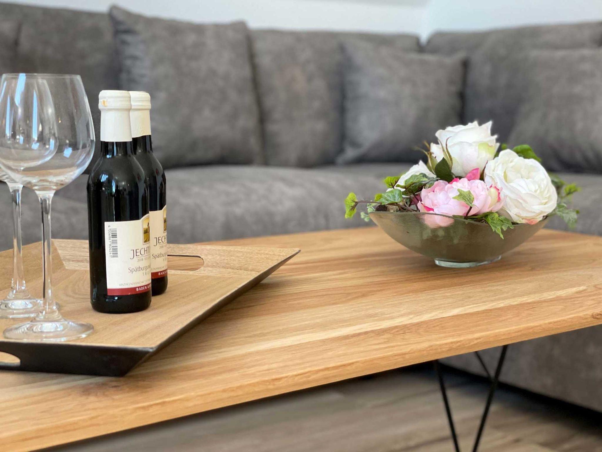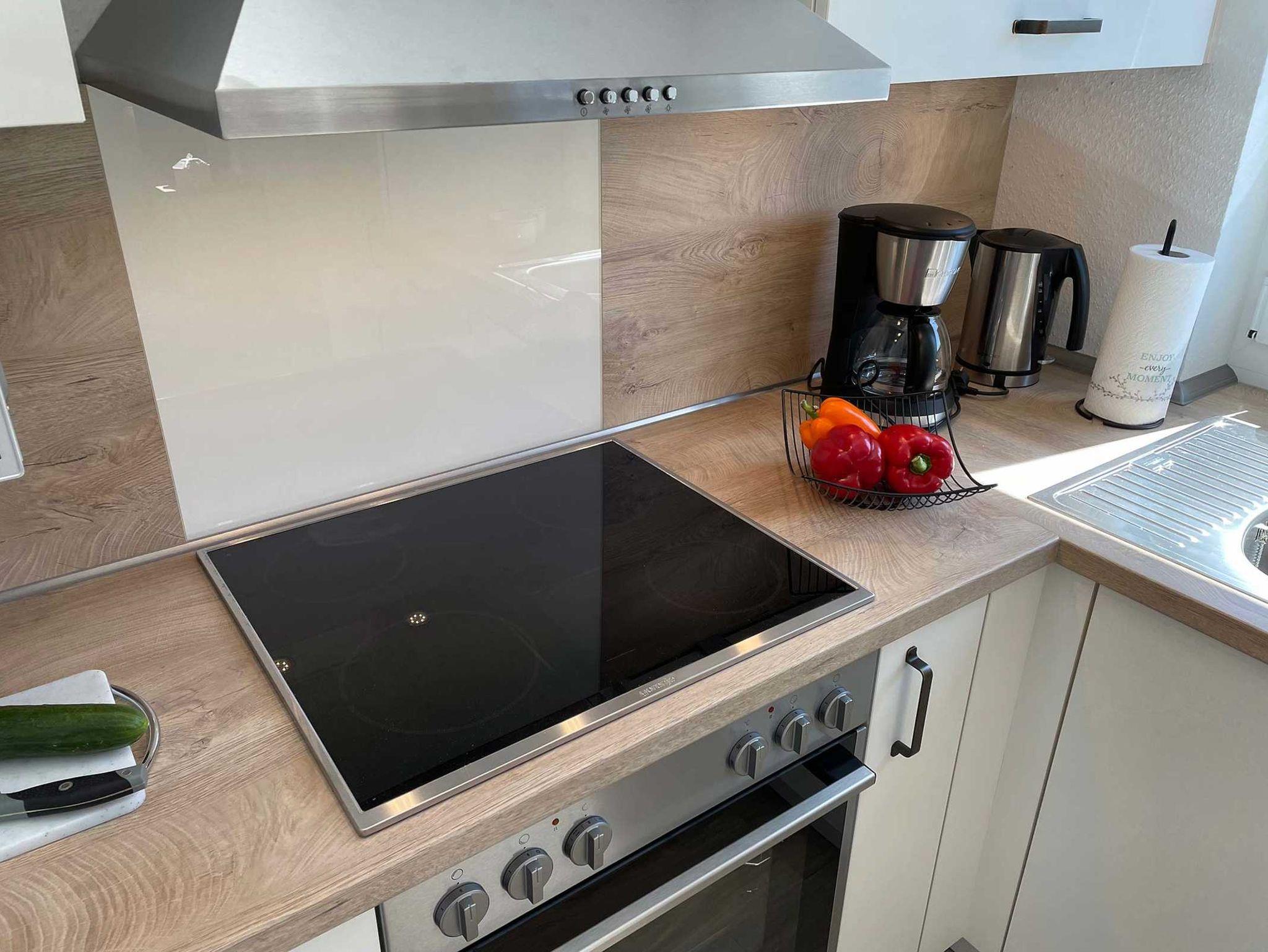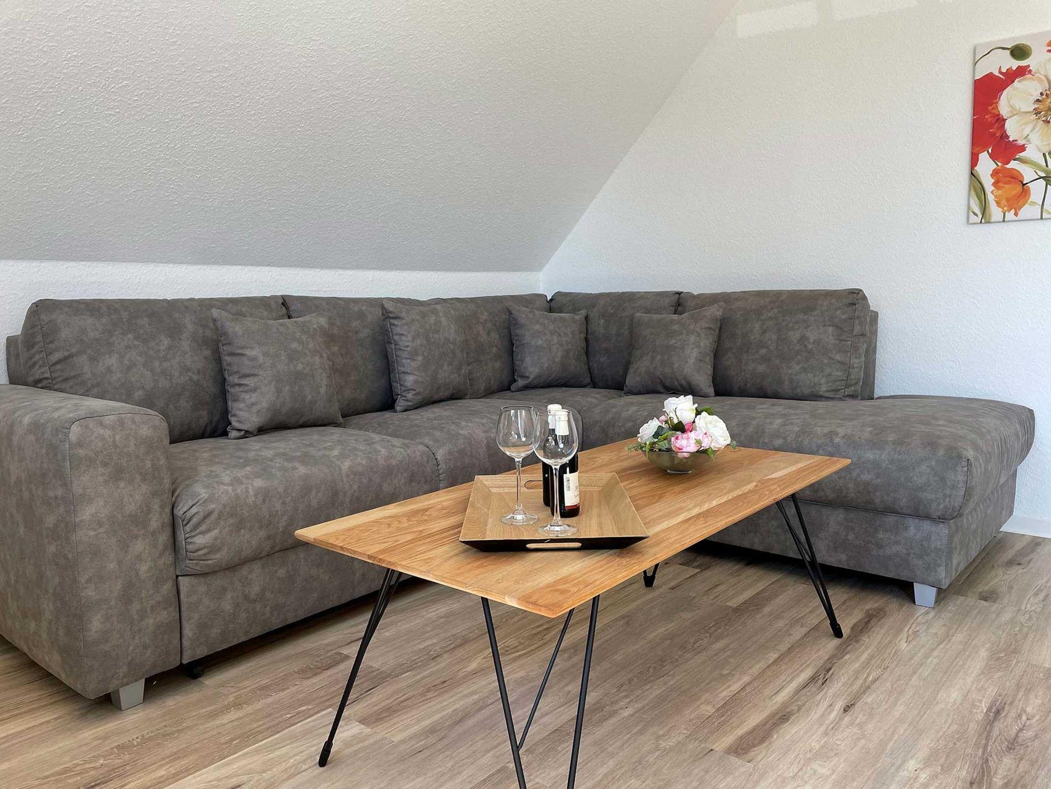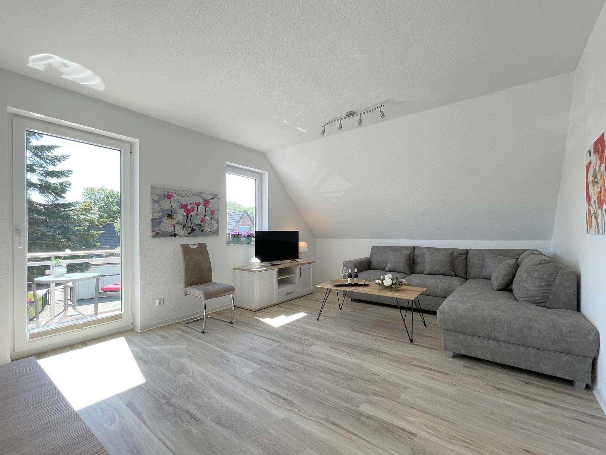 Unsere moderne Ferienwohnung mit Balkon im Obergeschoss bietet viel Platz für 2 Personen. Ein bequemes Doppelbett im separaten Schlafzimmer bietet echten Schlafkomfort. Im großen Sitzbereich können Sie herrlich entspannen. Mit der offenen Küchenzeile im Wohnbereich, inkl. Backofen und Spülmaschine, können Sie sich entspannt selbst versorgen. Information und Unterhaltung erhalten Sie auf dem großen Smart-TV und das kostenlose WLAN verbindet Sie mit der digitalen Welt. Modernes Bad mit Dusche/WC und Fenster. Frühstück inklusive.