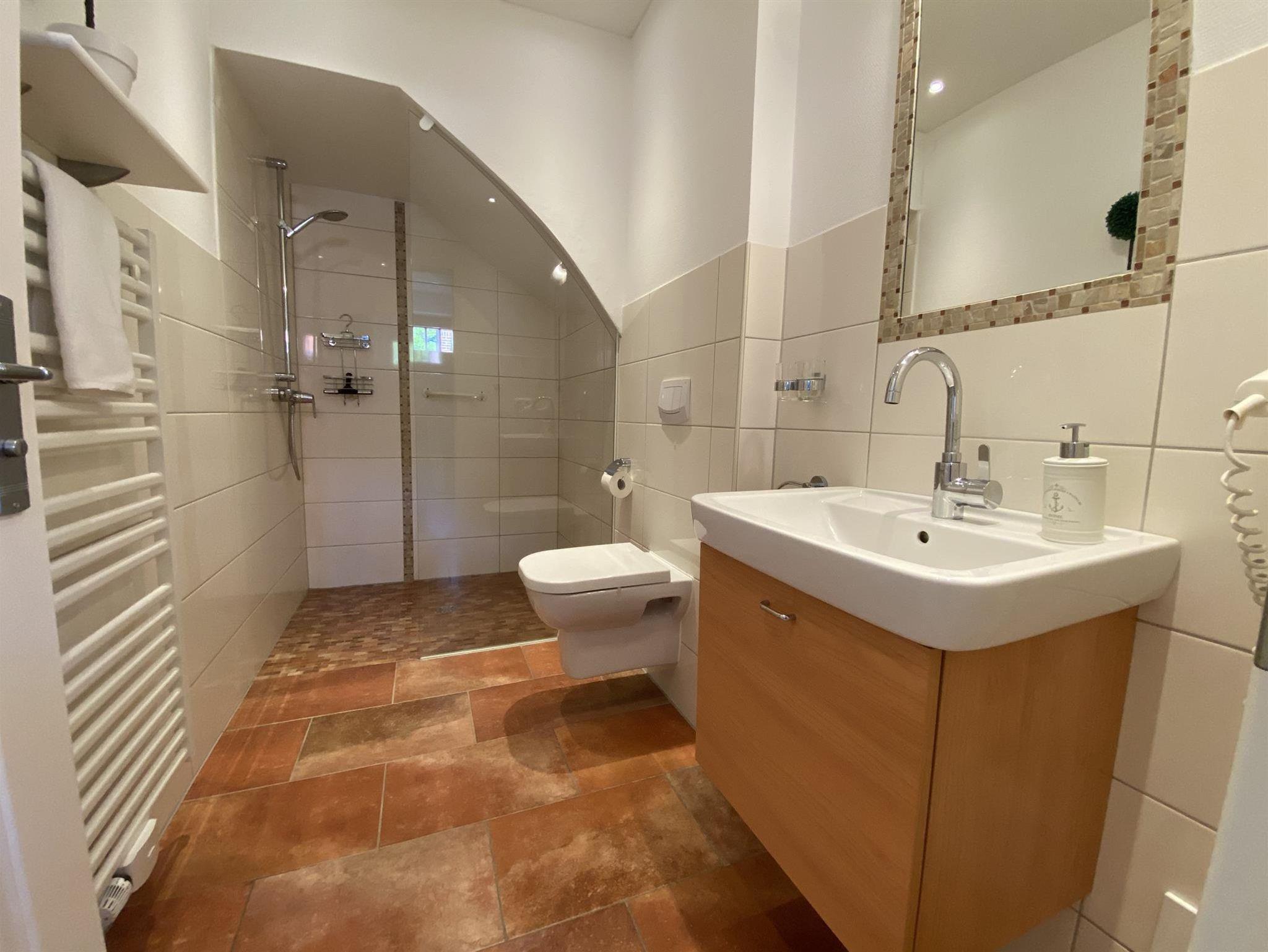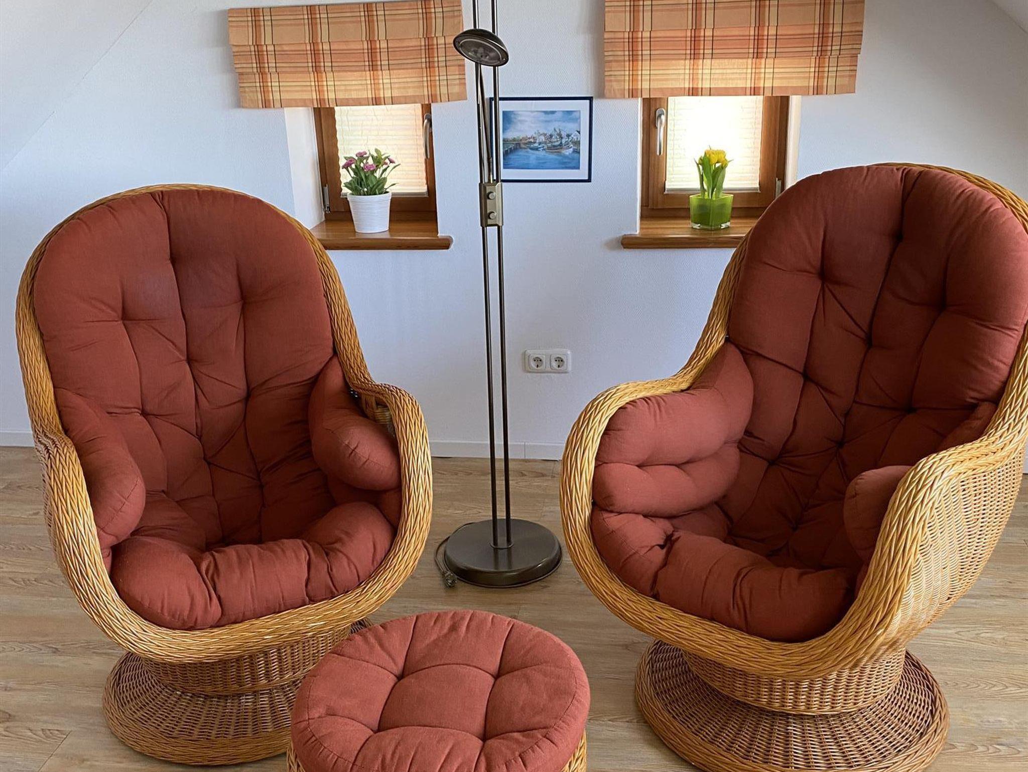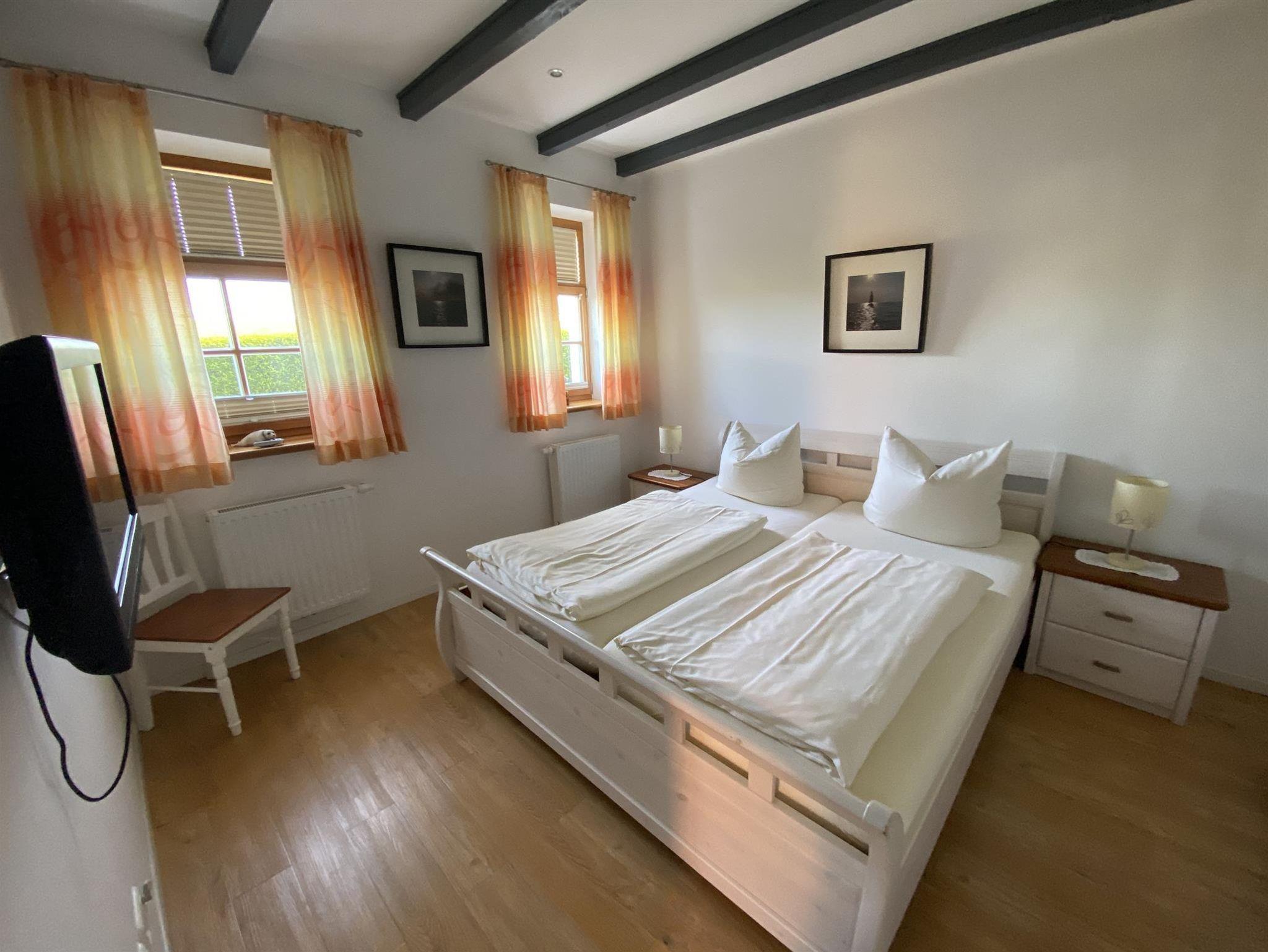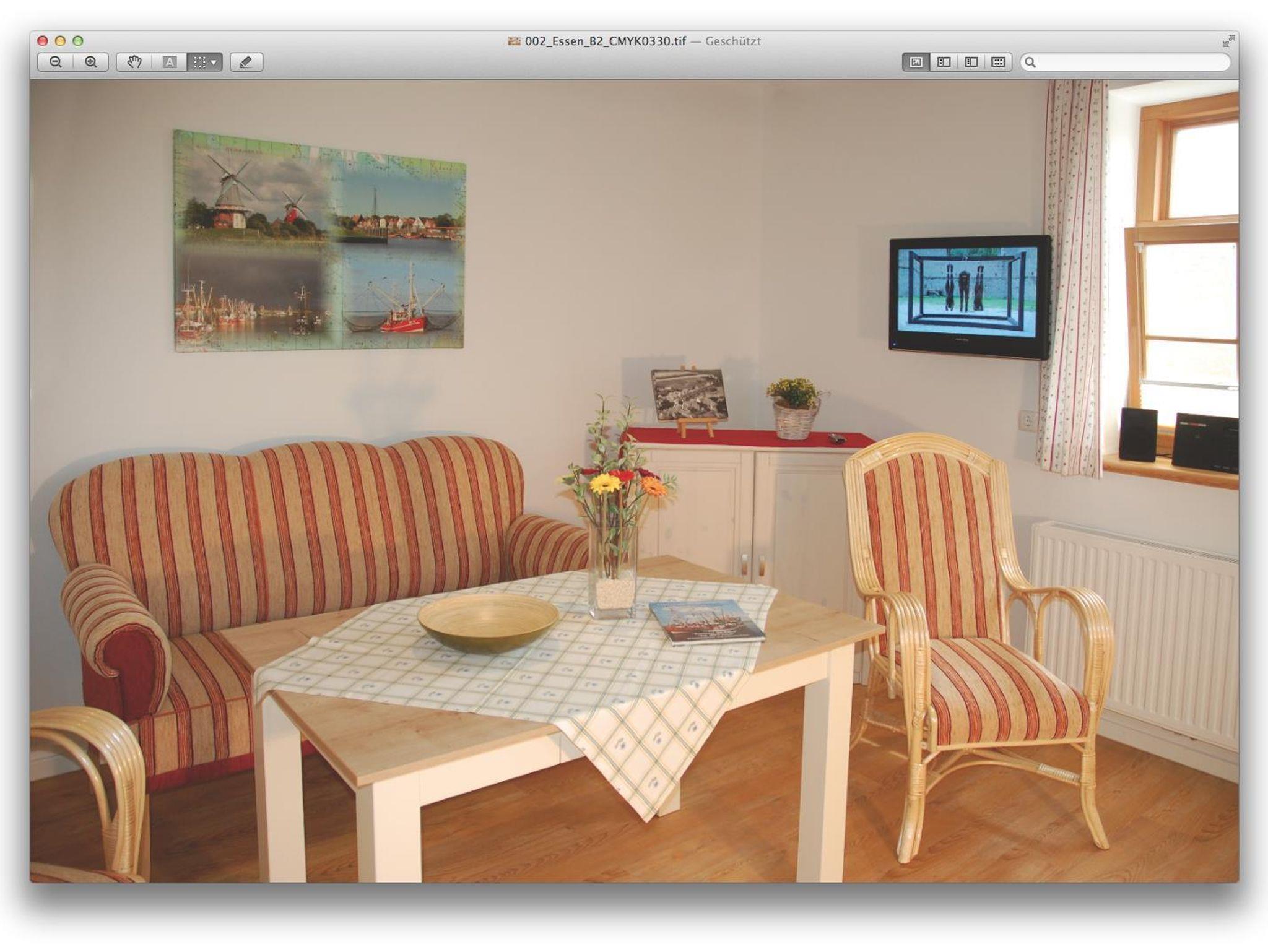 Die Wohnung 3 hat eine Wohnfläche von 90 m² und besteht aus einem großen Wohnzimmer mit Kamin, einer Essecke und Einbauküche, zwei Schlafzimmern mit TV und zwei Badezimmern. Auch diese Wohnung liegt direkt am Deich und ist nur 2 Minuten vom Ortskern entfernt.