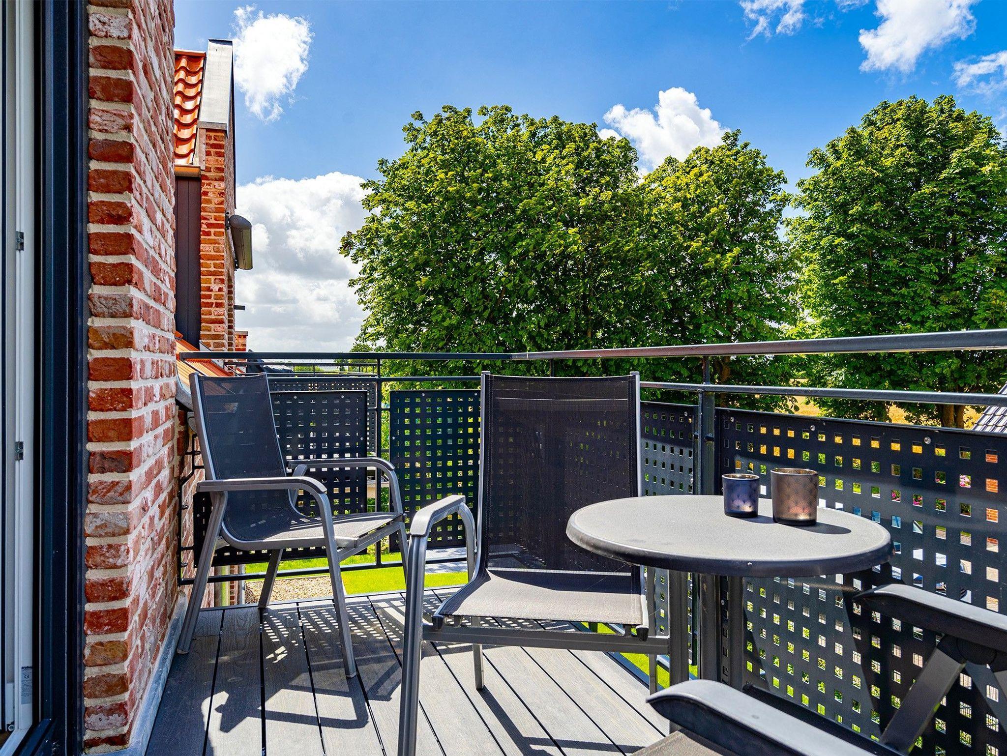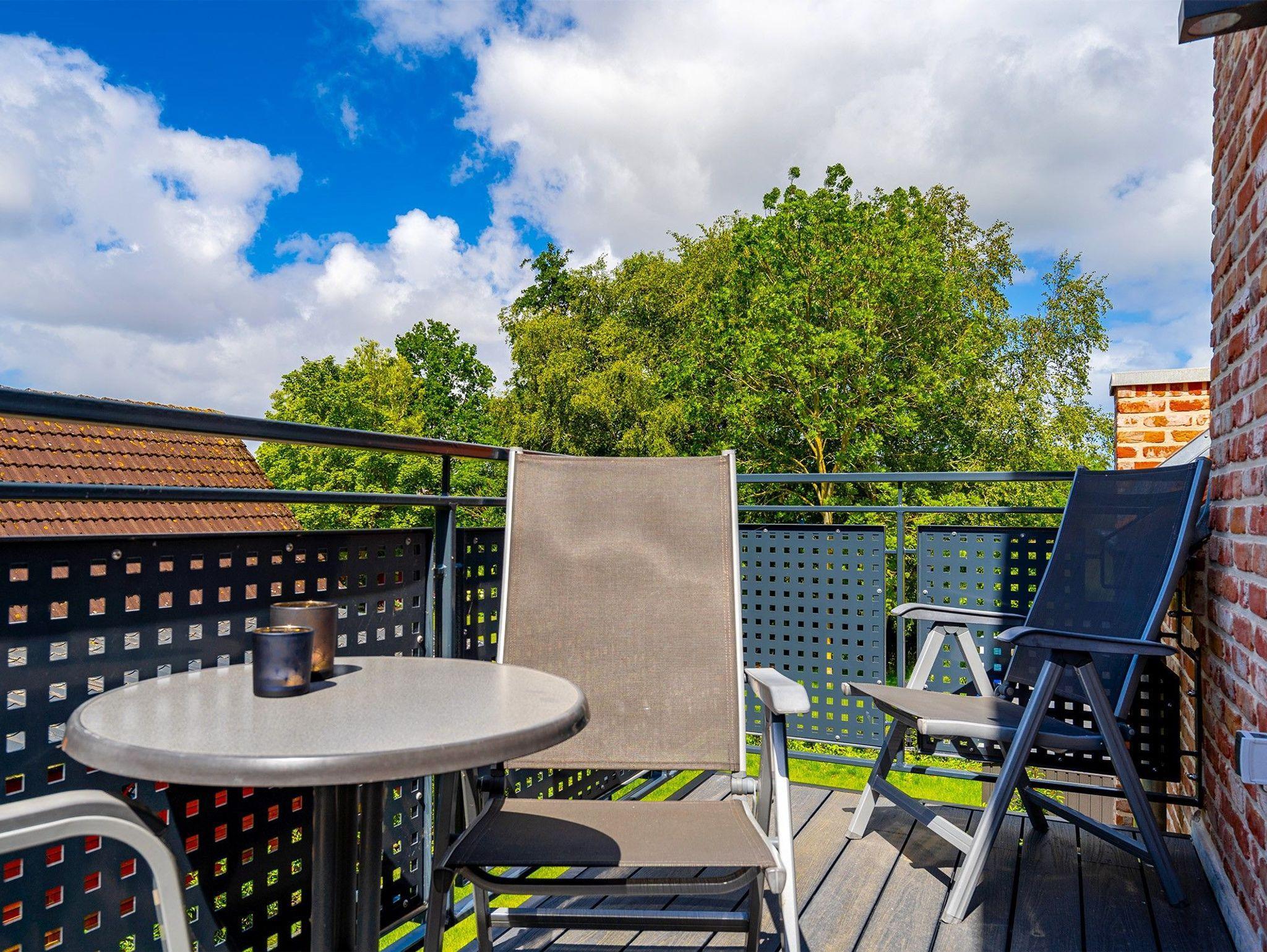 Moderne Ferienwohnung Paula in ruhiger Lage mit Blick auf die Greetsieler Zwillingsmühlen und Balkon.