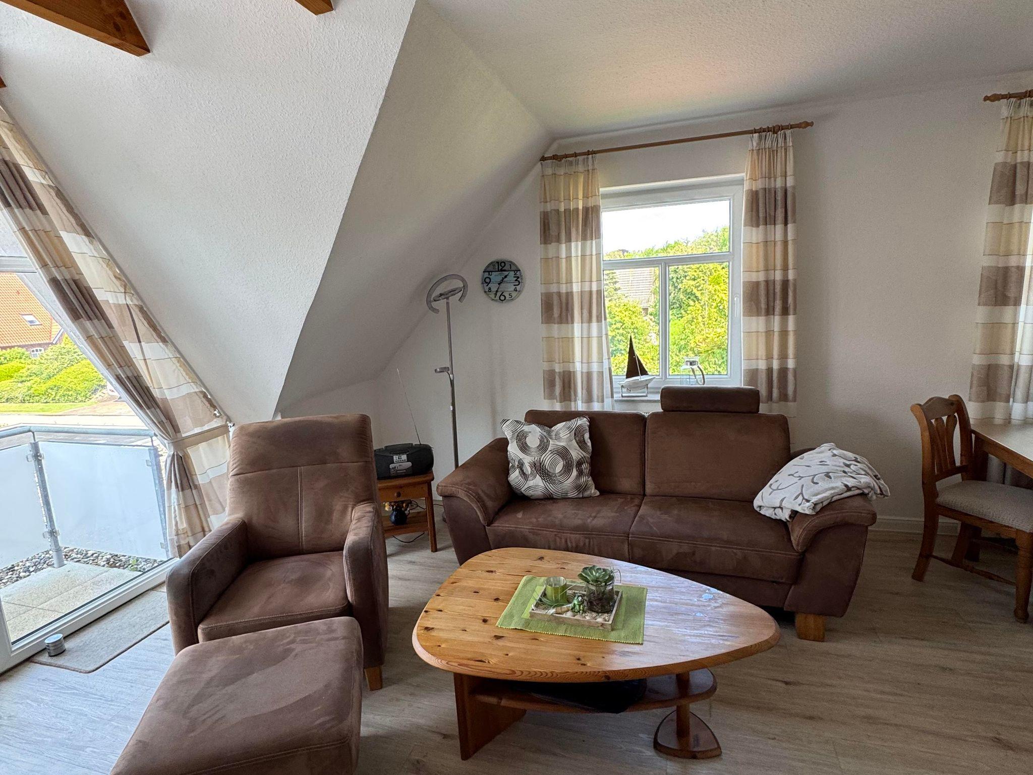 Helle, geräumige Ferienwohnung im OG. Das Haus (Bj. 1999) befindet sich in ruhiger Lage 5 bis 10 Gehminuten vom Ortskern entfernt. Die Wohnung besteht aus einem großen Wohn-/Essbereich mit Küche, einem Schlafzimmer mit Doppelbett und einem Duschbad. Zur Wohnung gehört ein Balkon (mit Gartenmöbel).