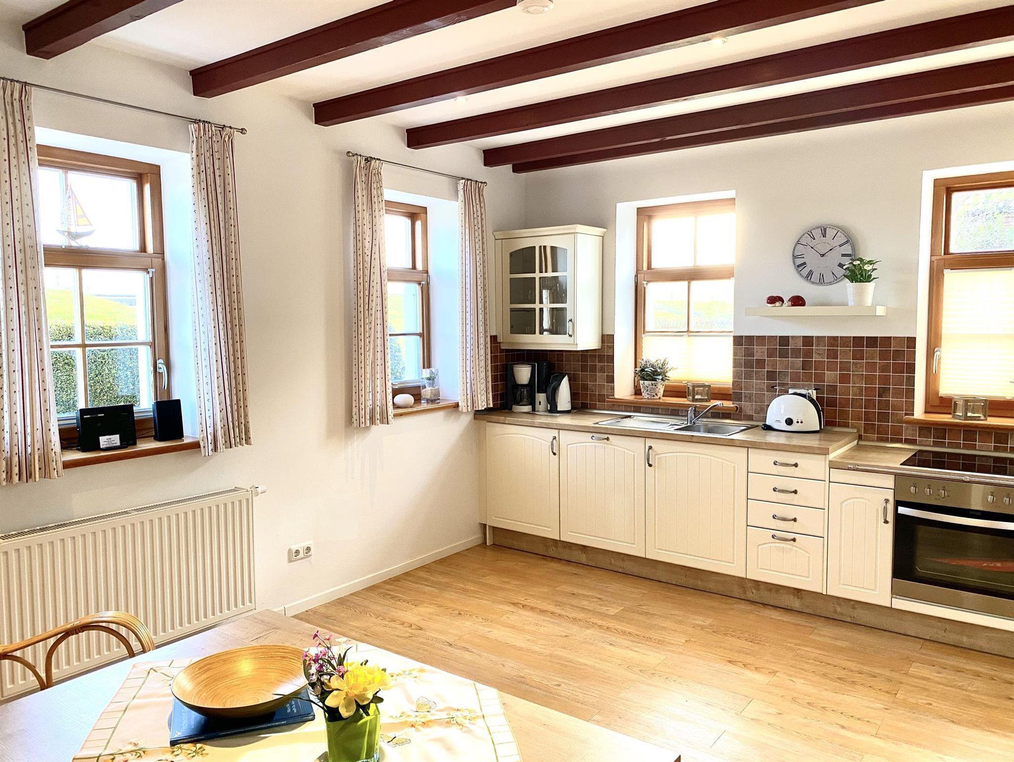 Die Wohnung 3 hat eine Wohnfläche von 90 m² und besteht aus einem großen Wohnzimmer mit Kamin, einer Essecke und Einbauküche, zwei Schlafzimmern mit TV und zwei Badezimmern. Auch diese Wohnung liegt direkt am Deich und ist nur 2 Minuten vom Ortskern entfernt.
