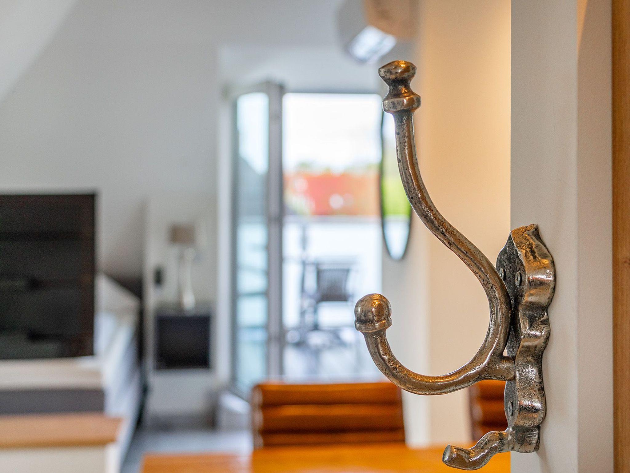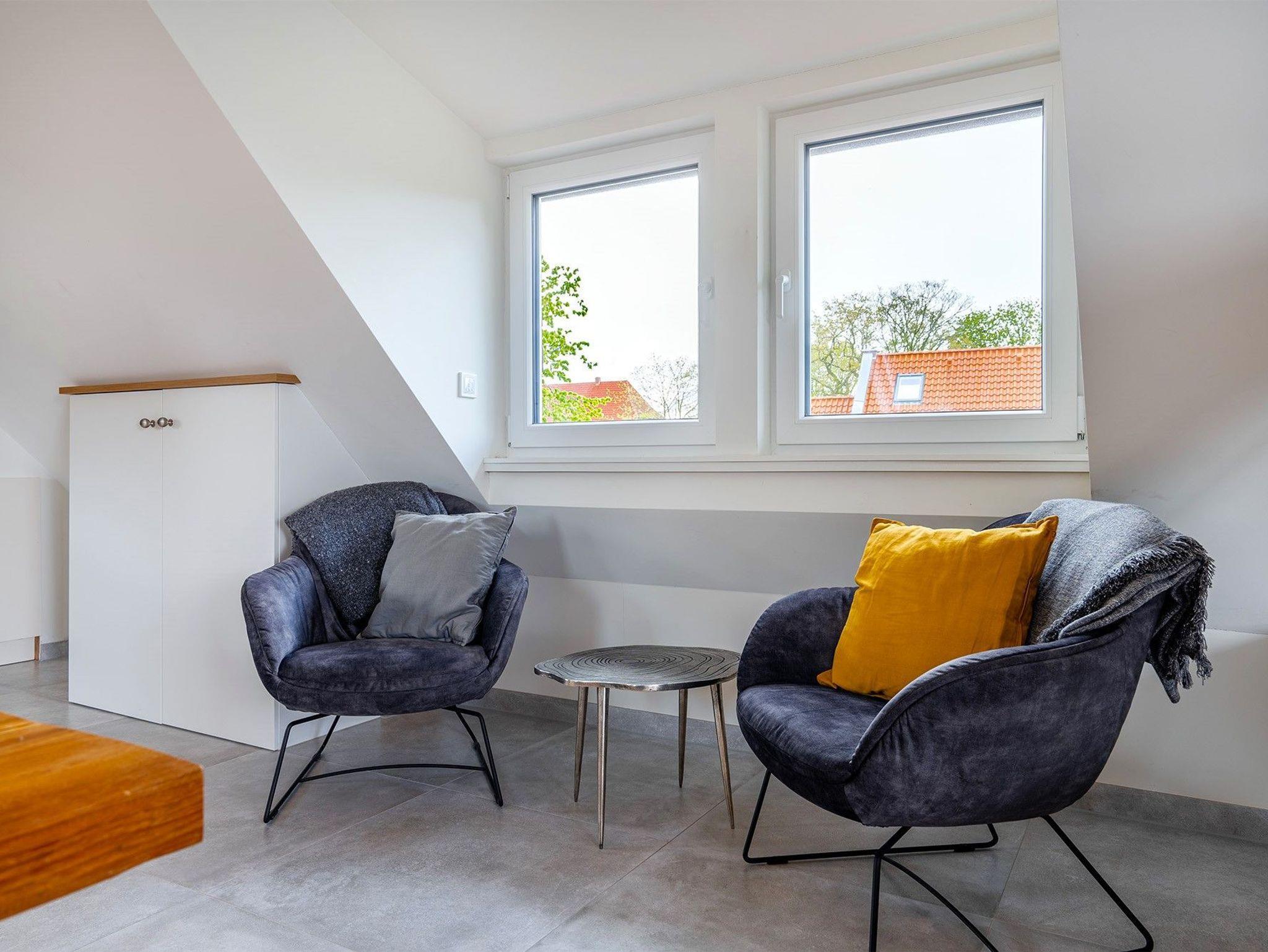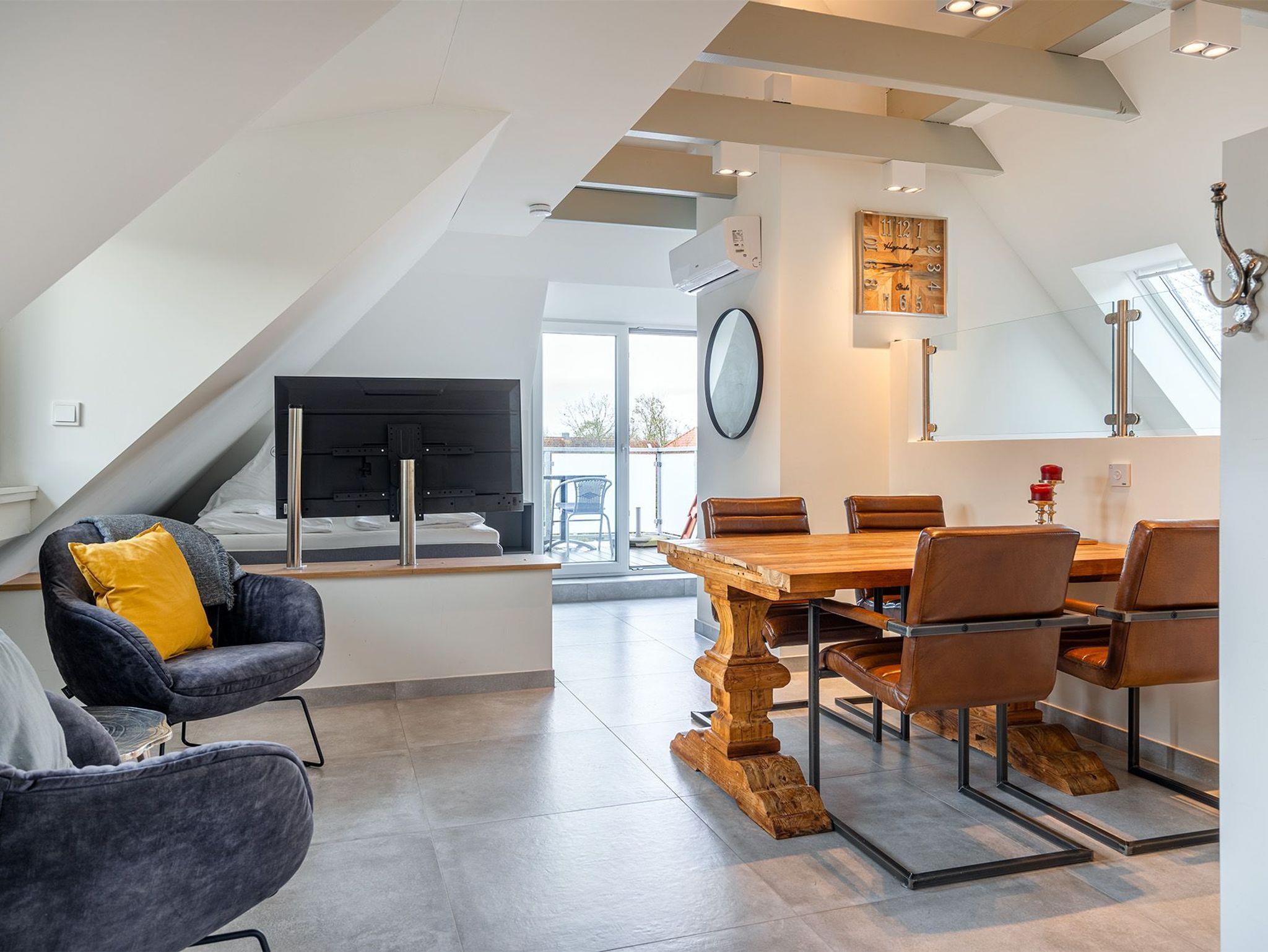 Klein aber fein - das beschreibt unsere Ferienwohnung Die Zimmerei 3 am Besten. Diese erreichen Sie über einen separaten Eingang. Zentral aber dennoch ruhig gelegen, befindet sich die Wohnung im Dachgeschoss eines Hauses mit insgesamt fünf Wohneinheiten. Schon beim Hereintreten in diese gemütlich ausgestattete Wohnung kann man sich nur wohlfühlen! Im etwa 35qm großen und lichtdurchfluteten Wohnraum, der mit einem offenen Schlaf- und Wohnbereich im Loftstil gestaltet wurde finden Sie eine vollausgestattete Küche, einen Esstisch und ein bequemes Boxspringbett. Das Tageslichtbad ist praktisch geschnitten und bietet eine bodengleiche Dusche, sowie eine Waschmaschine. Vom Wohnbereich aus gelangen Sie auf die Dachterrasse mit Blick über Greetsiel- Platz zum Frühstücken, zum Sonnen und zum frische Nordluft tanken. Selbstverständlich steht Ihnen ein eigener Parkplatz am Haus zur Verfügung. Sollten Sie mit einem E-Auto anreisen, verfügt das Objekt auch über eine Ladesäule, die Sie hinzu buchen können.