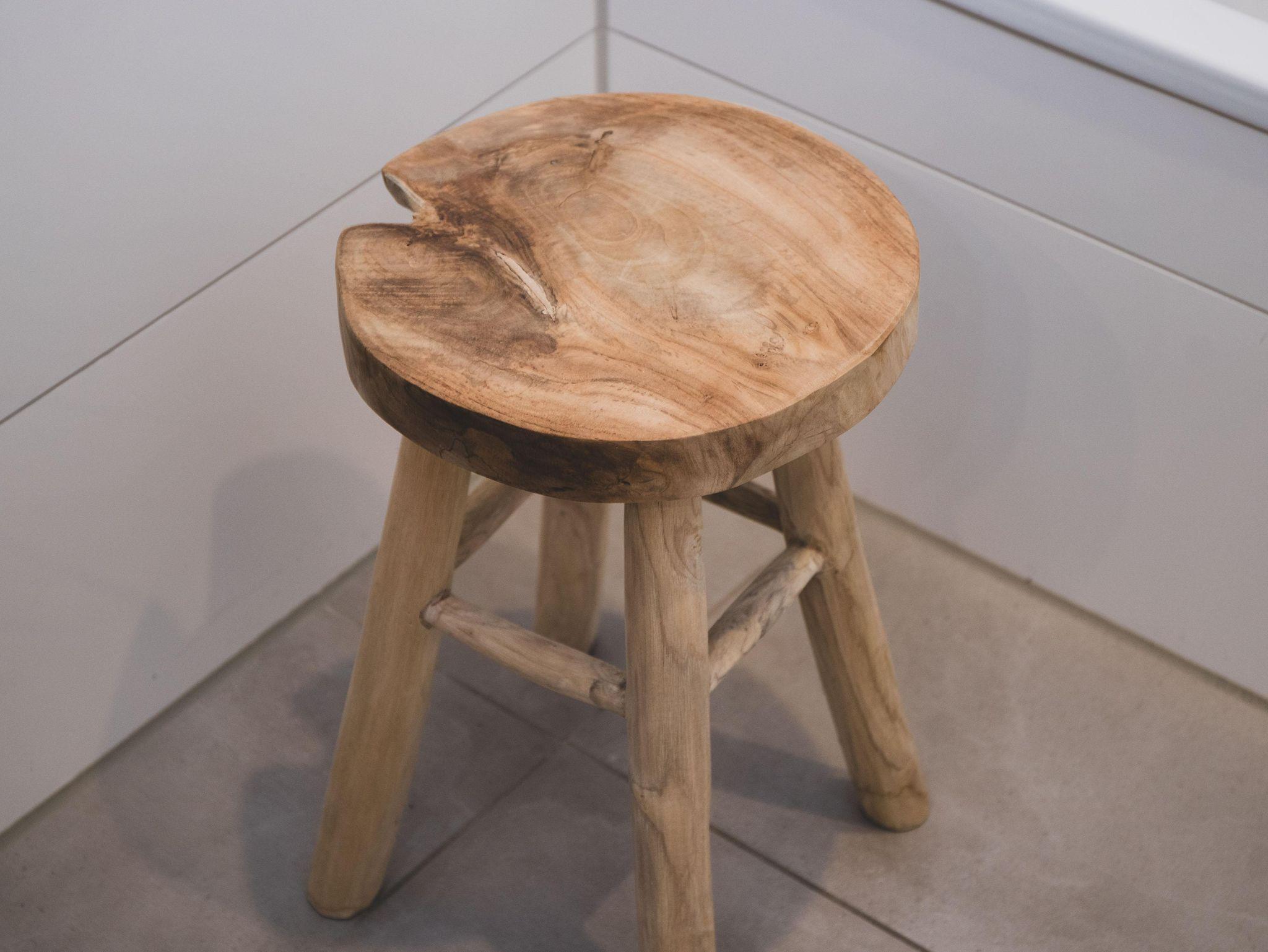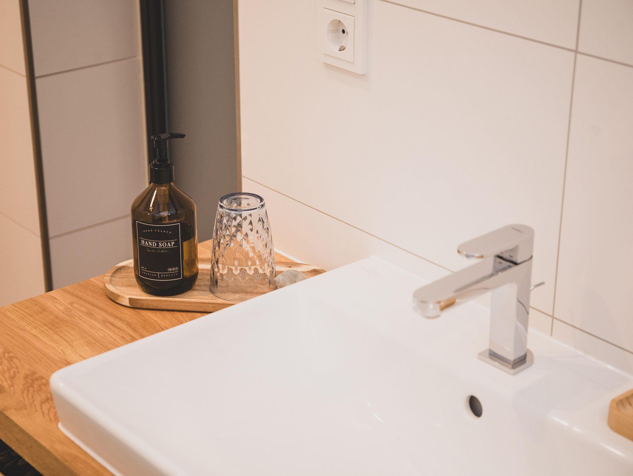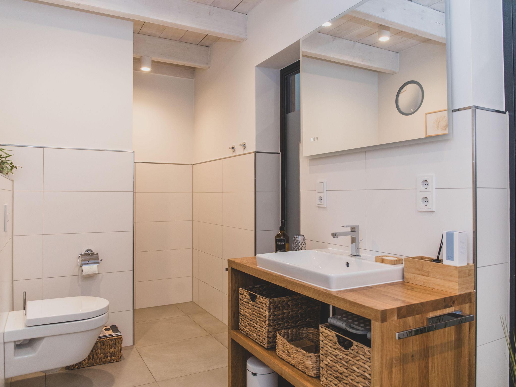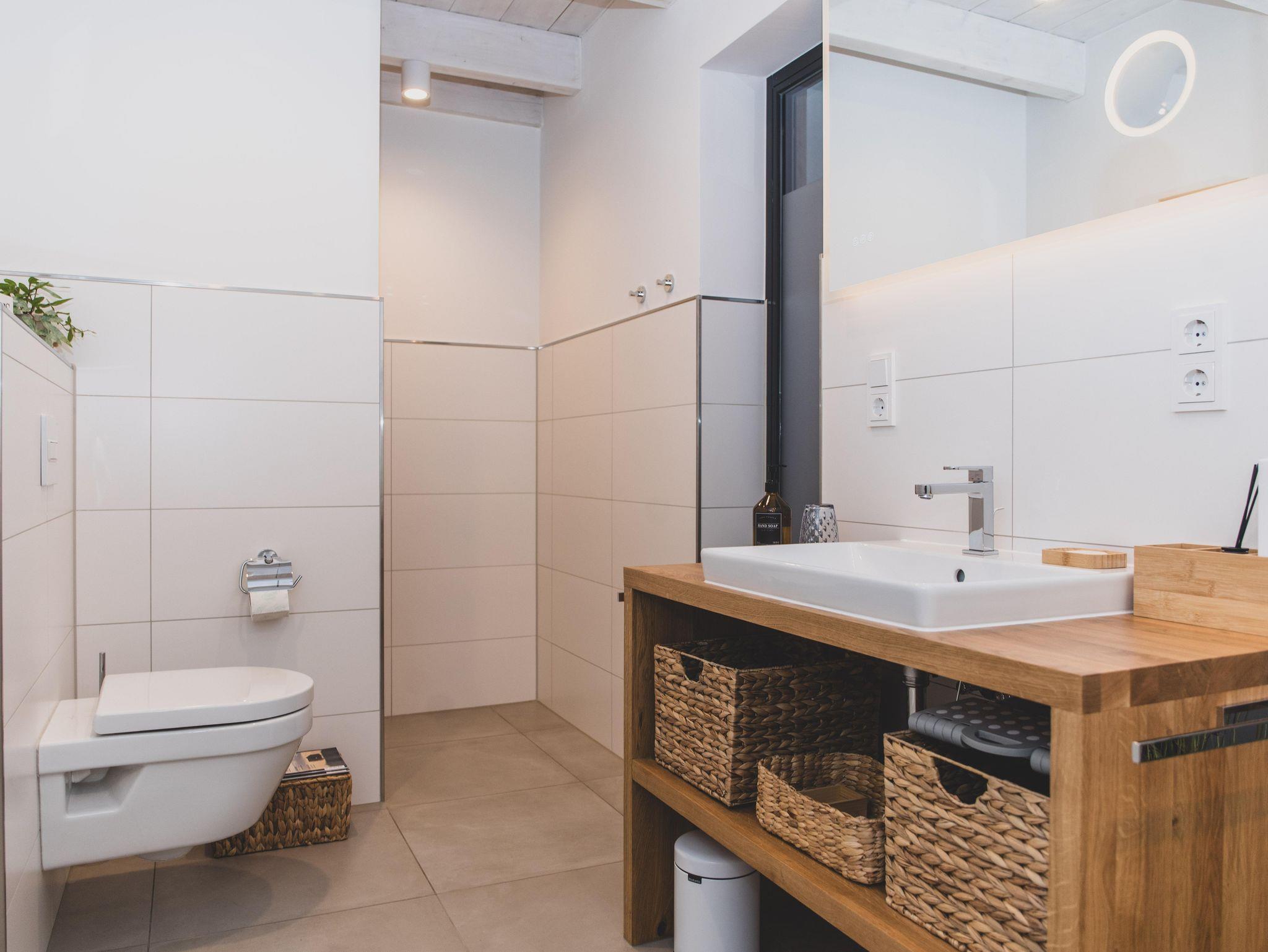 Das geräumige Badezimmer ist mit WC, einer ebenerdigen Dusche und einem großen Waschtisch mit Holz-Ablageflächen ausgestattet.