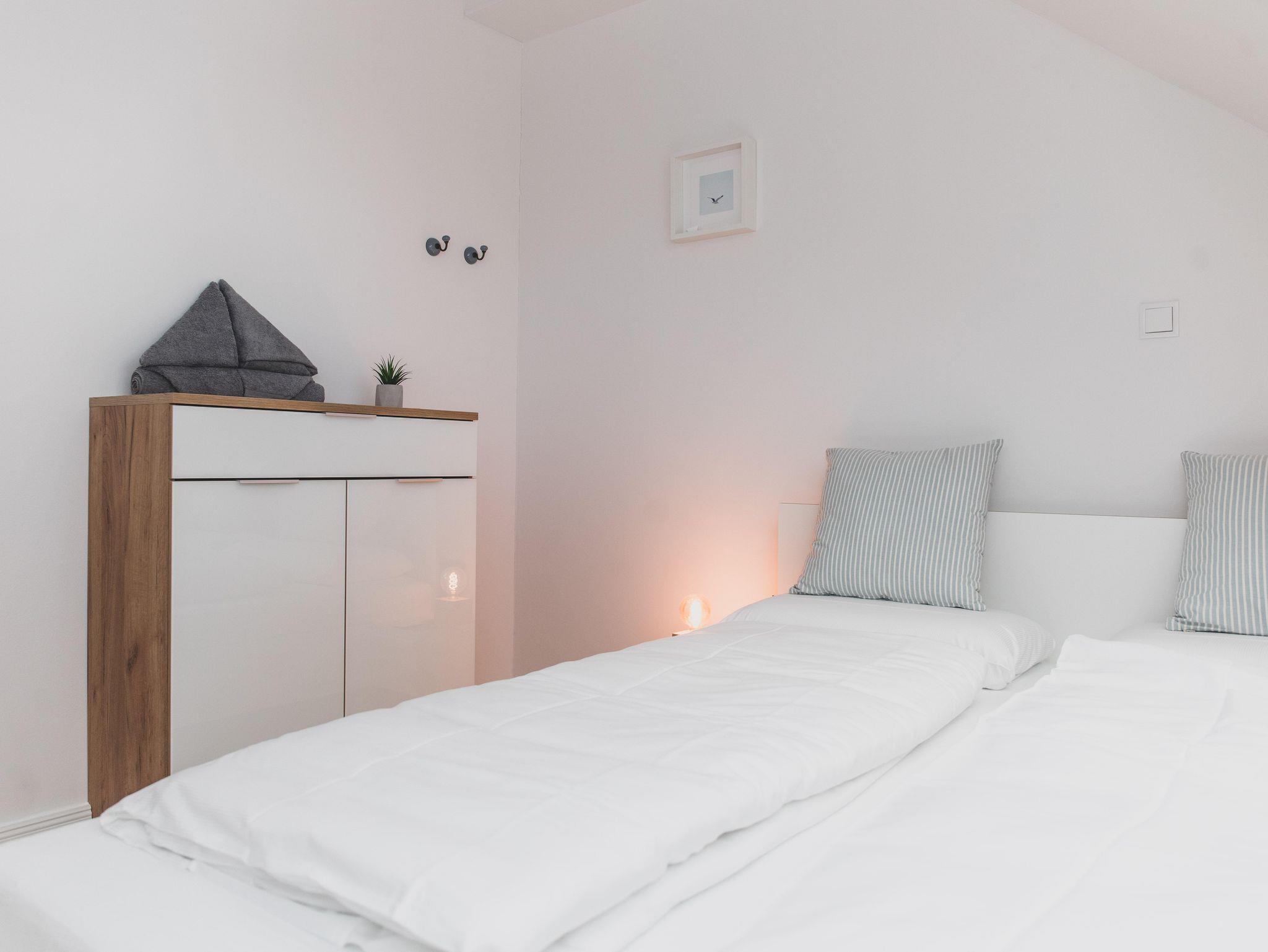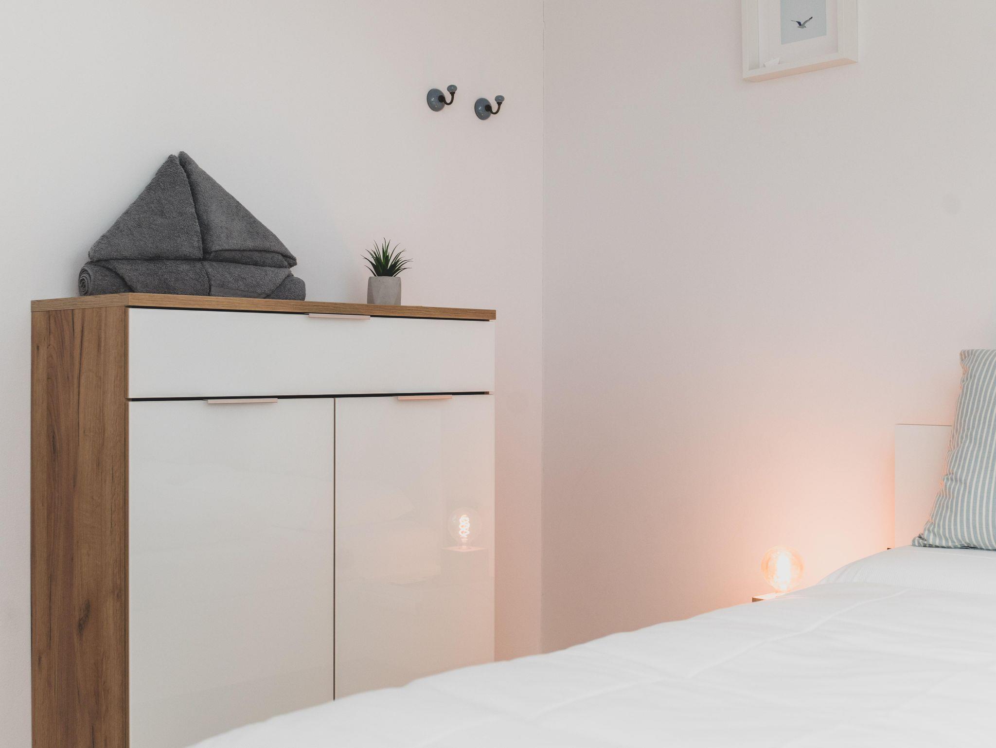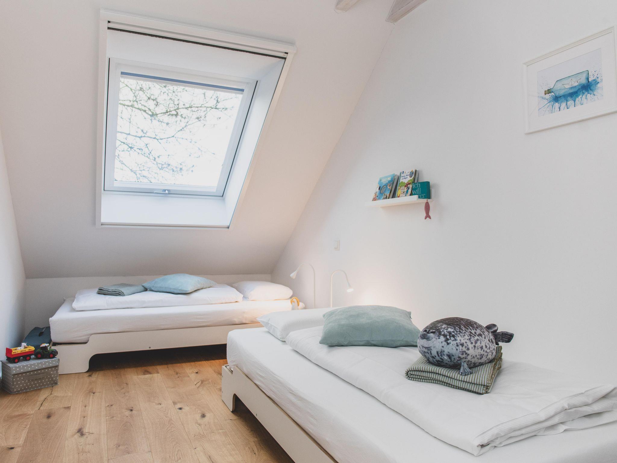 In der 2-geschossigen Ferienwohnung BENTE erwarten euch im EG ein Wohn-Essbereich mit offener Küche, einem Gäste-WC, Diele mit Garderobe und einem Abstellraum. Im OG befinden sich zwei Schlafzimmer und ein Bad mit Dusche, Badewanne und WC.