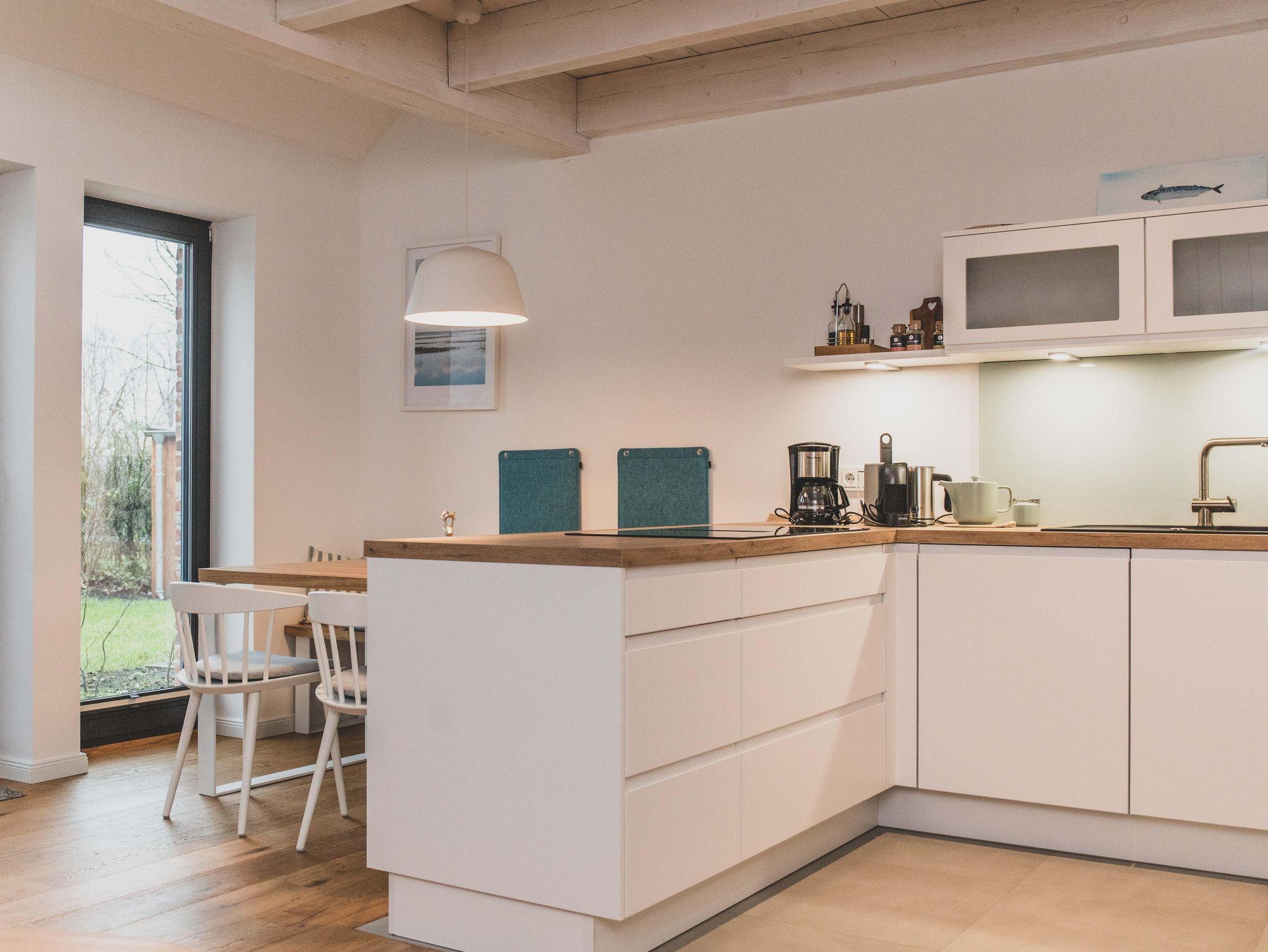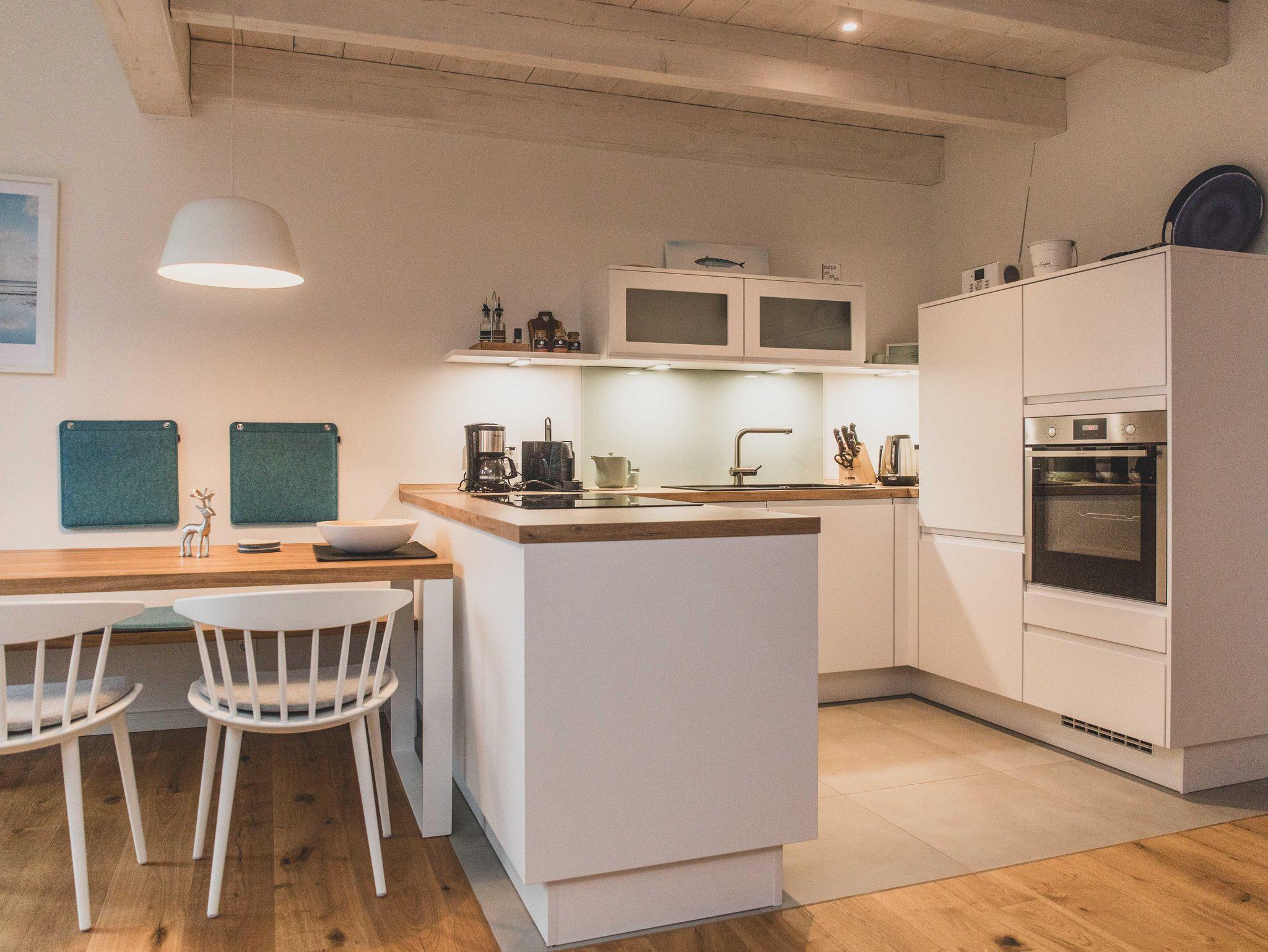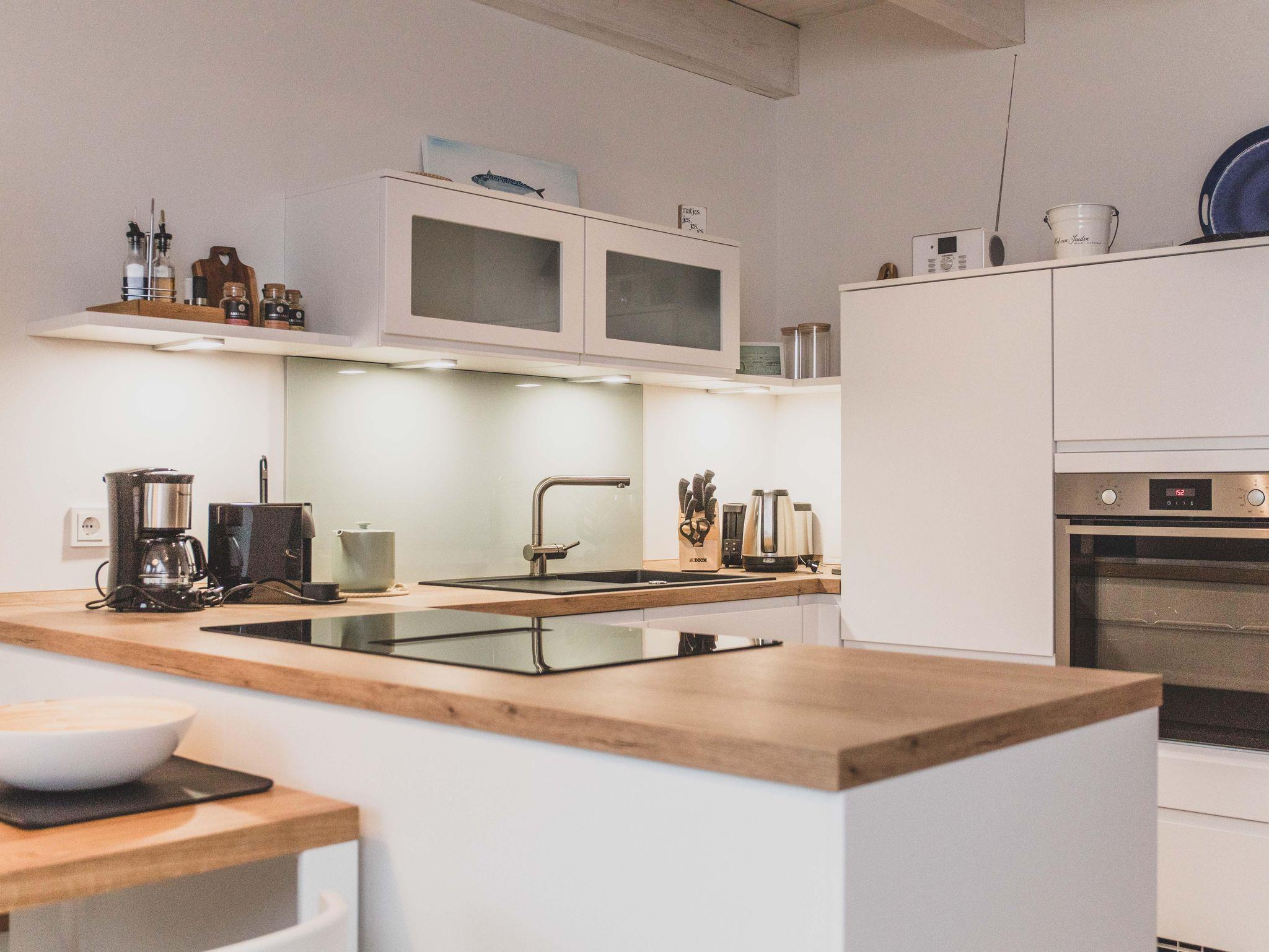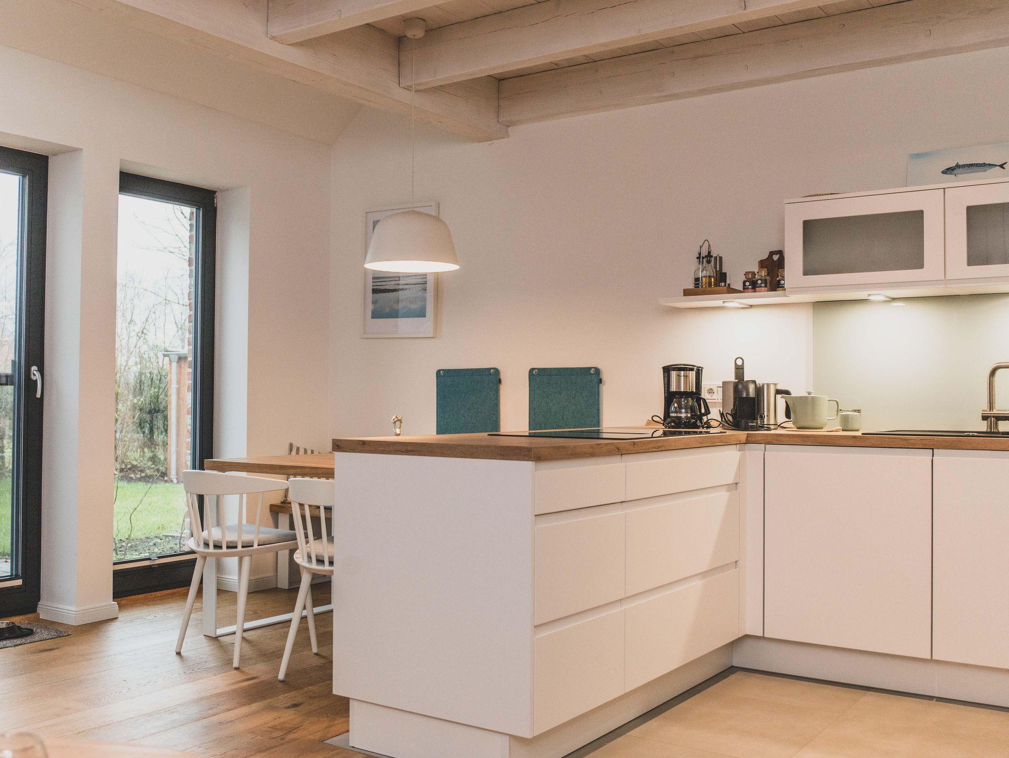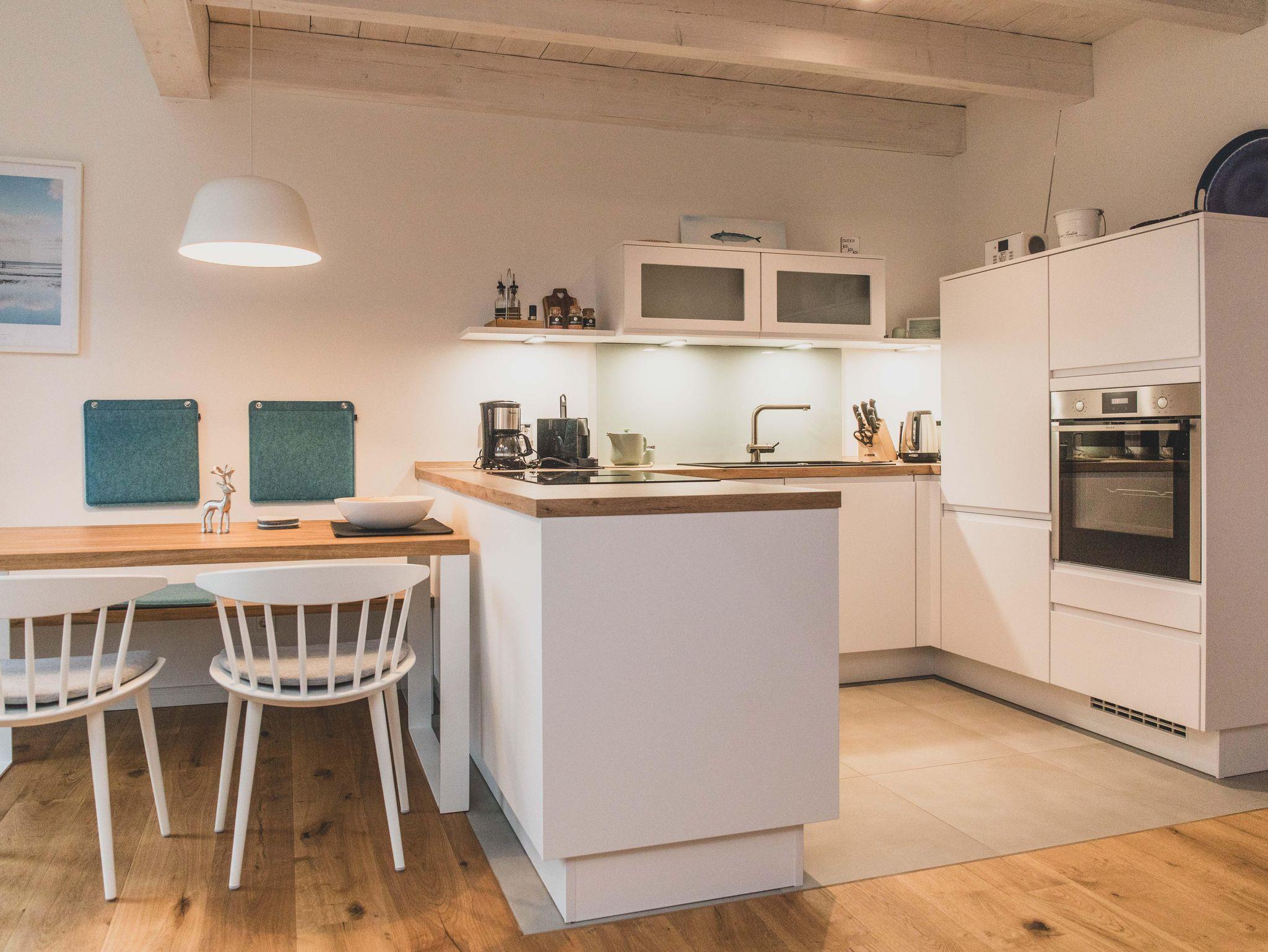 Freizeitköche freuen sich über die umfangreich ausgestattete Küche mit Bora-Kochfeld, hoch eingebautem Backofen, Mikrowelle, Geschirrspüler und Kühlschrank. Startet euren Tag mit einer Tasse heißen Ostfriesentee oder einem Espresso aus der Nespresso-Maschine auf der gemütlichen Bank im Essbereich mit Blick auf die Terrasse und ins Grüne.