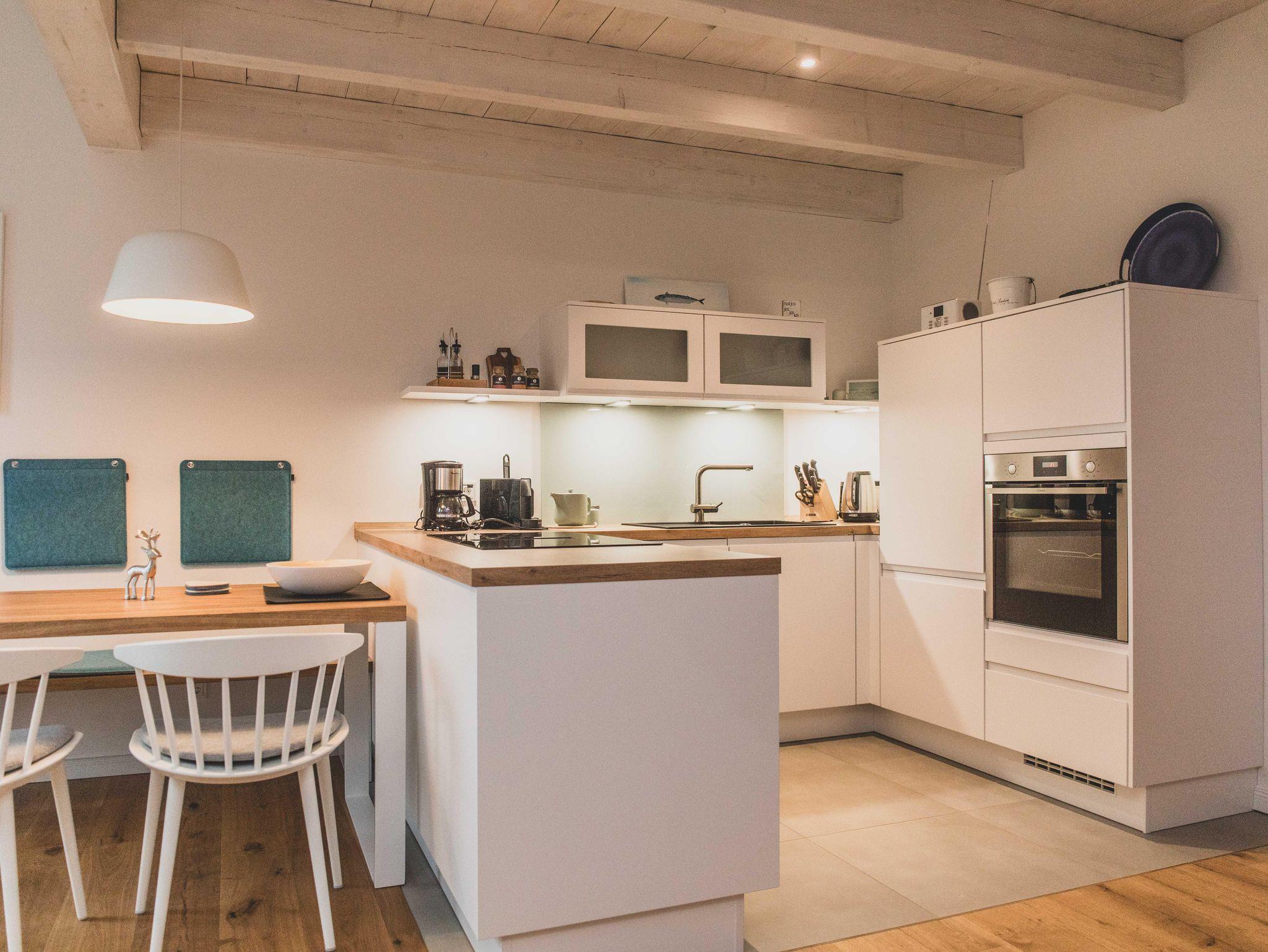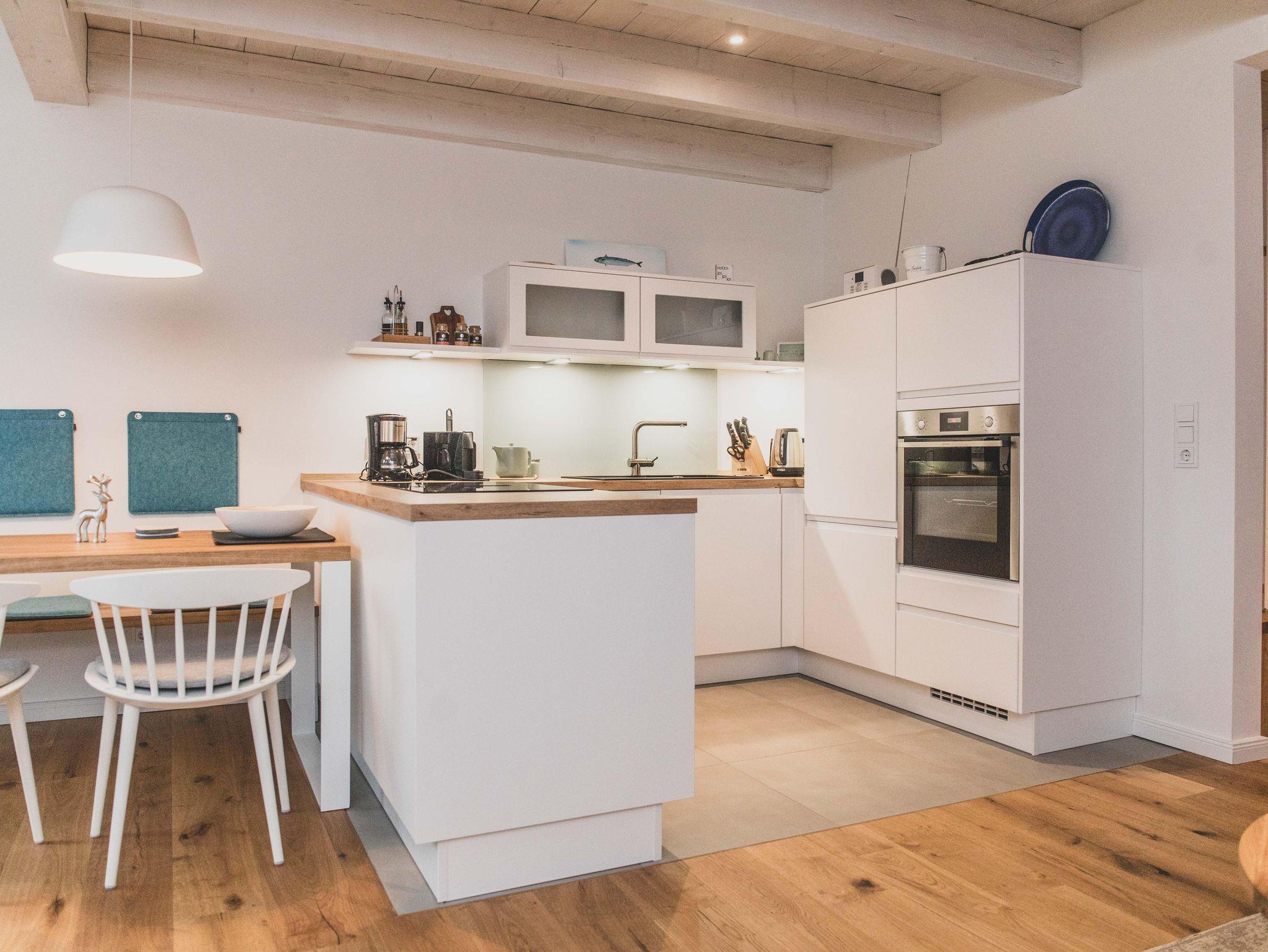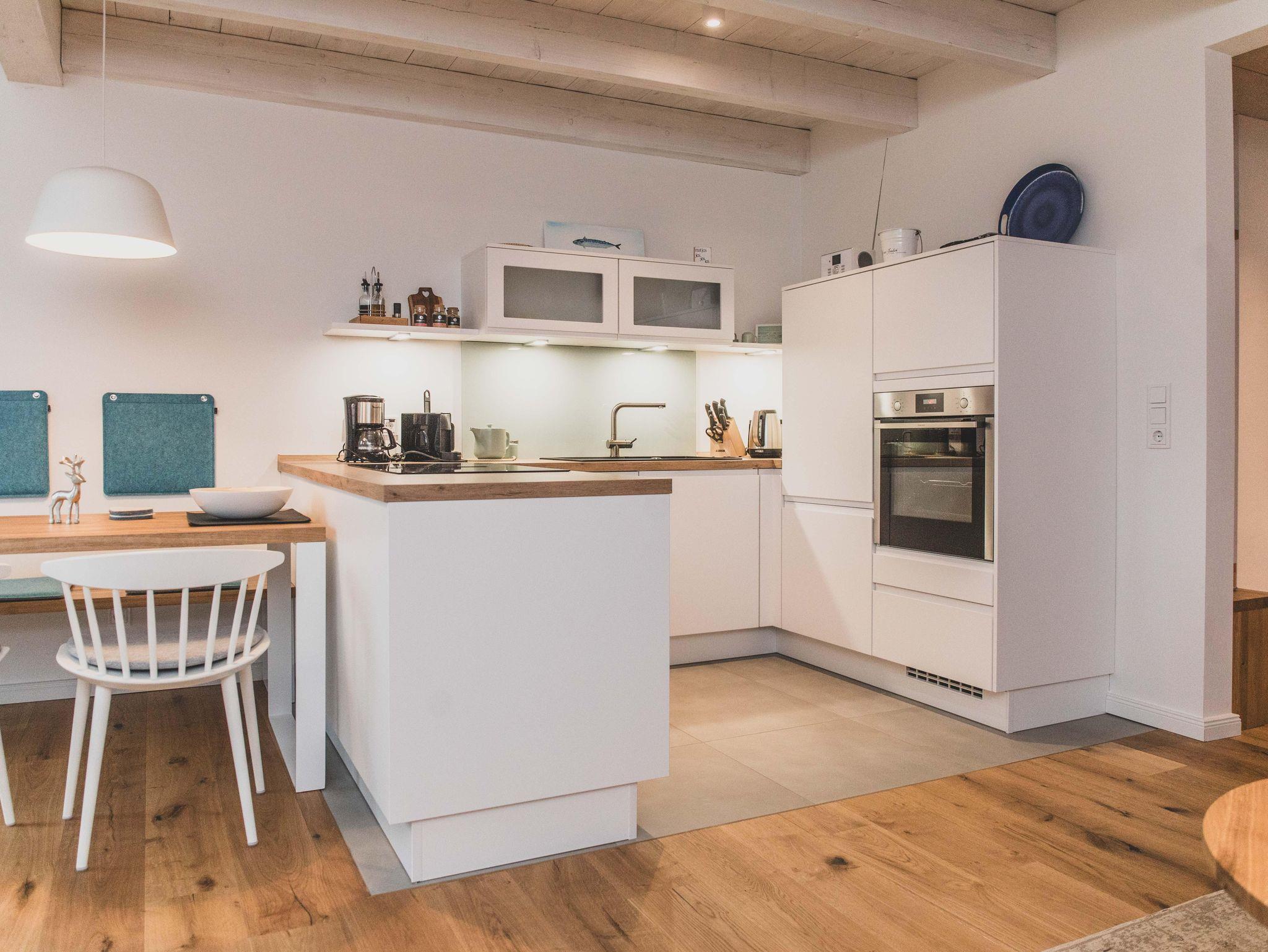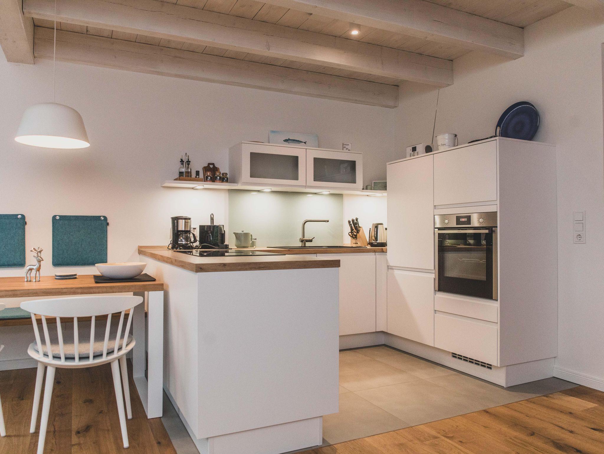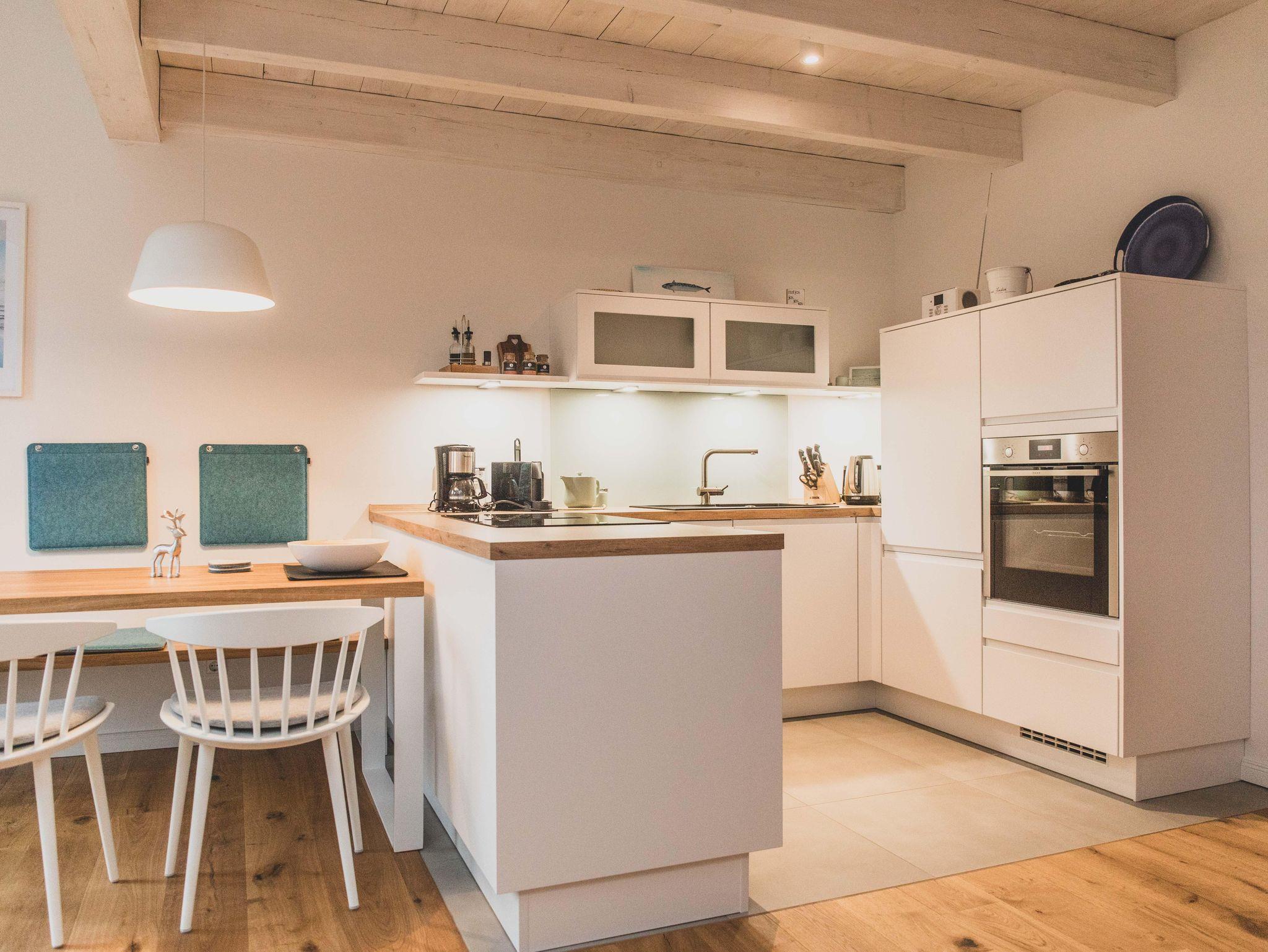 Freizeitköche freuen sich über die umfangreich ausgestattete Küche mit Bora-Kochfeld, hoch eingebautem Backofen, Mikrowelle, Geschirrspüler und Kühlschrank. Startet euren Tag mit einer Tasse heißen Ostfriesentee oder einem Espresso aus der Nespresso-Maschine auf der gemütlichen Bank im Essbereich mit Blick auf die Terrasse und ins Grüne.
