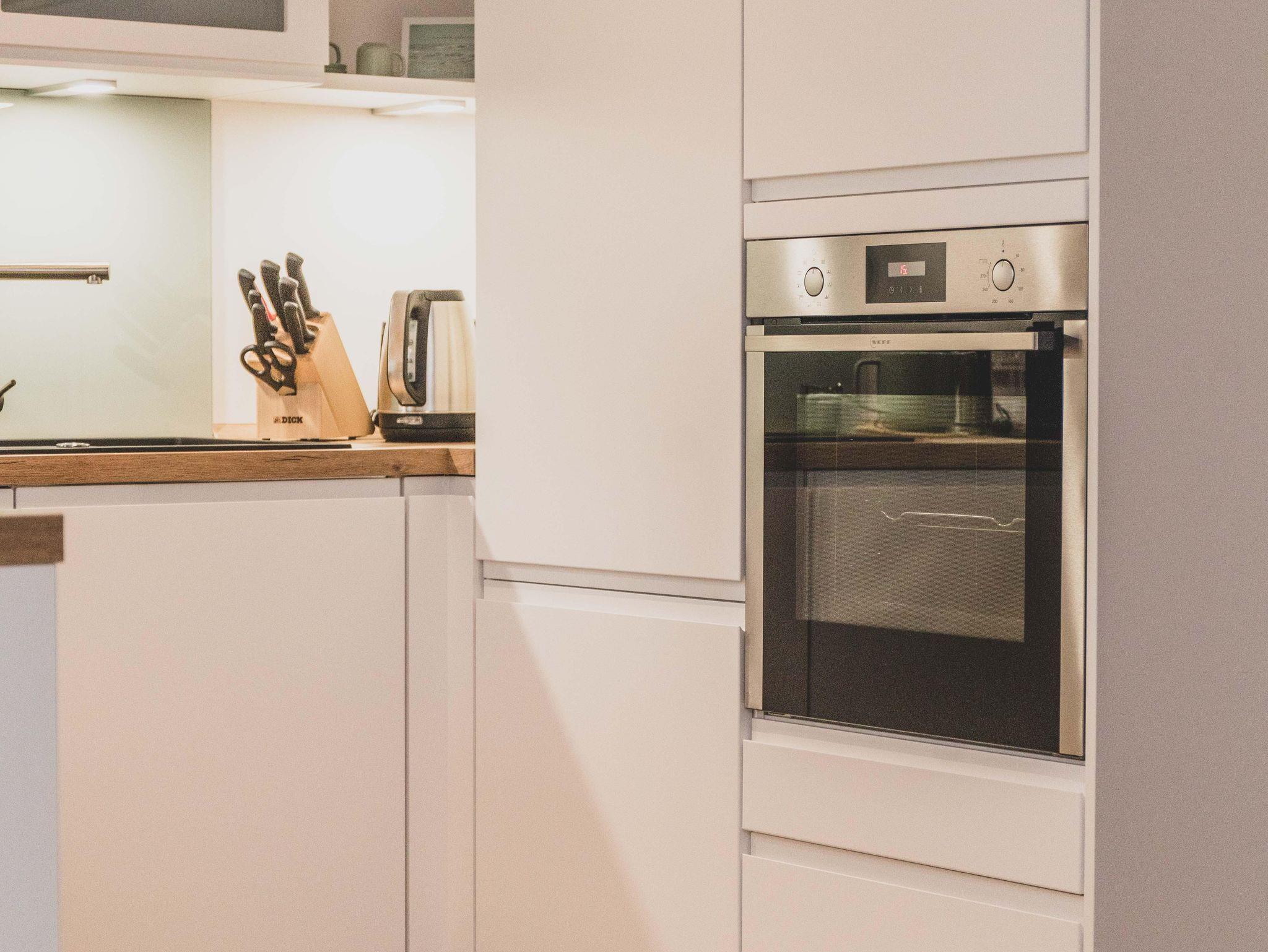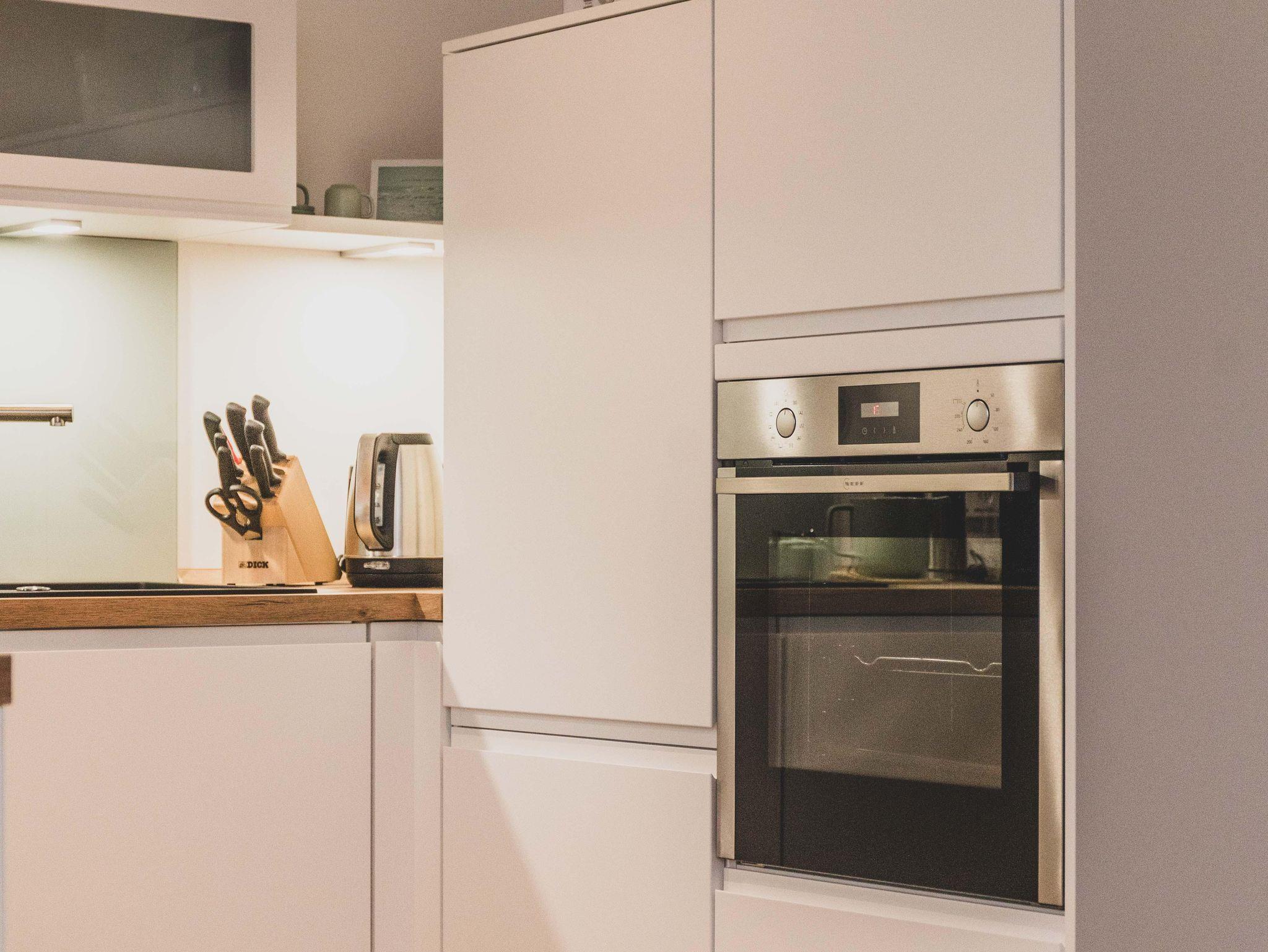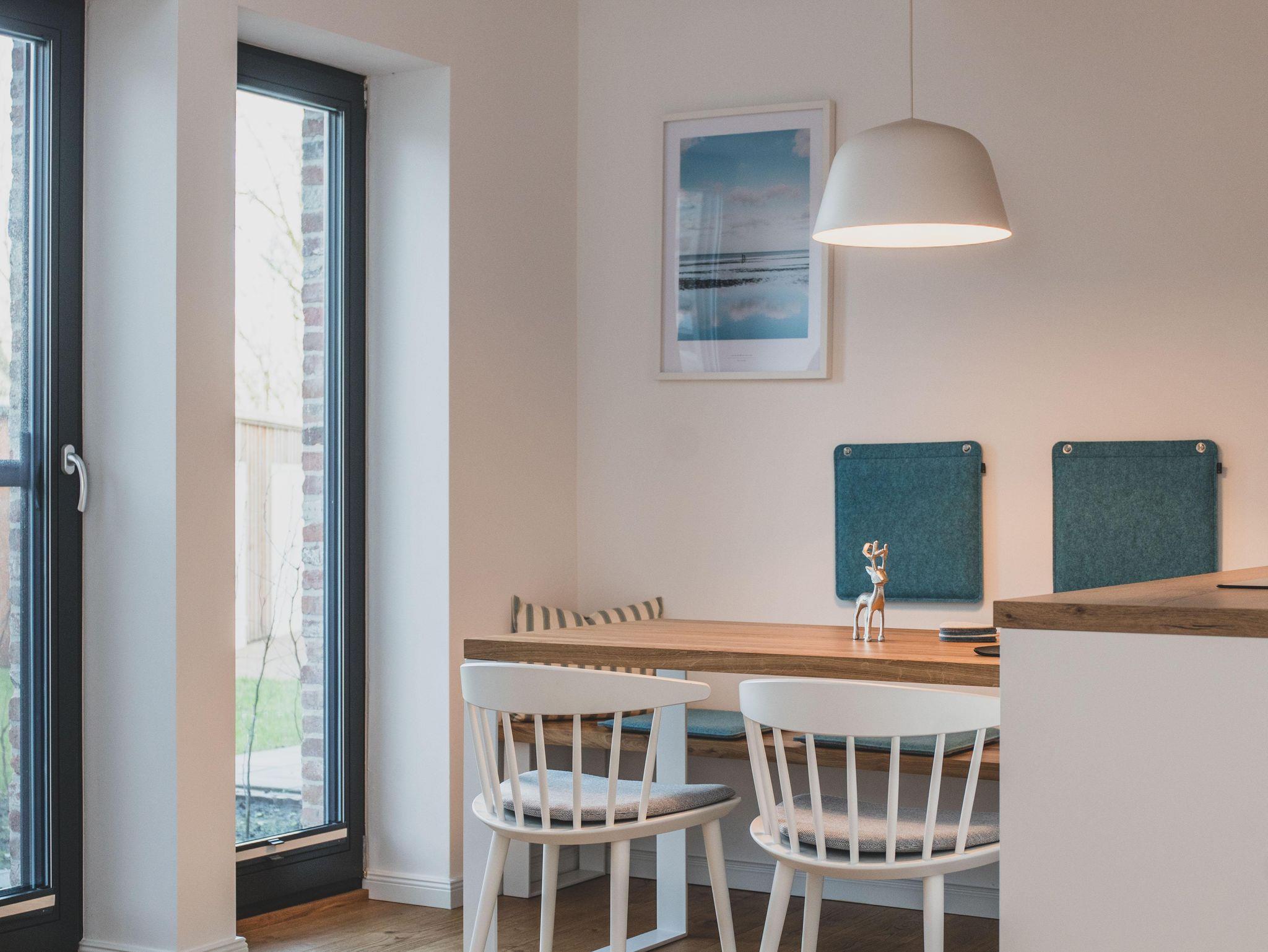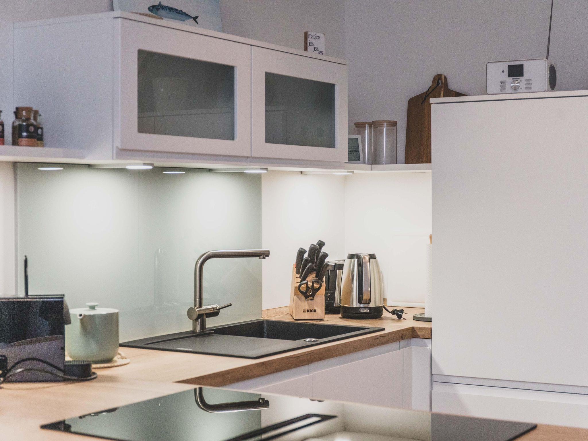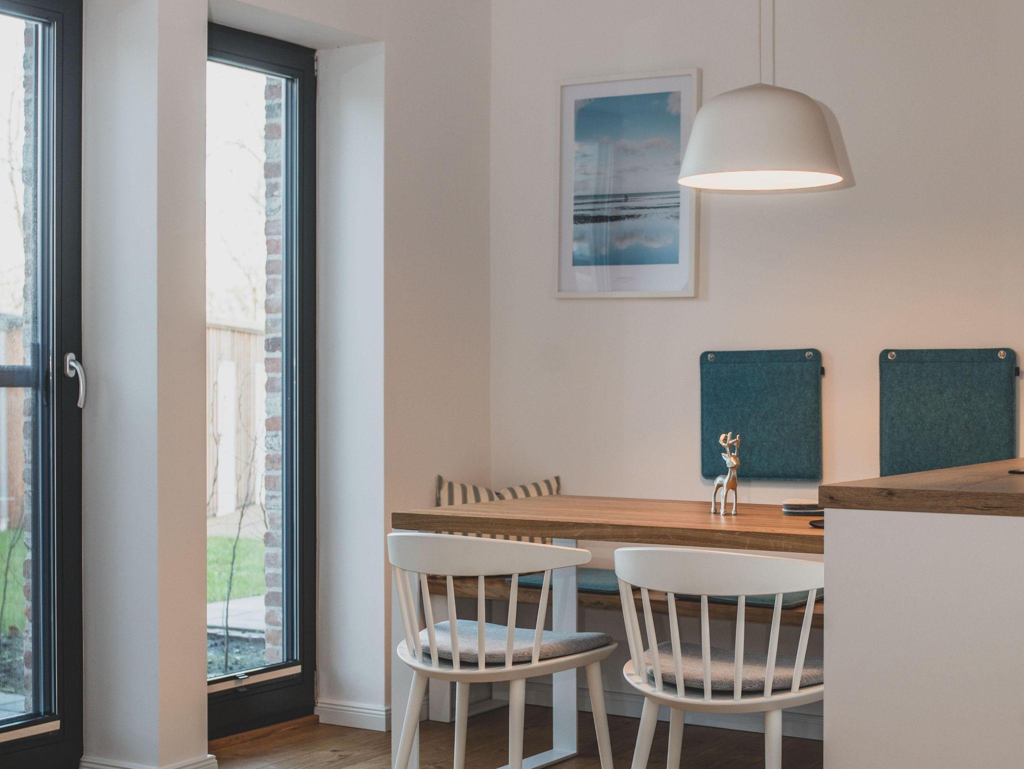 Freizeitköche freuen sich über die umfangreich ausgestattete Küche mit Bora-Kochfeld, hoch eingebautem Backofen, Mikrowelle, Geschirrspüler und Kühlschrank. Startet euren Tag mit einer Tasse heißen Ostfriesentee oder einem Espresso aus der Nespresso-Maschine auf der gemütlichen Bank im Essbereich mit Blick auf die Terrasse und ins Grüne.