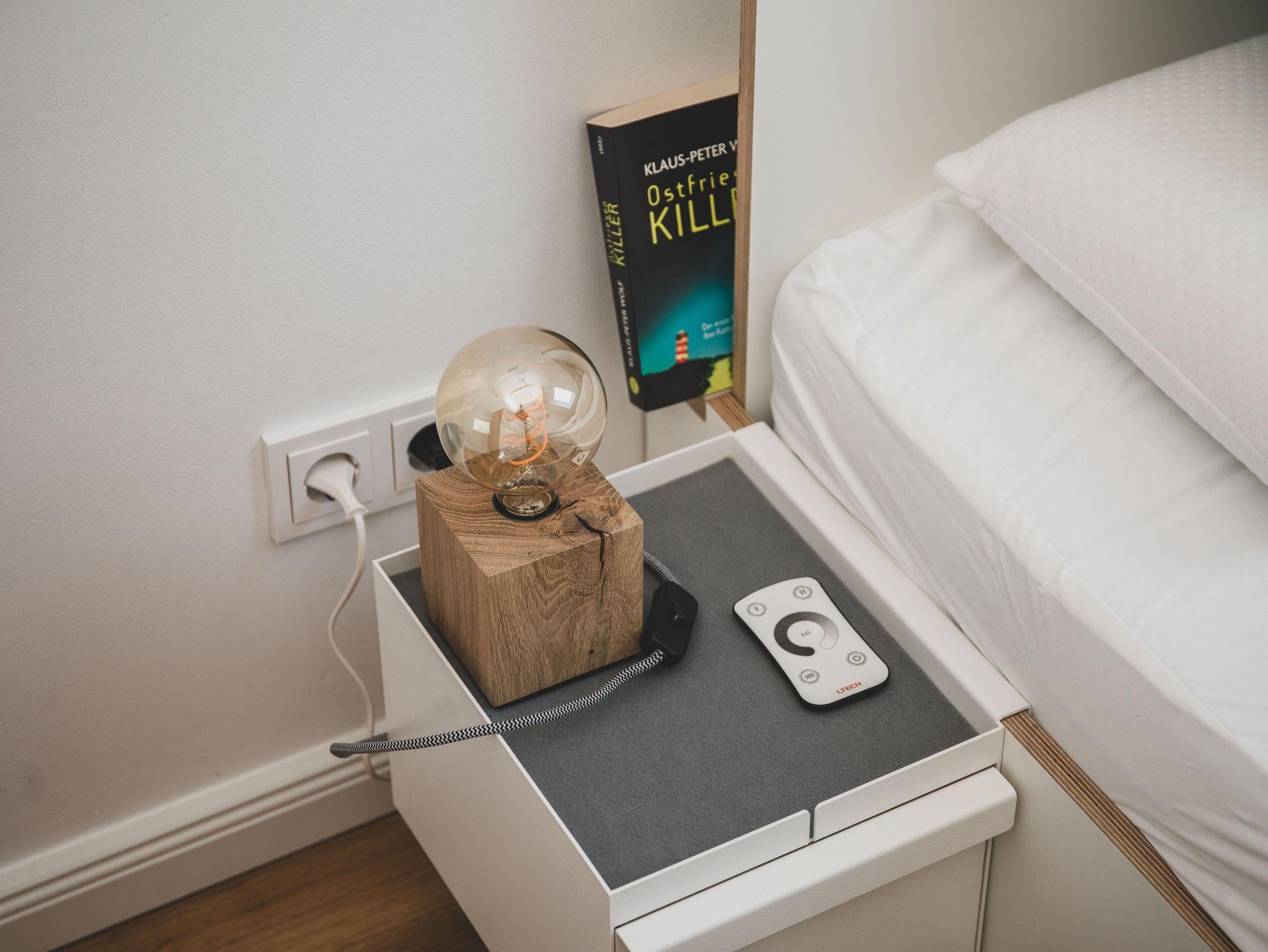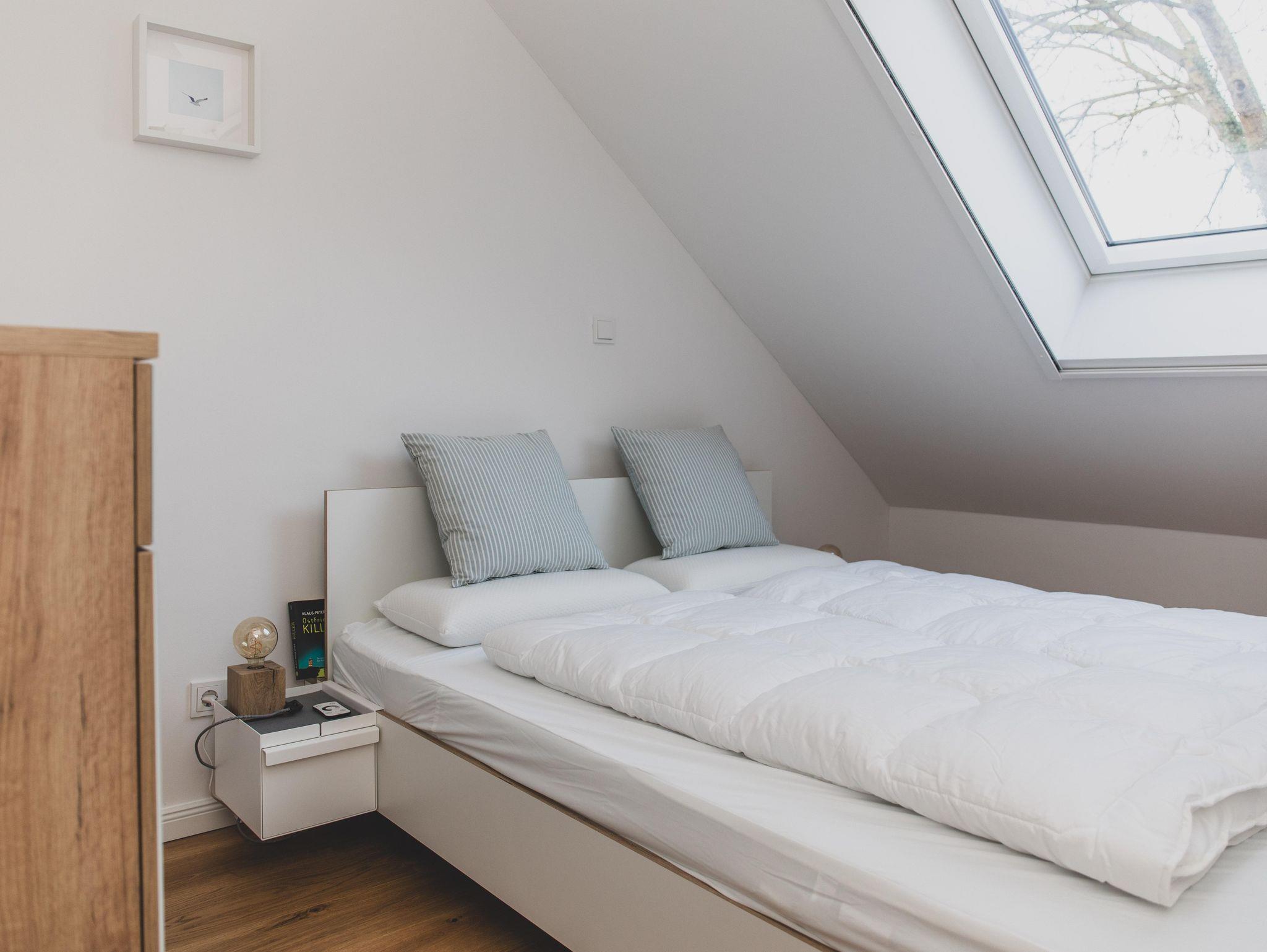 Im Schlafzimmer I befindet sich ein Doppelbett (1,60 m x 2,00 m) mit zwei unterschiedlich harten Matratzen sowie eine Kommode. Stimmungsvolles Licht bietet die Unterbeleuchtung des Bettes, welche ihr bequem über eine Fernbedienung steuern könnt. Oder ihr beobachtet einfach die Sterne durch das große Dachfenster.
