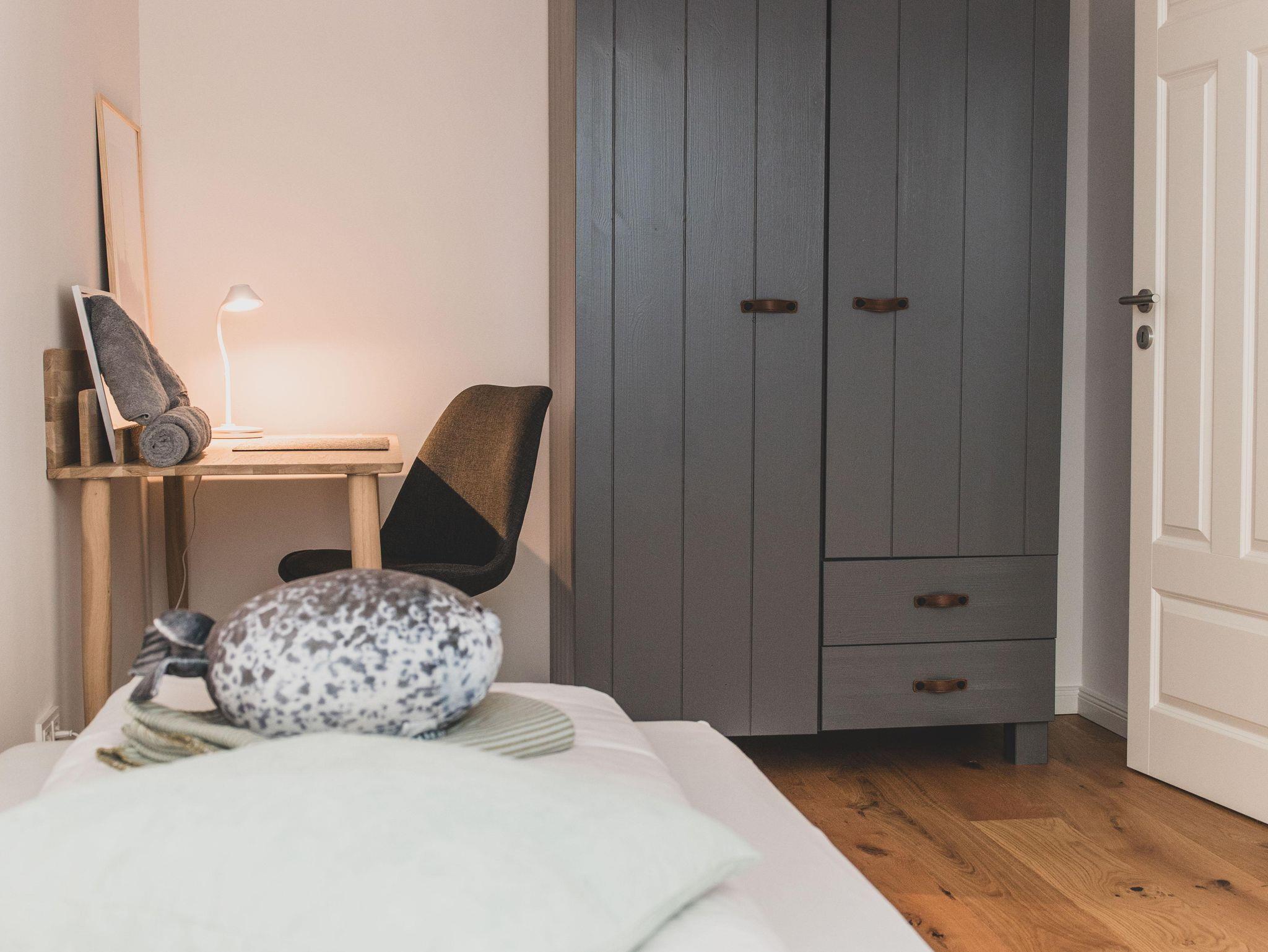 Ein großer Kleiderschrank bietet ausreichend Stauraum.