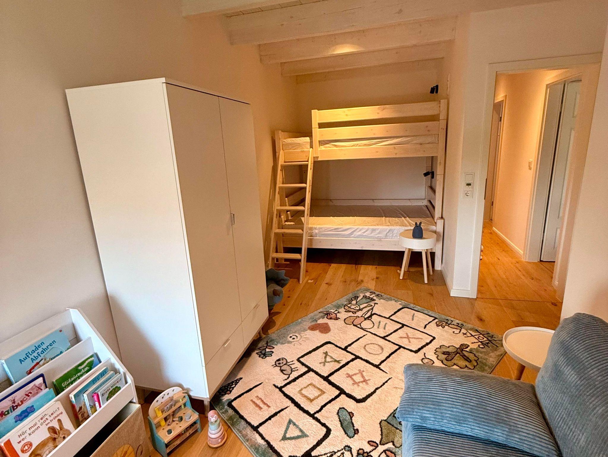 Eines davon mit einem Doppelbett (180x200) einem großen Kleiderschrank und einem Schreibtisch, welcher zum mobilen arbeiten einlädt, ein weiteres als Kinderzimmer gestaltet, mit einem großen Doppelstockbett (untere Etage 140x190/ obere Etage 120x190) sowie ein gemütliches Klappsofa mit umklappbarer Rücklehne (140x190), das sich mit wenigen Handgriffen in ein Doppelbett verwandeln lässt. In diesem Raum befindet sich ebenfalls ein Kleiderschrank und allerlei Dinge, die Kinderaugen strahlen lassen.