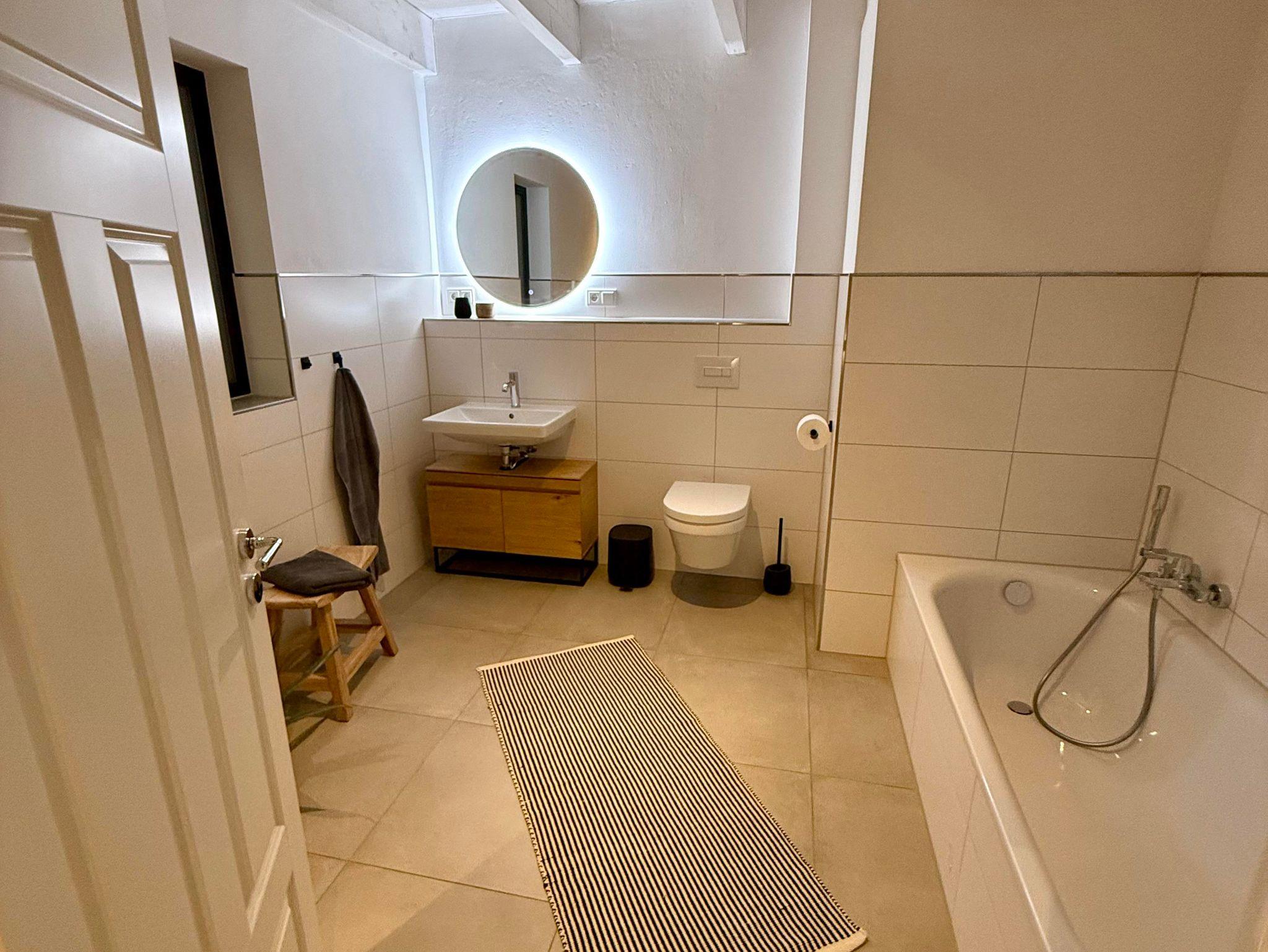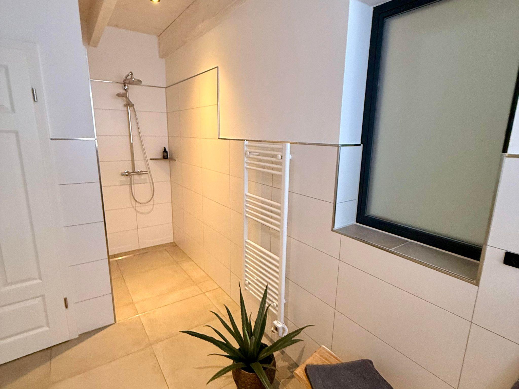 Des Weiteren findet sich in dieser Etage – mit Fenster zum Scheunenatrium – ein großes Badezimmer mit großzügiger, ebenerdig begehbarer Dusche und eine separate Badewanne.