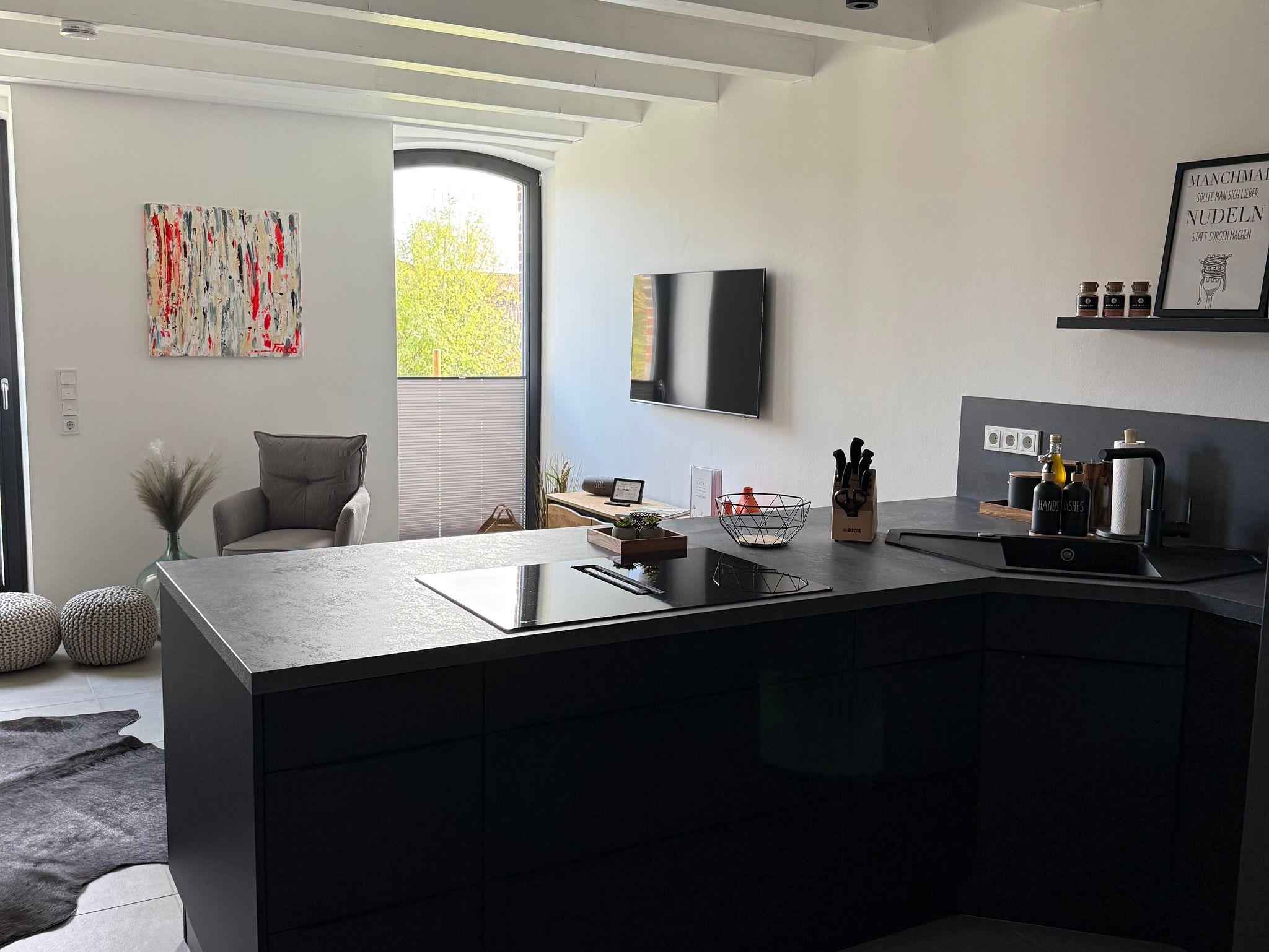 Die Wohnung erstreckt sich über 2 Ebenen. Im offen gestalteten Erdgeschoss werden sich Kochliebhaber über eine voll ausgestattete große und moderne U-Küche, einen großen Essbereich mit rustikalem Esstisch und einen gemütlichen Wohnbereich mit einem 50 Zoll Smart-TV, der über alle gewünschten Streaming Dienste verfügt, sowie einer JBL Musikbox, freuen.