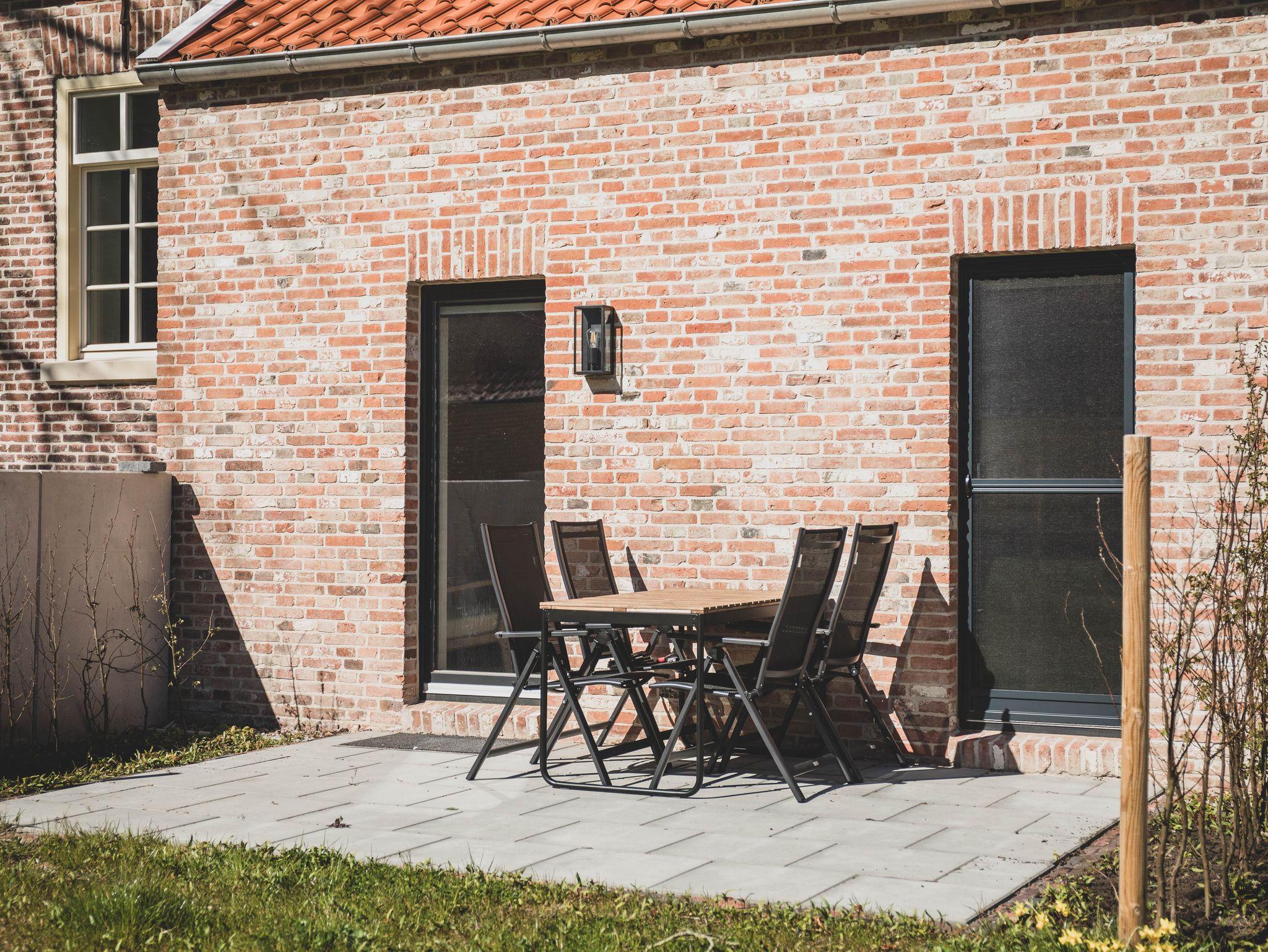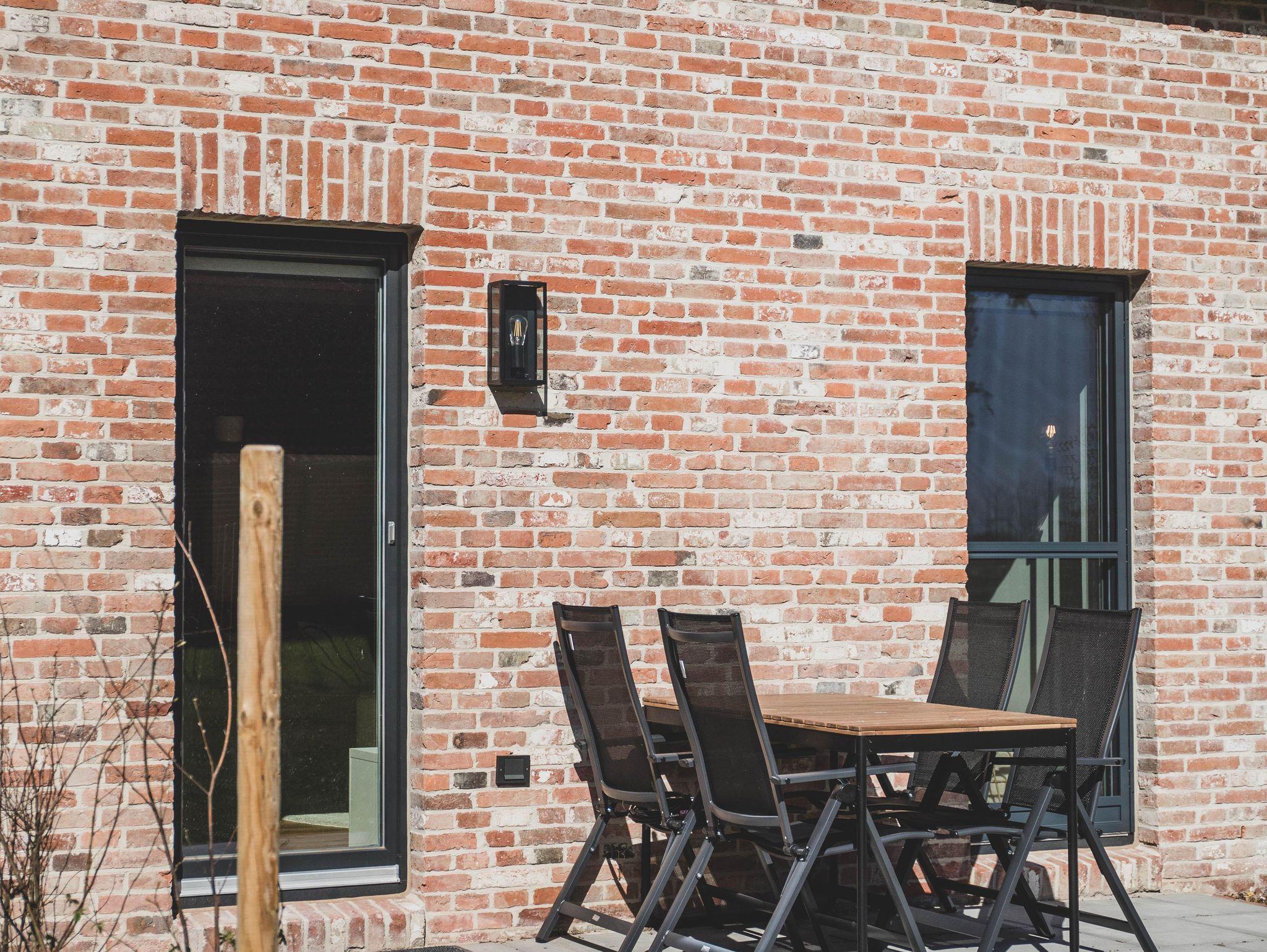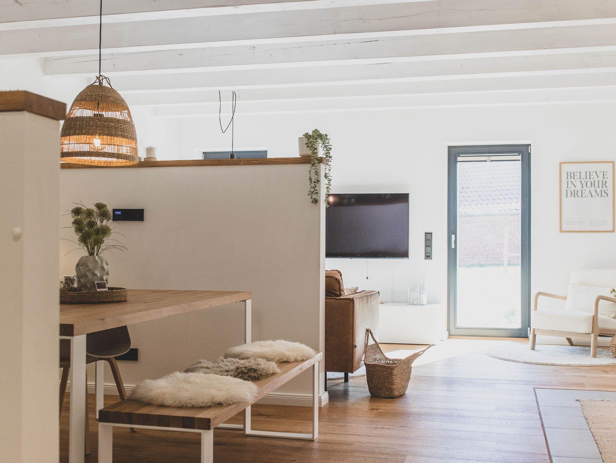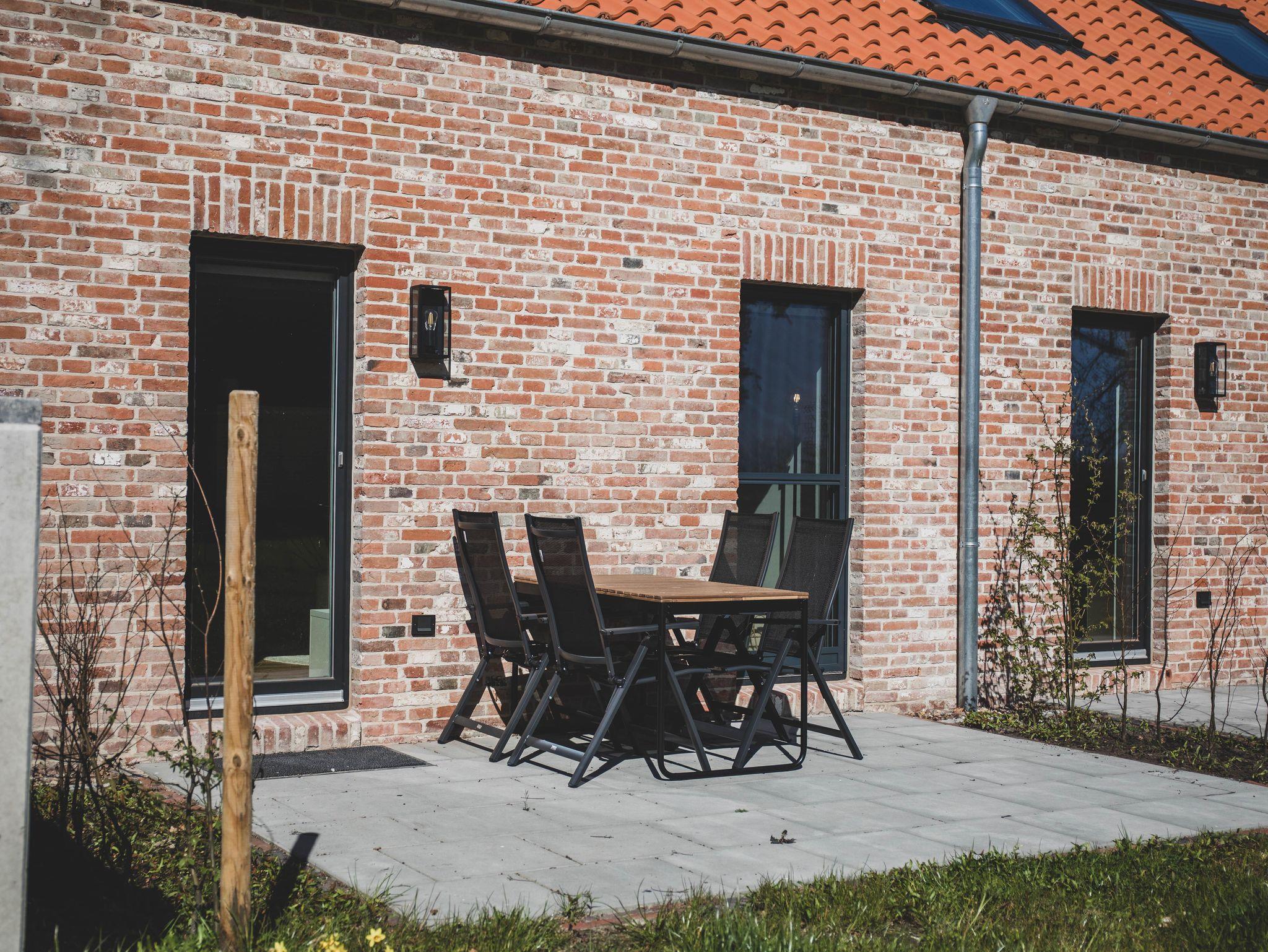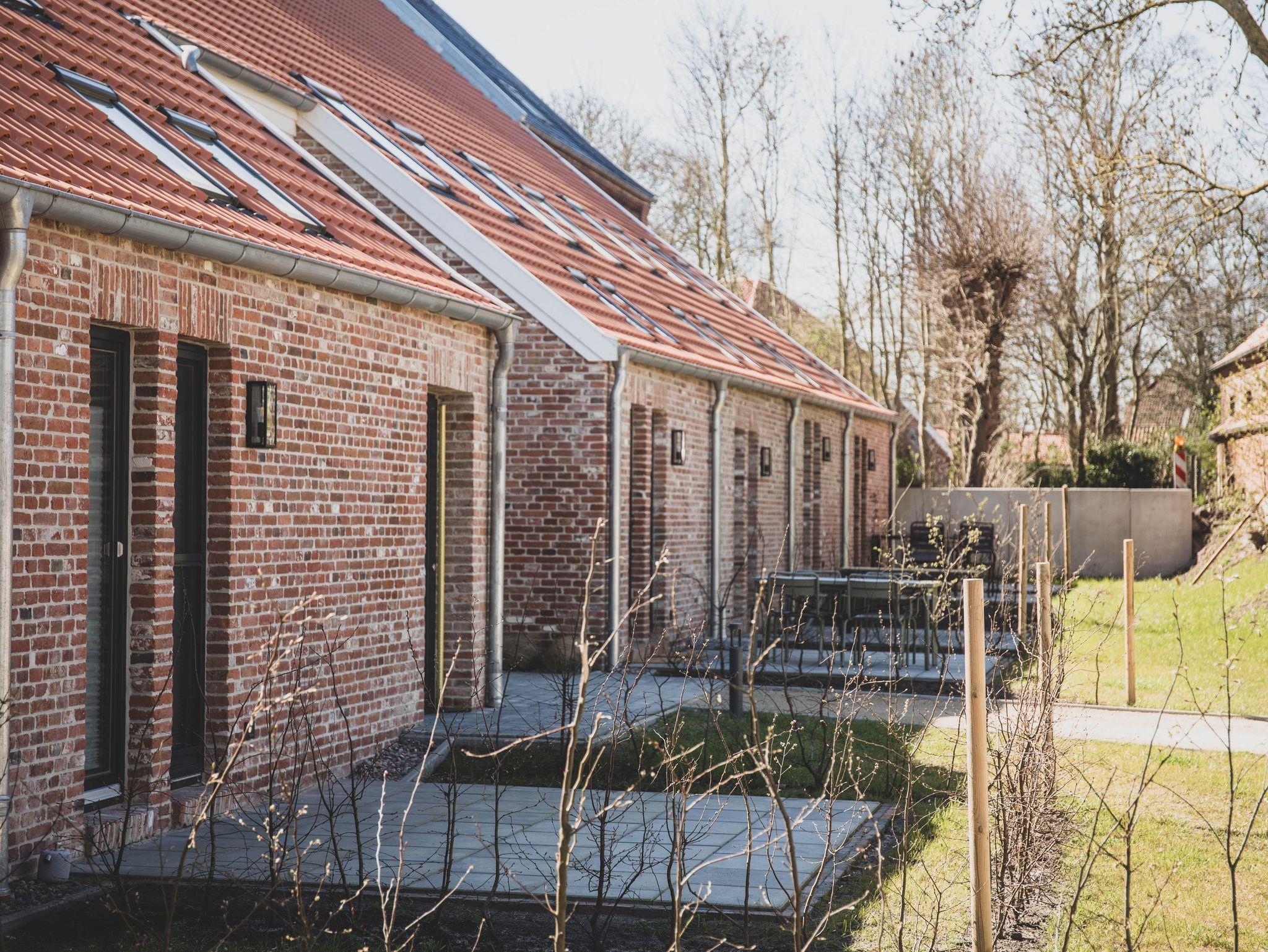 Alle Wohnungen sind Maisonette und zeichnen sich durch moderne, Grundrisse aus. Durch die Einbeziehung des historischen Ständerfachwerks in die Wohnraumgestaltung erhalten die Einheiten zudem eine besondere, unverwechselbare Note. Fußbodenheizung, Echtholz-Parkettböden sowie Armaturen und Keramik namhafter Hersteller versprechen einen hohen Wohnkomfort. Zu jeder Wohnung gehört eine großzügige Terrasse sowie ein PKW-Stellplatz mit Abstellschuppen. Die Außenanlagen des rund 4000 qm großen Grundstücks zeichnen sich besonders an der Südseite und Ostseite durch großzügige Grünflächen aus, die mit Sträuchern und Hecken geschmackvoll angelegt wurden. Ein alter Baumbestand rundet das Gesamtbild ab.