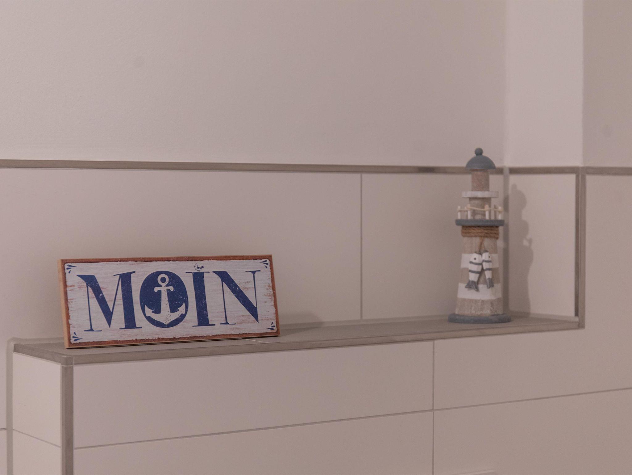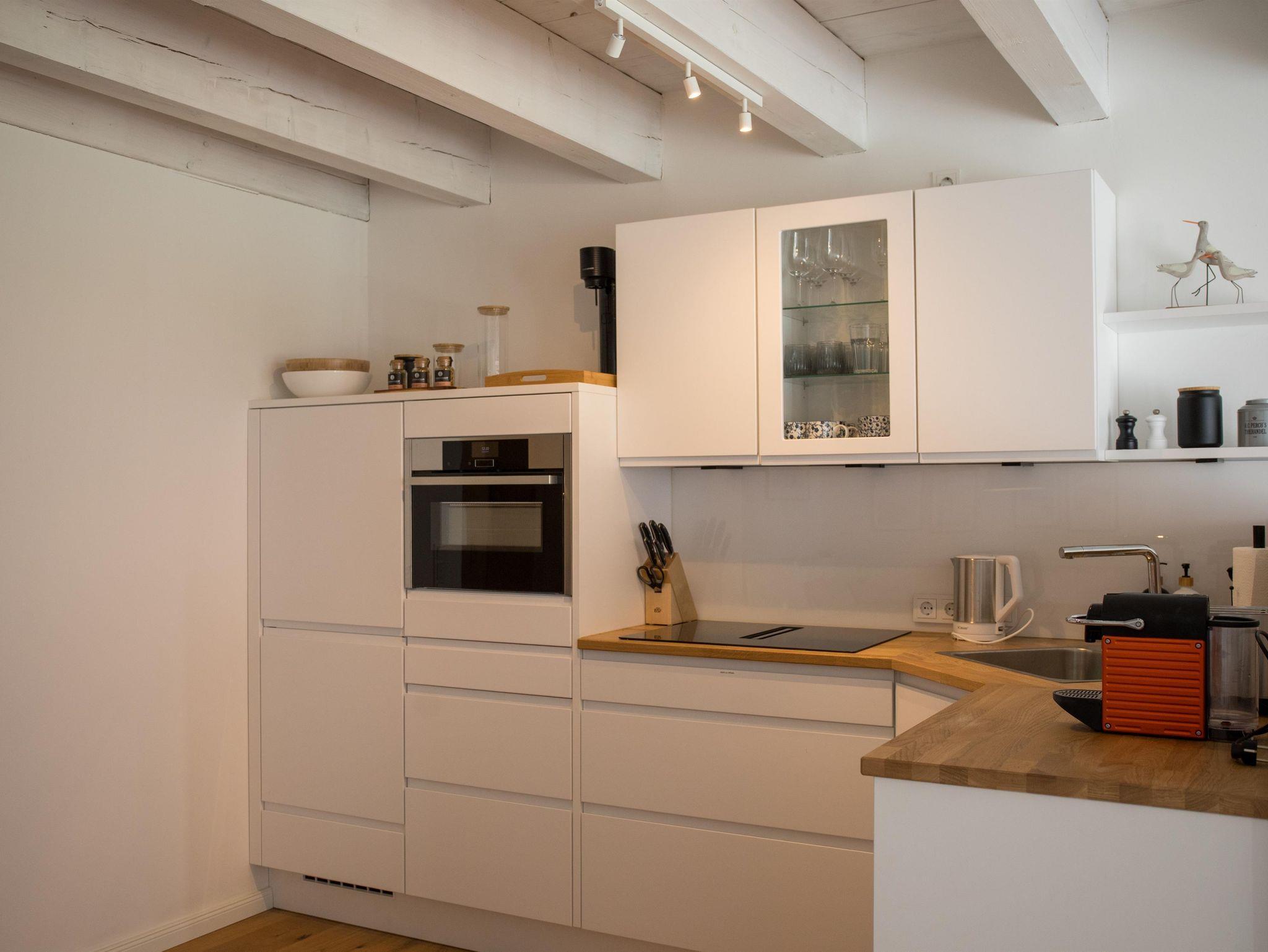 Bereits beim Betreten der Wohnung empfängt Sie ein heller Flur mit Gäste-WC im Erdgeschoss. Herzstück ist die großzügige Wohnküche mit drei großen Fenstern, die den Raum in freundliches Licht tauchen und den Blick auf die Terrasse und die weite ostfriesische Landschaft freigeben. Die Küche ist vollständig ausgestattet – mit Induktionsherd, Mikrowellen-Ofen-Kombi, Kühlschrank, Spülmaschine, Nespresso-Maschine, Toaster, Wasserkocher und Wassersprudler – hier fehlt es an nichts. Die gemütliche Essecke mit Eckbank bietet Platz für bis zu 7 Personen – ideal für gesellige Abende mit Familie oder Freunden.