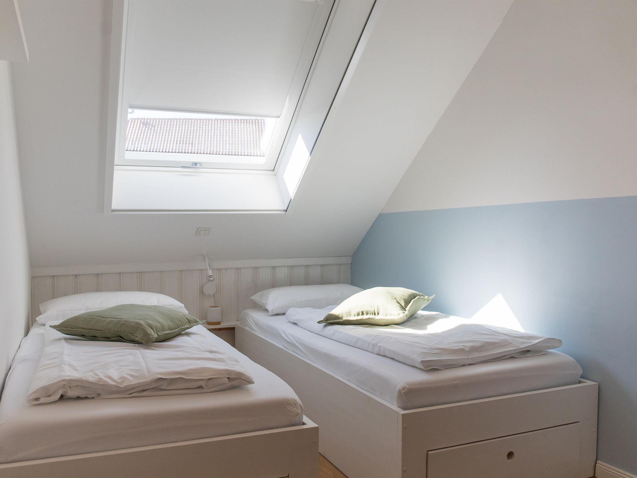 Über eine Holztreppe gelangen Sie ins Obergeschoss, wo sich zwei liebevoll eingerichtete Schlafzimmer befinden. Das Elternschlafzimmer ist mit einem besonders langen Doppelbett (180x210 cm) mit komfortablen Matratzen in zwei Härtegraden (H2 und H3), einem geräumigen Kleiderschrank und einem Hoteltresor ausgestattet. Im zweiten Schlafzimmer erwarten Sie drei Einzelbetten (90x200 cm) – eines davon als gemütliche Schlafkoje unter dem historischen Gebälk, die der Wohnung ihren Namen „Bütz“ gibt. Eine schöne weiße Kommode sorgt für Stauraum, der zugehörige Kleiderschrank befindet sich im Flur. Beide Schlafzimmer verfügen über Verdunklungs- und Insektenschutzrollos, sodass einem erholsamen Schlaf nichts im Wege steht. Desweiteren sind alle zugänglichen Steckdosen in der Ferienwohnung mit einem integrierten Kinderschutz ausgestattet.