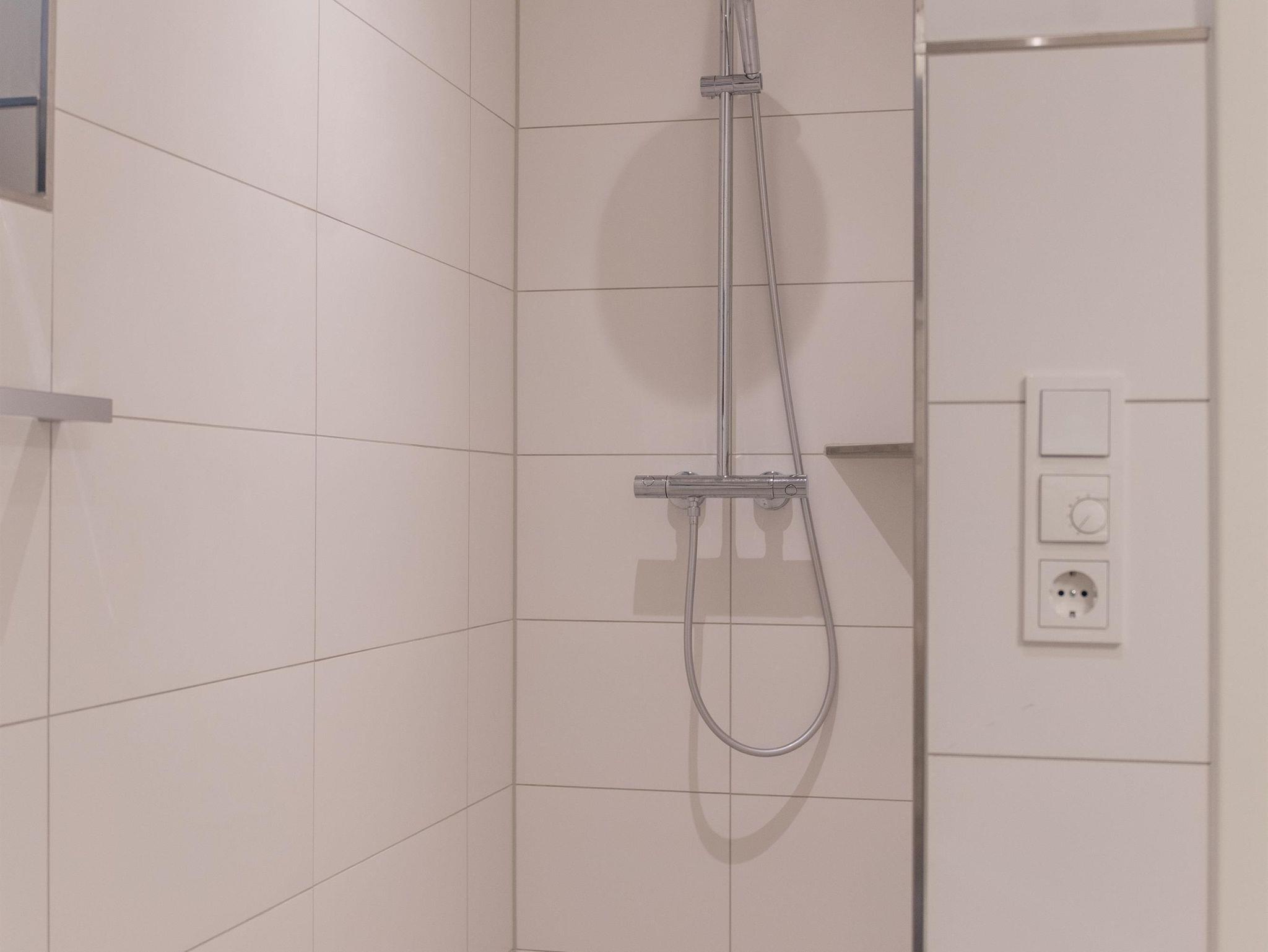 Das moderne Badezimmer im Obergeschoss bietet mit seiner bodengleichen Raindance-Dusche, einem stilvollen Waschtisch, WC und Handtuchheizung höchsten Komfort.