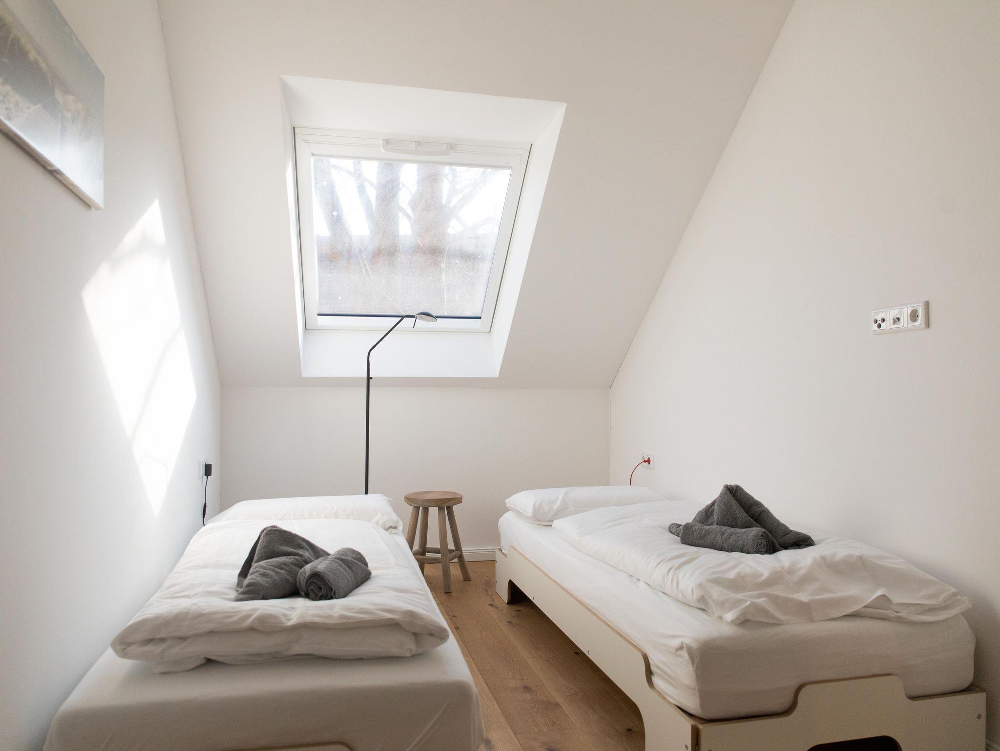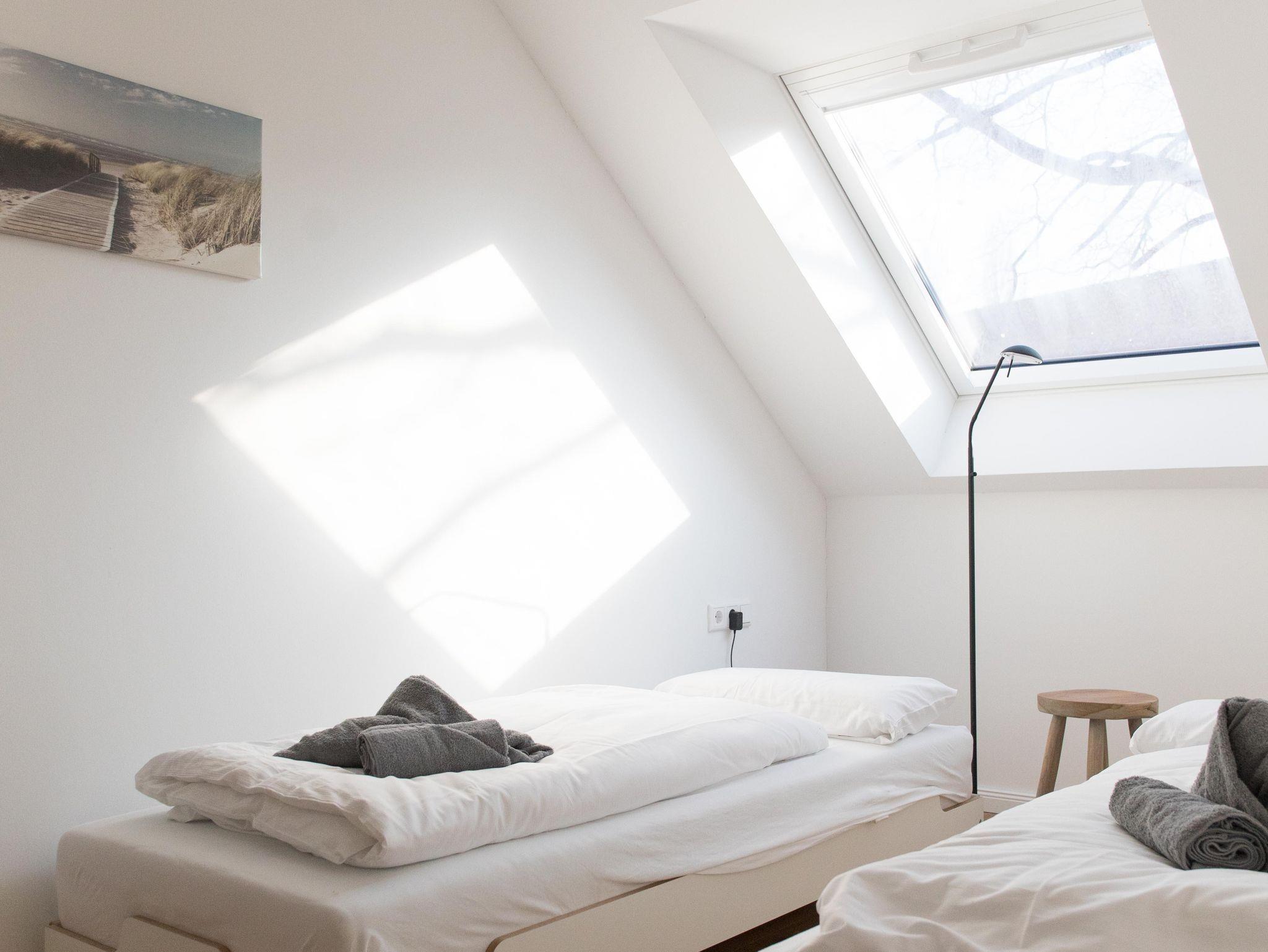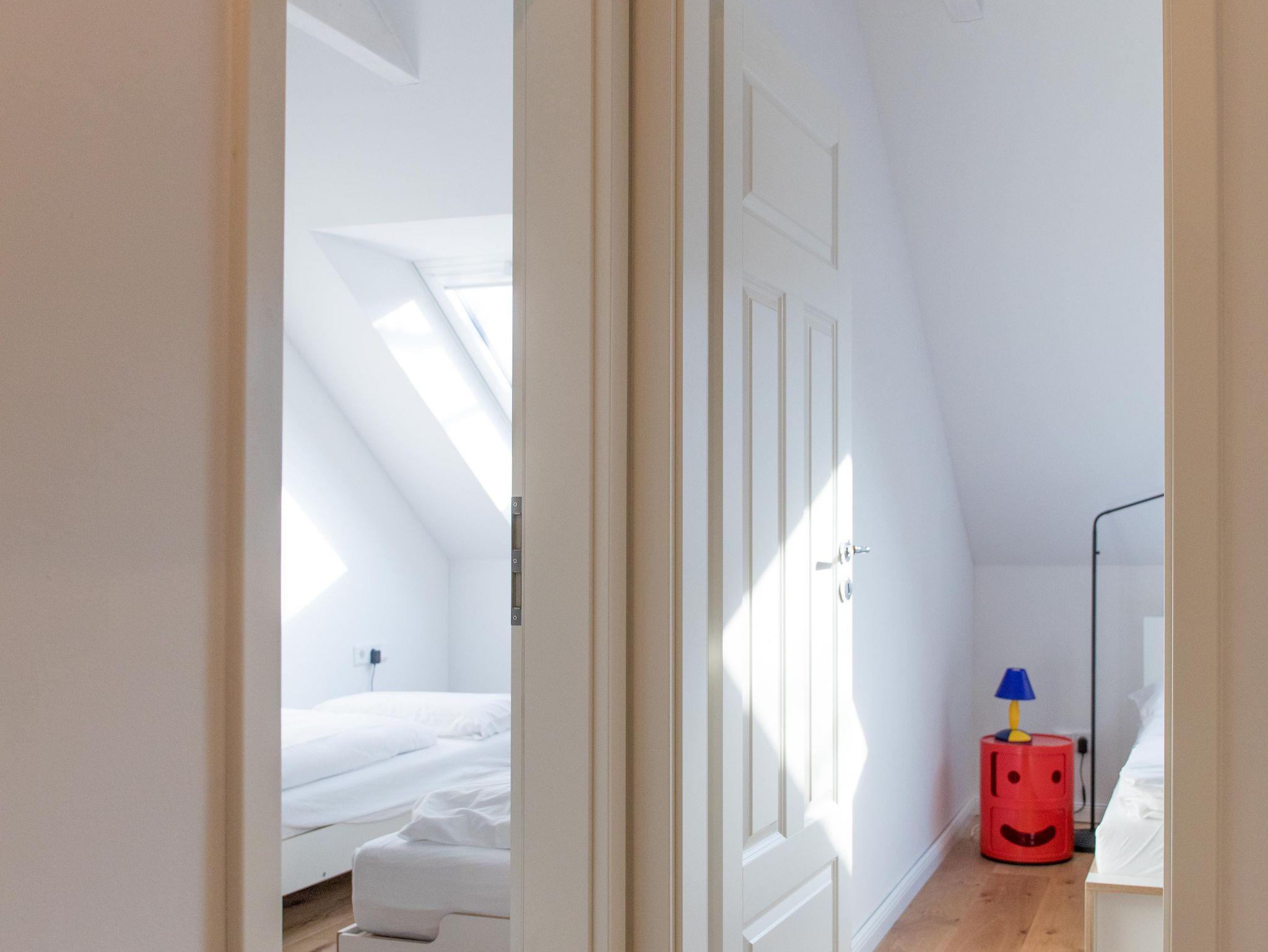 Im Dachgeschoss befinden sich 2 Schlafzimmer mit 1 Doppelbett und 2 Einzelbetten, 1 Kleiderständer und 1 Kleiderschrank im Flur. In beiden Schlafzimmern können die Fenster verdunkelt werden, Insektenschutzrollos bewahrt Sie vor lästigen Besuchern. Ein Kinderschutzgitter zur Treppe schützt Ihre Kleinen. Das Bad verfügt über eine bodengleiche Dusche, Haartrockner und Kosmetikspiegel.