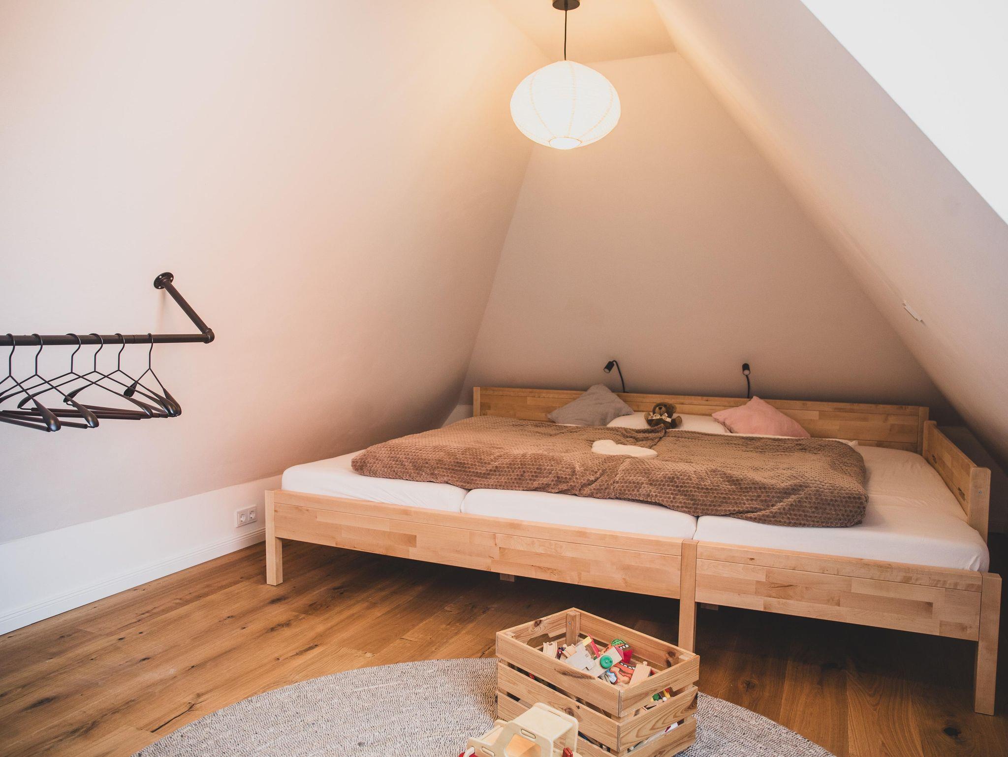 Das erste Schlafzimmer begeistert mit einem echten Highlight: dem riesigen Familienbett (2,70 m breit) – perfekt, um gemeinsam zu kuscheln, zu lesen oder einfach auszuschlafen.